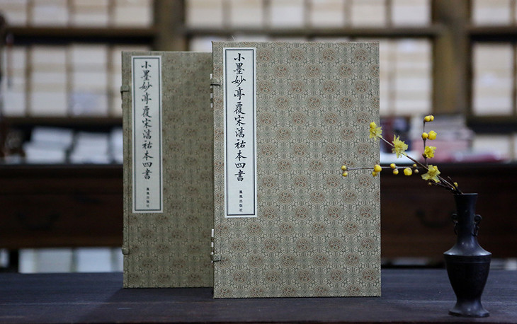 从乙未年开始,扬州古椿阁以传承祖国儒家传统文化为己任,积极策划最好的四书版本,联合凤凰出版社(原江苏古籍出版社)历时三年终于完成《小墨妙亭覆宋淳佑本四书》的出版,这套书分二函十四册,是民国十五年(1926)晚清学者孙多巘覆刻内府宋淳佑本四书而成,此书纸白如玉,开本阔大,字大如钱,书法遒劲,为民国时期之精刊。卷前有孟子序说,书后附有《宋淳佑本四书考异》一卷,为浙江永康胡宗懋取监本与内府本互校后所撰。