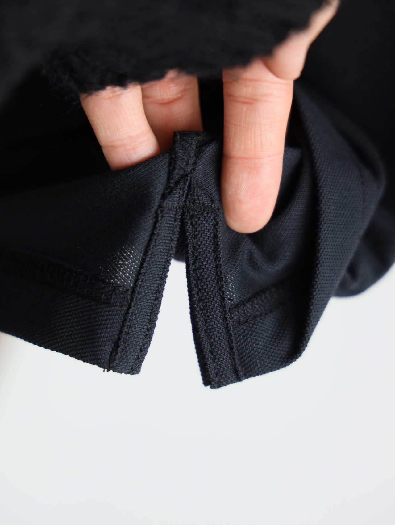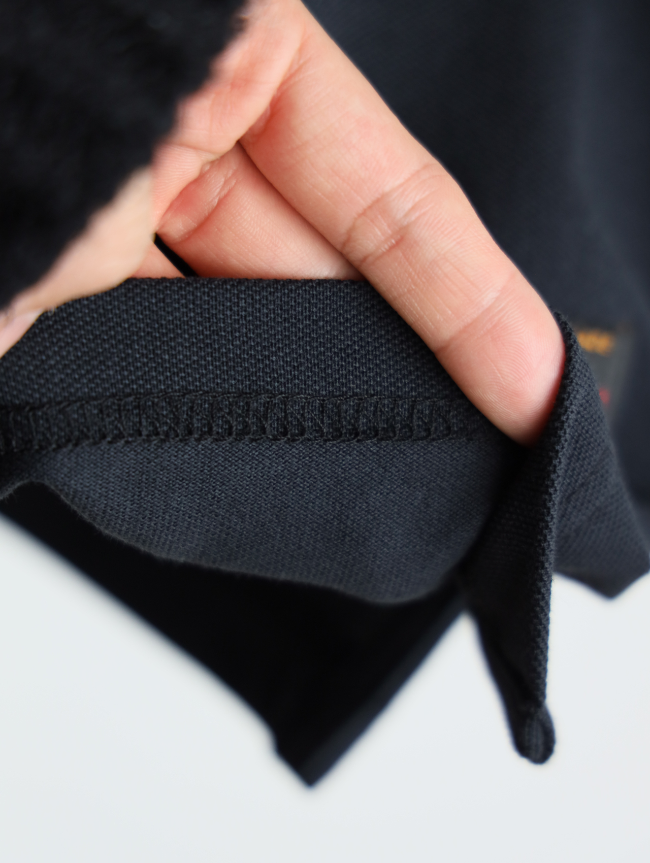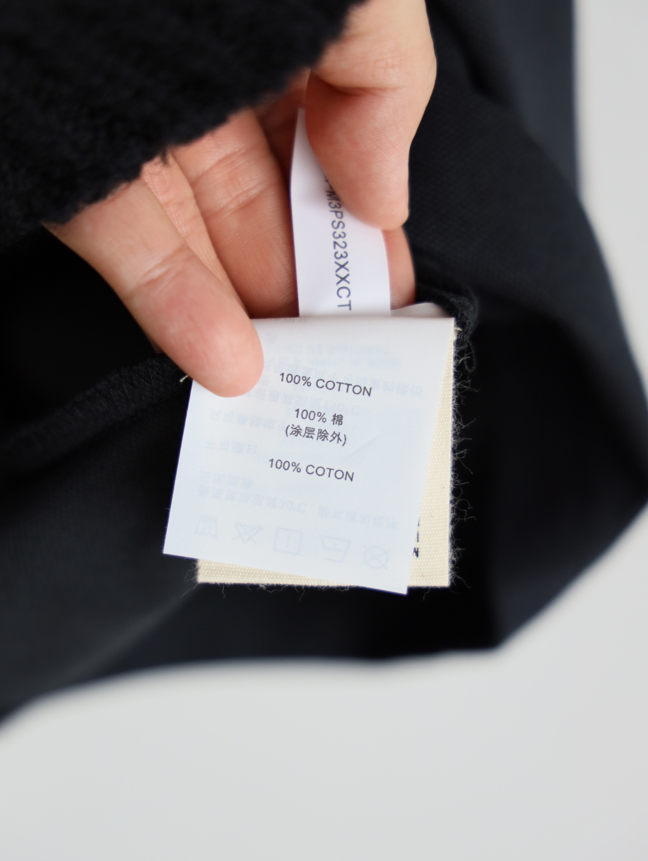 小开叉下摆,缝合套结加固。左侧下摆经典传统定制标签