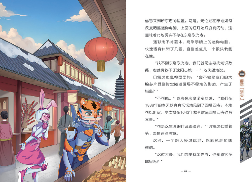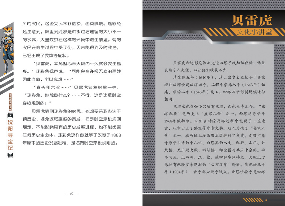 为了恢复被删除的古城知识数据,贝雷虎和迷彩兔这次来到了古代享有;盛京美誉的沈阳,不仅见证了沈阳古城的历史变迁,感受到了清王朝初期沈阳故宫的气派繁华,还饱览了沈阳古城的自然和人文景观,了解了当地的民俗文化。当然,贝雷虎和迷彩兔还与杰克狼、安迪蛇展开了精彩有趣的智斗。他们能成功寻回沈阳古城的知识数据吗一朝发祥地,两代帝王都。在本书中,贝雷虎将带领小读者一起完成以下遗落在沈阳古城知识数据的寻回任务:清初沈阳城布局形制,盛京九门,四平商业街;满族民俗文化;沈阳故宫,龙虎宝剑;奉天四塔,沈阳浑河,沈阳长安寺,沈阳钟鼓楼,国宝盛京金钟,凤凰楼,紫气东来匾;皇太极,清军入关,八旗制度等历史背景。全书内容情节丰富,跌宕起伏,充满想象力、科幻感和趣味性,能够引起小读者强烈的阅读兴趣。