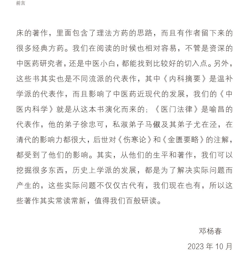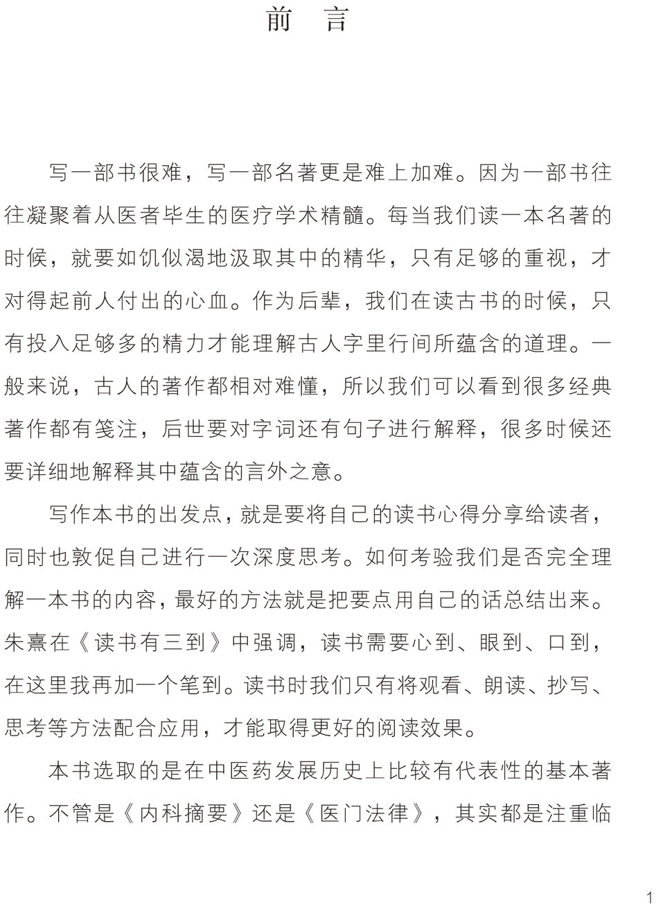 写作本书的出发点,就是要将自己的读书心得分享给读者,同时也敦促自己进行一次深度思考。本书选取的是在中医药发展历史上比较有代表性的五本著作,包括《内科摘要》《儒门事亲》《医门法律》《竹泉生女科集要》《幼幼新书》。不管是《内科摘要》还是《医门法律》,其实都是注重临床的著作,里面包含了理法方药的思路,而且有作者留下来的很多经典方药。我们在阅读的时候也相对容易,不管是资深的中医药研究者,还是中医小白,都能找到比较好的切入点。另外,这些书其实也是不同流派的代表作,其中《内科摘要》是温补学派的代表作,而且影响了中医药近现代的发展,我们的《中医内科学》就是从这本书演化而来的;《医门法律》是喻昌的代表作,他的弟子徐忠可,私淑弟子马俶及其弟子尤在泾,在清代的影响力都很大,后世对《伤寒论》和《金匮要略》的注解,都受到了他们的影响。其实,从他们的生平和著作,我们可以挖掘很多东西,历史上学派的发展,都是为了解决实际问题而产生的,这些实际问题不仅仅古代有,我们现在也有,所以这些著作其实常读常新,值得我们百般研读。
