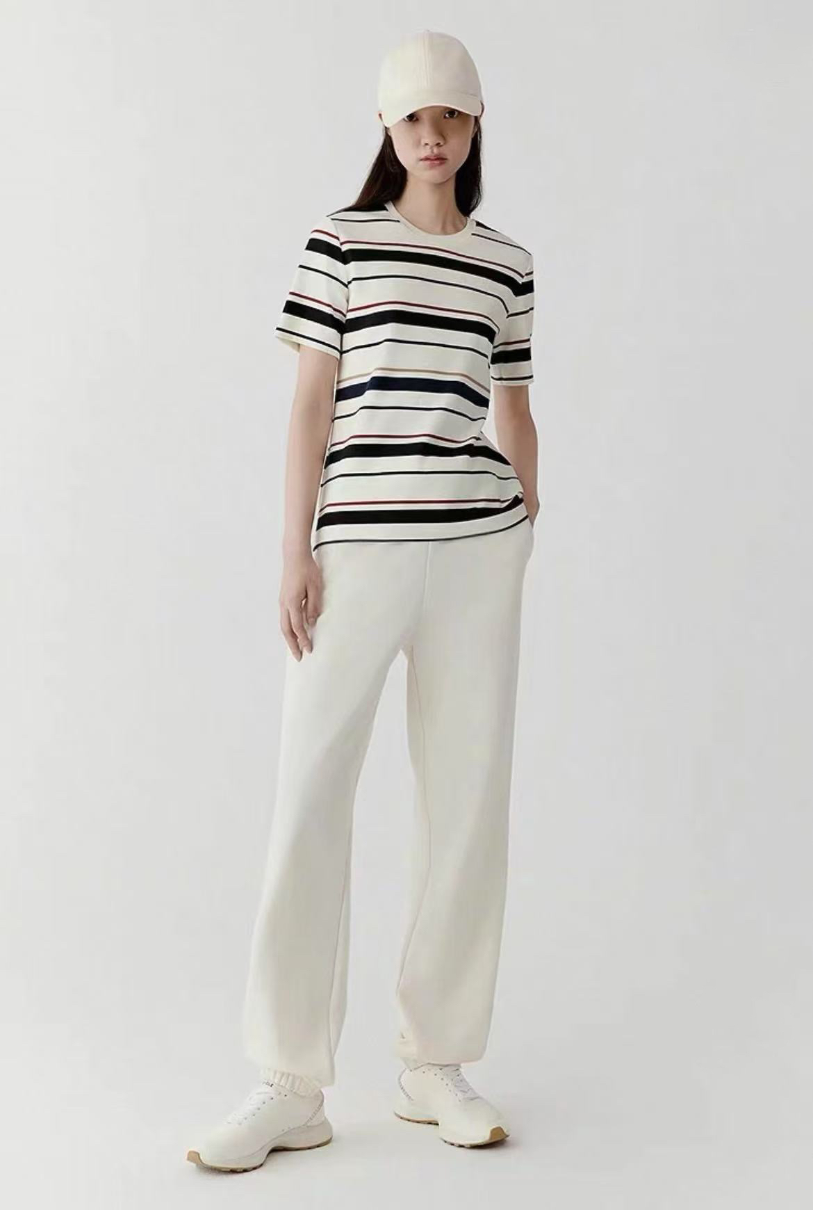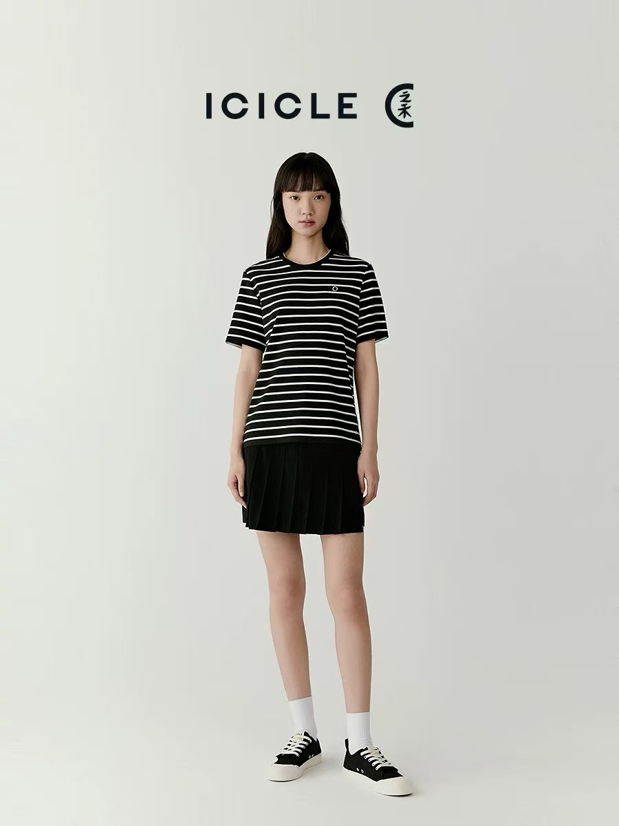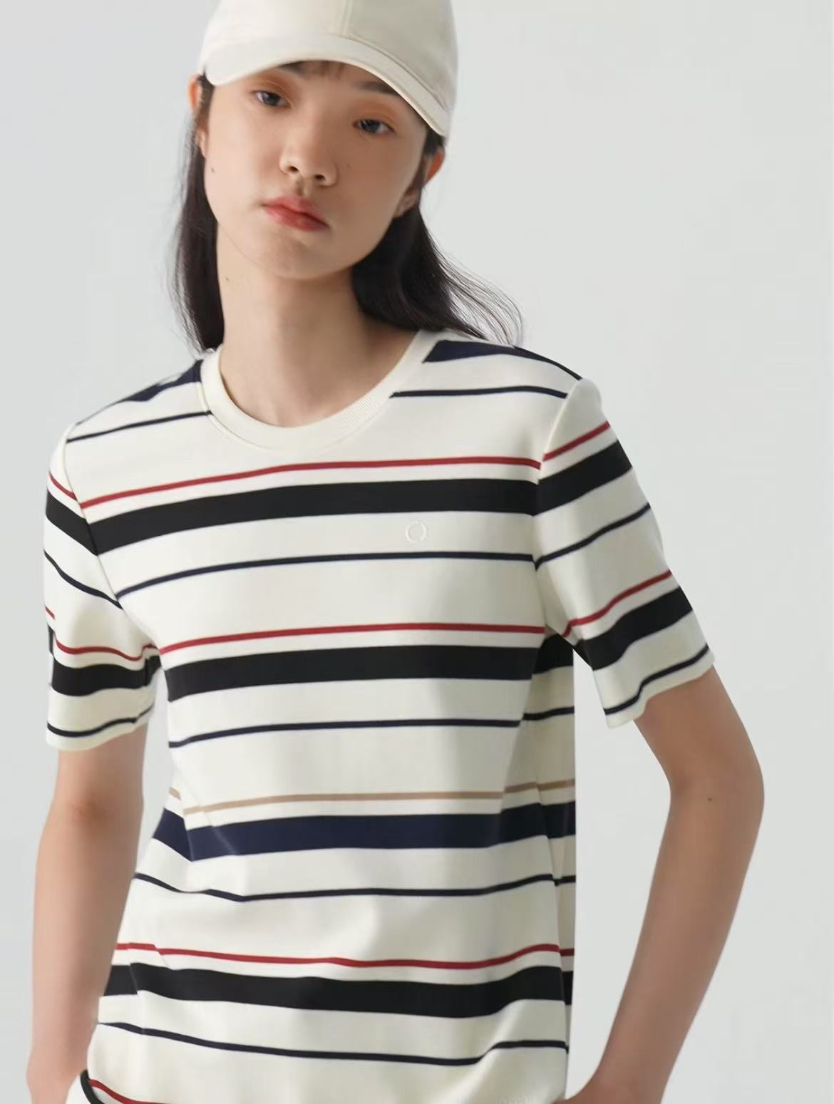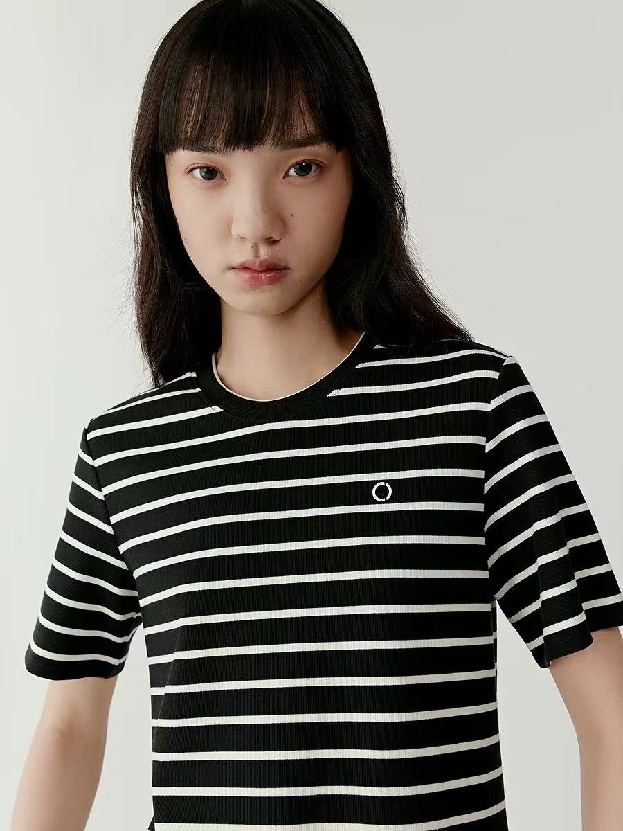 IC之禾 极简黑白条纹撞色百搭 圆领棉弹螺纹撞色短袖T恤