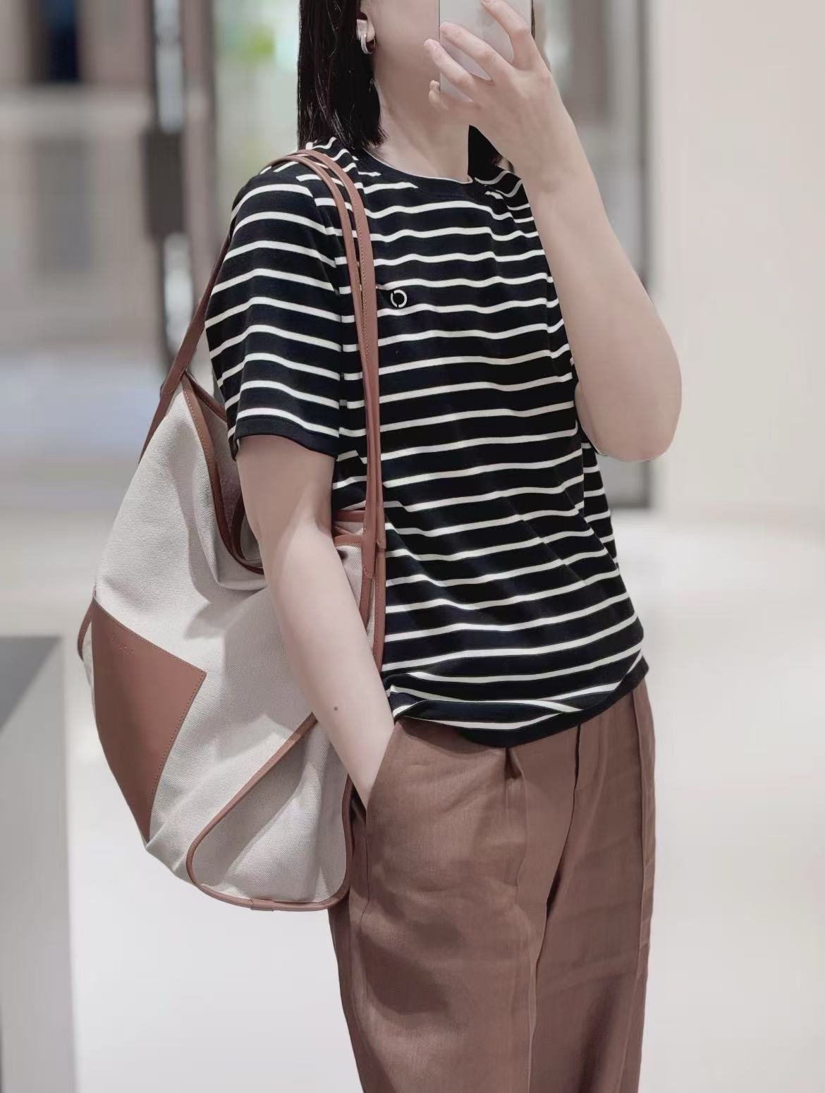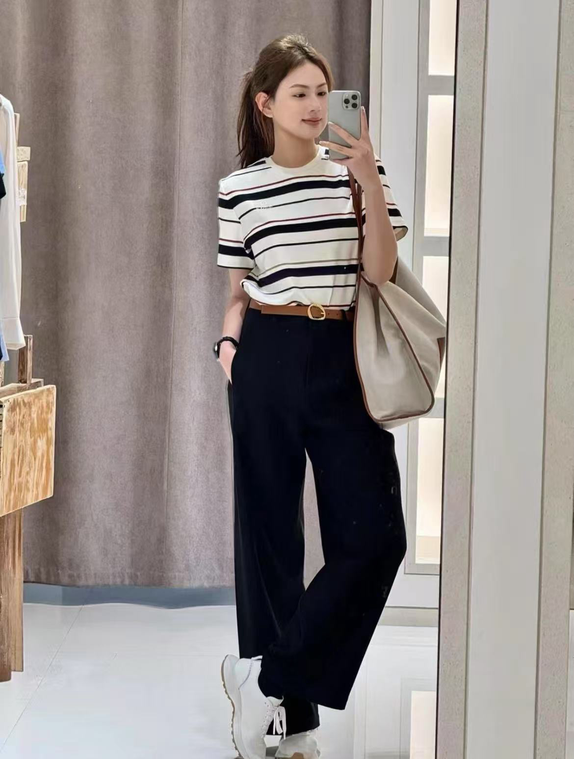 不费力通勤出街穿搭,领口处撞色跟衣身不规则条纹呼应,整体奶咖的配色,上身自带温柔感