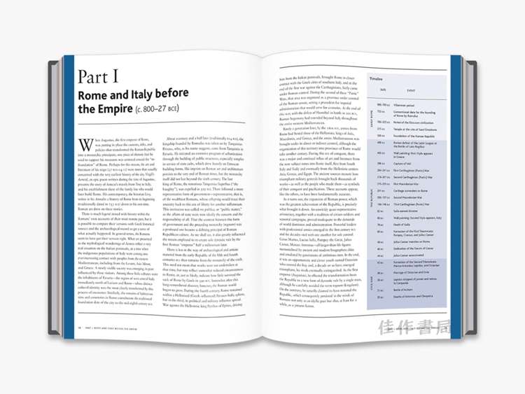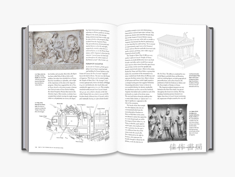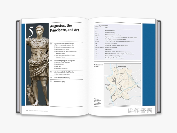 Each of the book’s four parts opens with a timeline and historical overview, allowing the reader to better understand how the art relates to the political and social lives of the people of ancient Rome. Individual chapters begin with a map of Rome, illustrating how the city changed over centuries of rebuilding and reimagining.