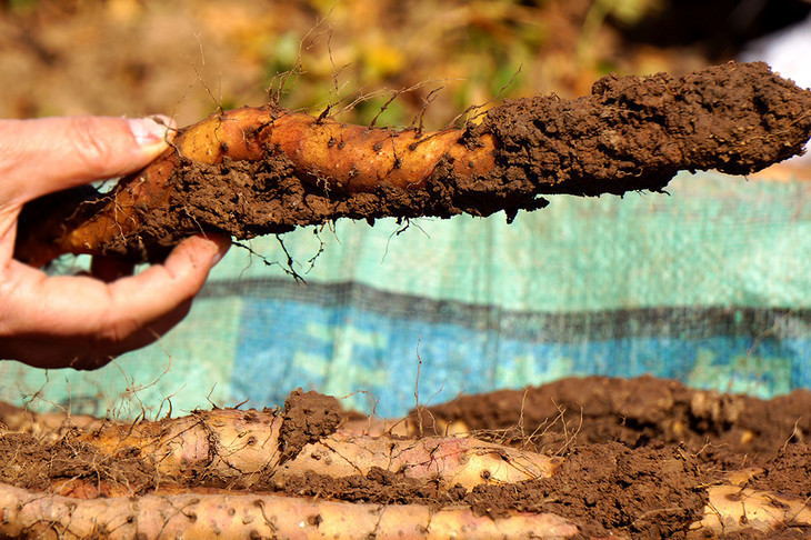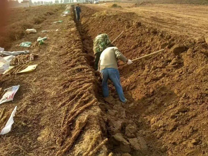 ▲收时,还要挖一米的深沟。而且要小心谨慎,不可碰伤到山药本体,碰伤的就不能销售了。