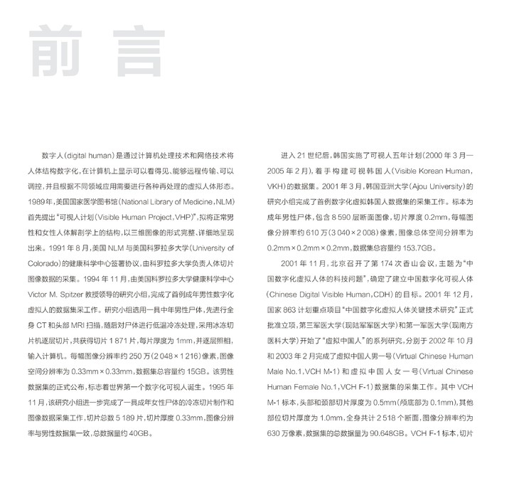 本书从数据集每隔1.2mm选取一幅图像,截取眼、耳、鼻及毗邻颅底的局部区域图像,共112幅图像。同时配以相应部位的CT图像对照。本书特色是断层解剖图利用数字图像处理技术优势,放大并清晰展示眼、耳、鼻及毗邻颅底断面的局部区域结构,组织色泽真实,甚至能够清晰显示肌肉纹理、筋膜纹路等细节结构,图像质量高于美国同类断层解剖彩色图的图像质量。对眼科、耳鼻咽喉科和神经内外科医生理解相关解剖结构有较大帮助。