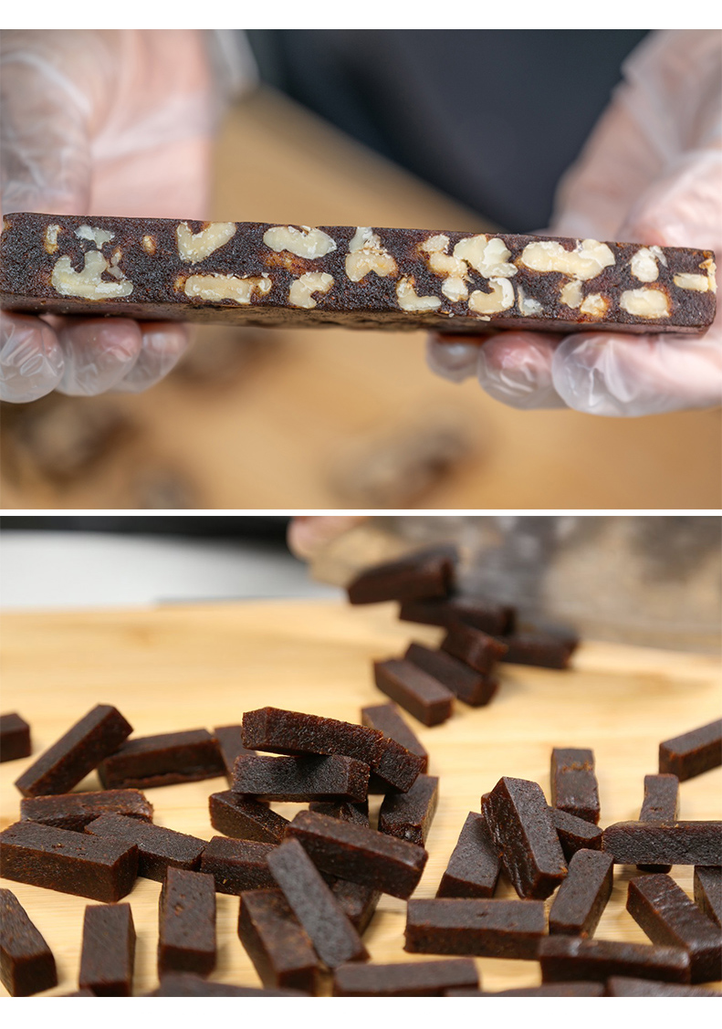 【配料表】:枣泥核桃糕(红枣55%,核桃40%,淀粉3%,黄油2%)