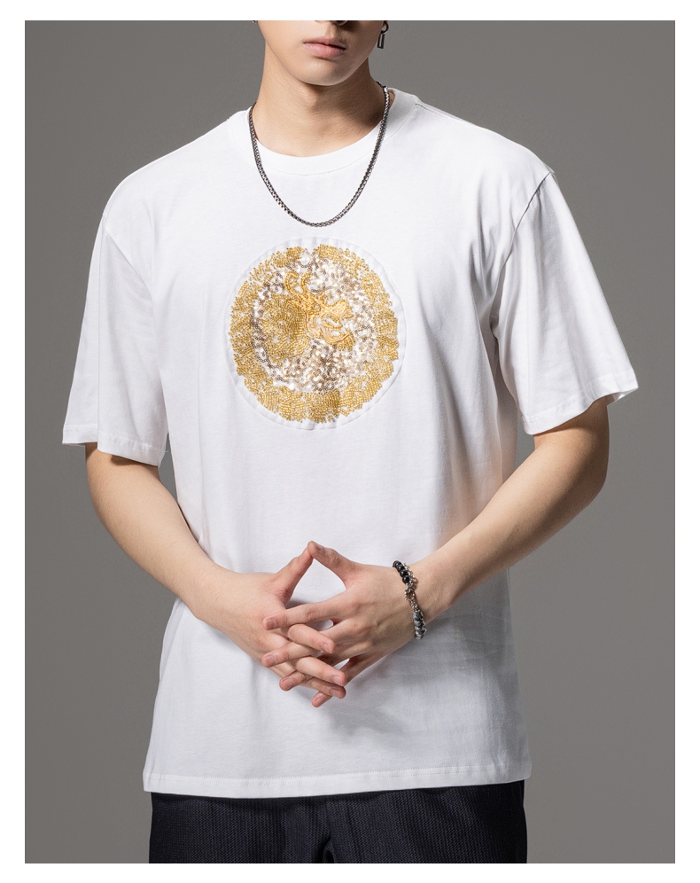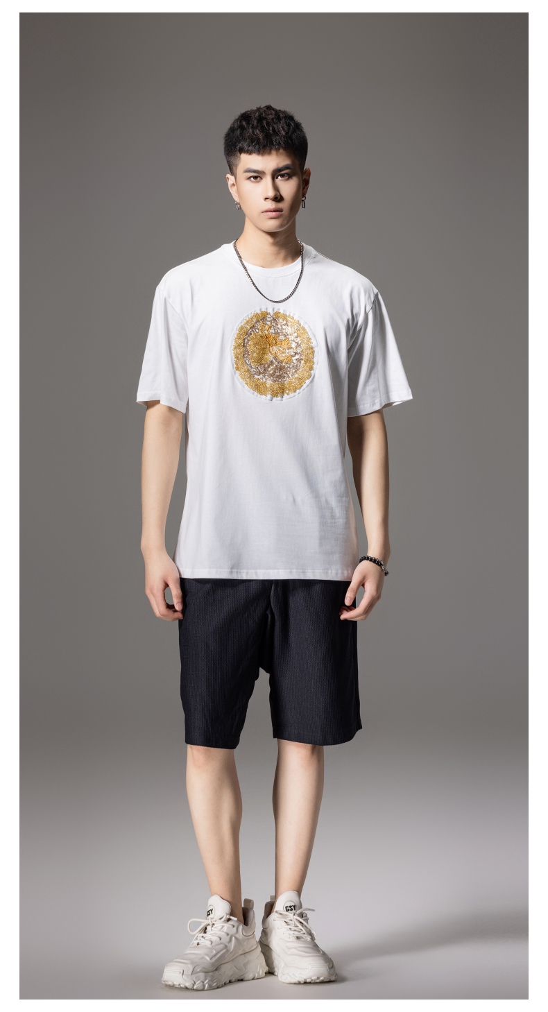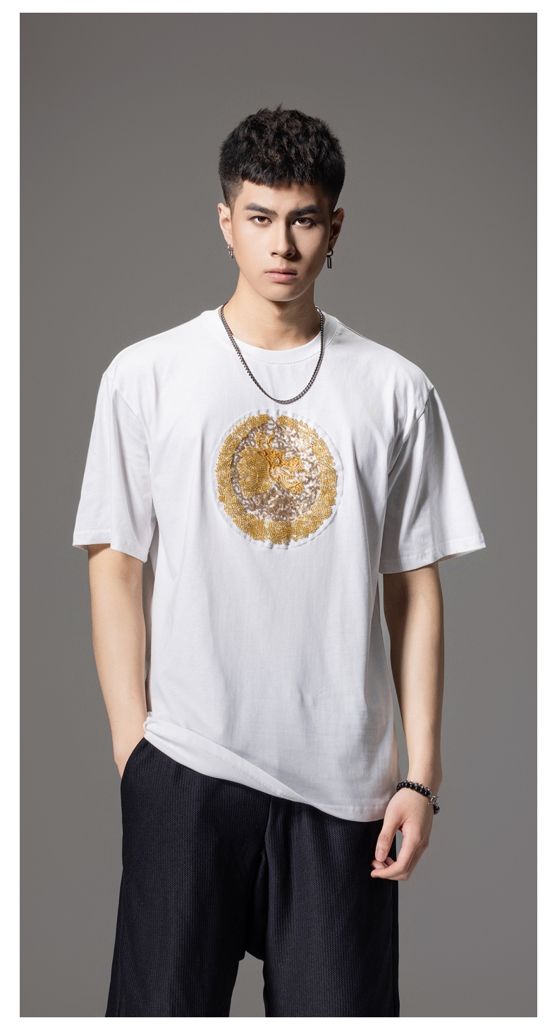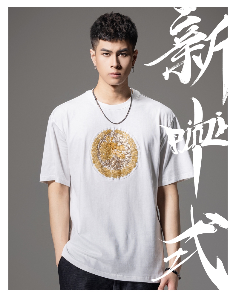 PINLI品立新中式2024夏季新款钉珠潮牌短袖T恤男士中国风圆领上衣BG242111028