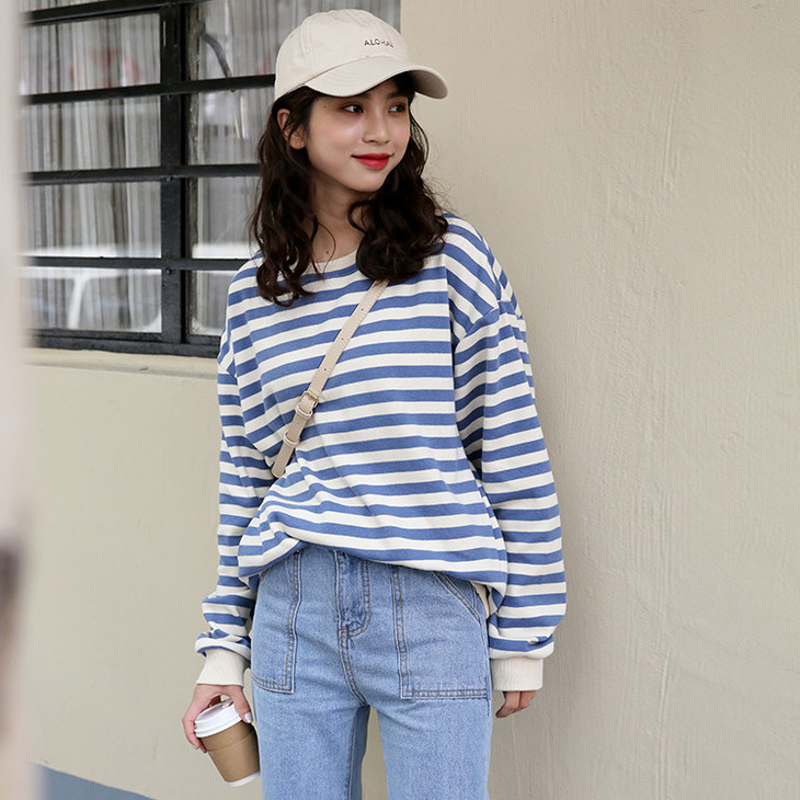 【服饰鞋包】秋季新款韩版宽松慵懒风chic圆领条纹休闲卫衣百搭上衣学生女