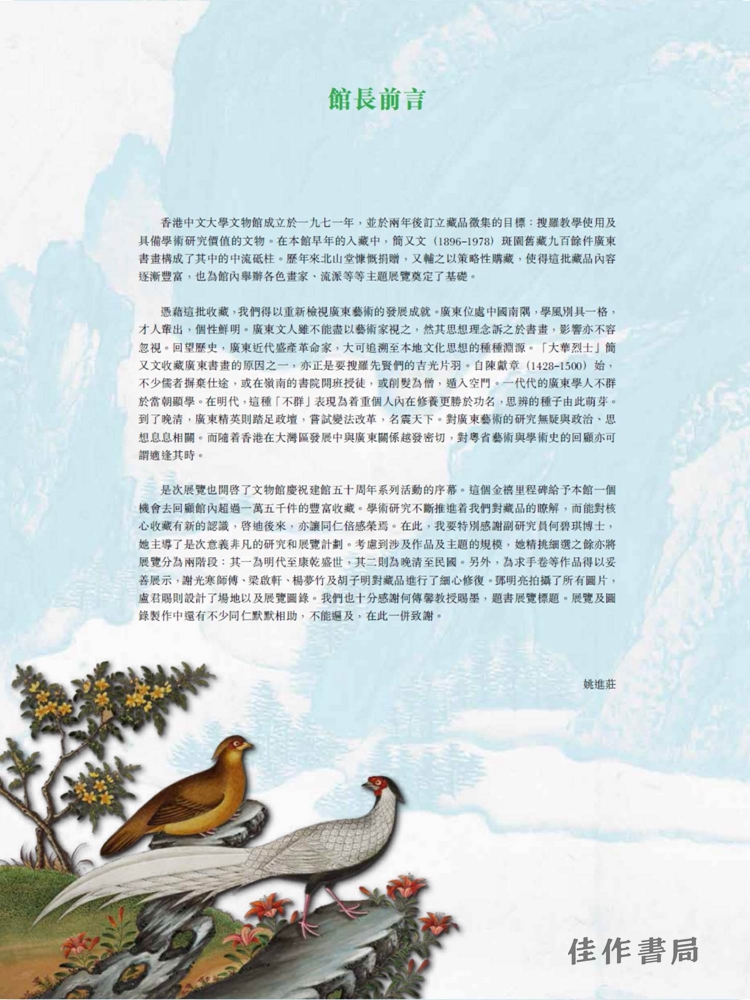 本书由文物馆何碧琪博士编撰,这是从静水流深至广纳百川的回溯与文字的文化历程,贯穿馆藏广东书画精品及深入浅出的文字,成为读者深刻思考广东精英的思想源流与艺术、文化及历史的关系。在文物馆金禧馆庆之际,特纪念广东先贤们为用,此实践用在全国知识界占一席位经世超超人的努力和热诚乎。中大美术馆馆长何碧琪,这本刊物是对中大藏书广东书画的回顾与再造之旅,深入原创研究。带领读者深入了解广东文化精英在艺术、文化和历史方面的思维方式。值此艺术博物馆金禧庆典之际,我们在此纪念这些先驱者在寻求将所学的治国知识应用于实际事务并为国家的知识遗产做出贡献方面所付出的无与伦比的努力和热情。