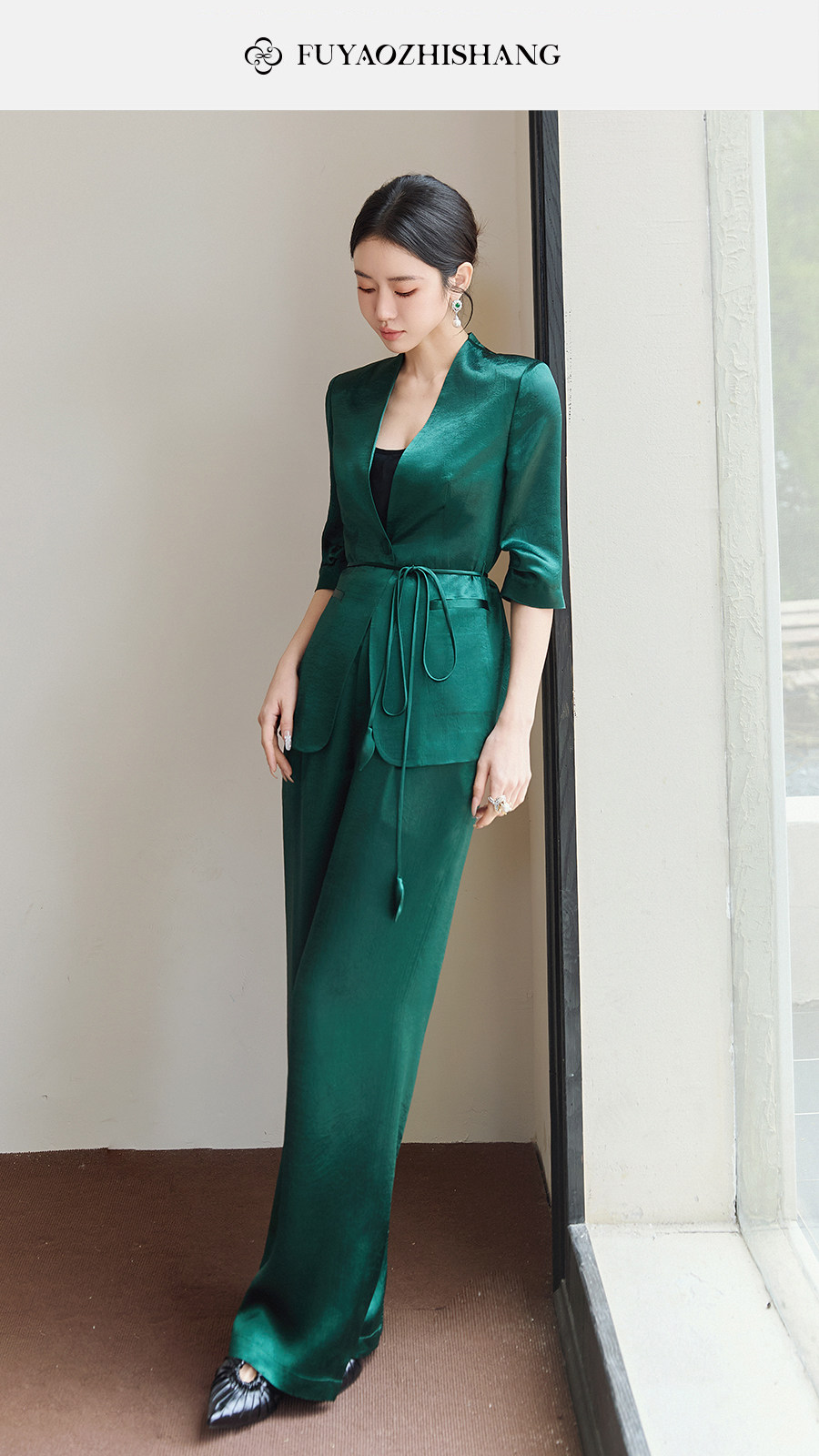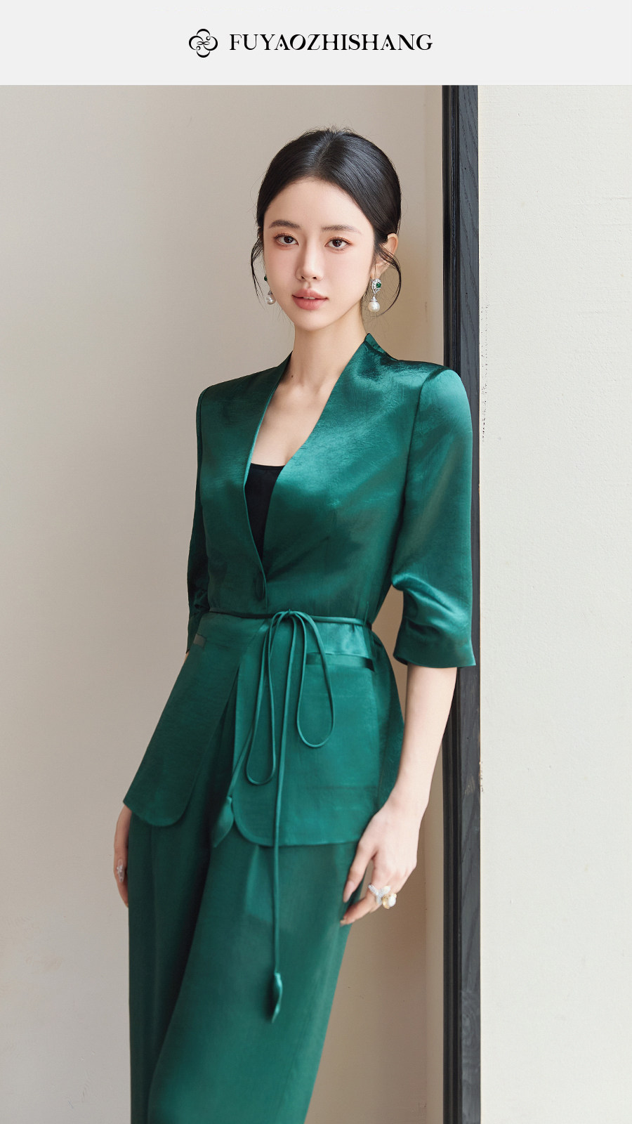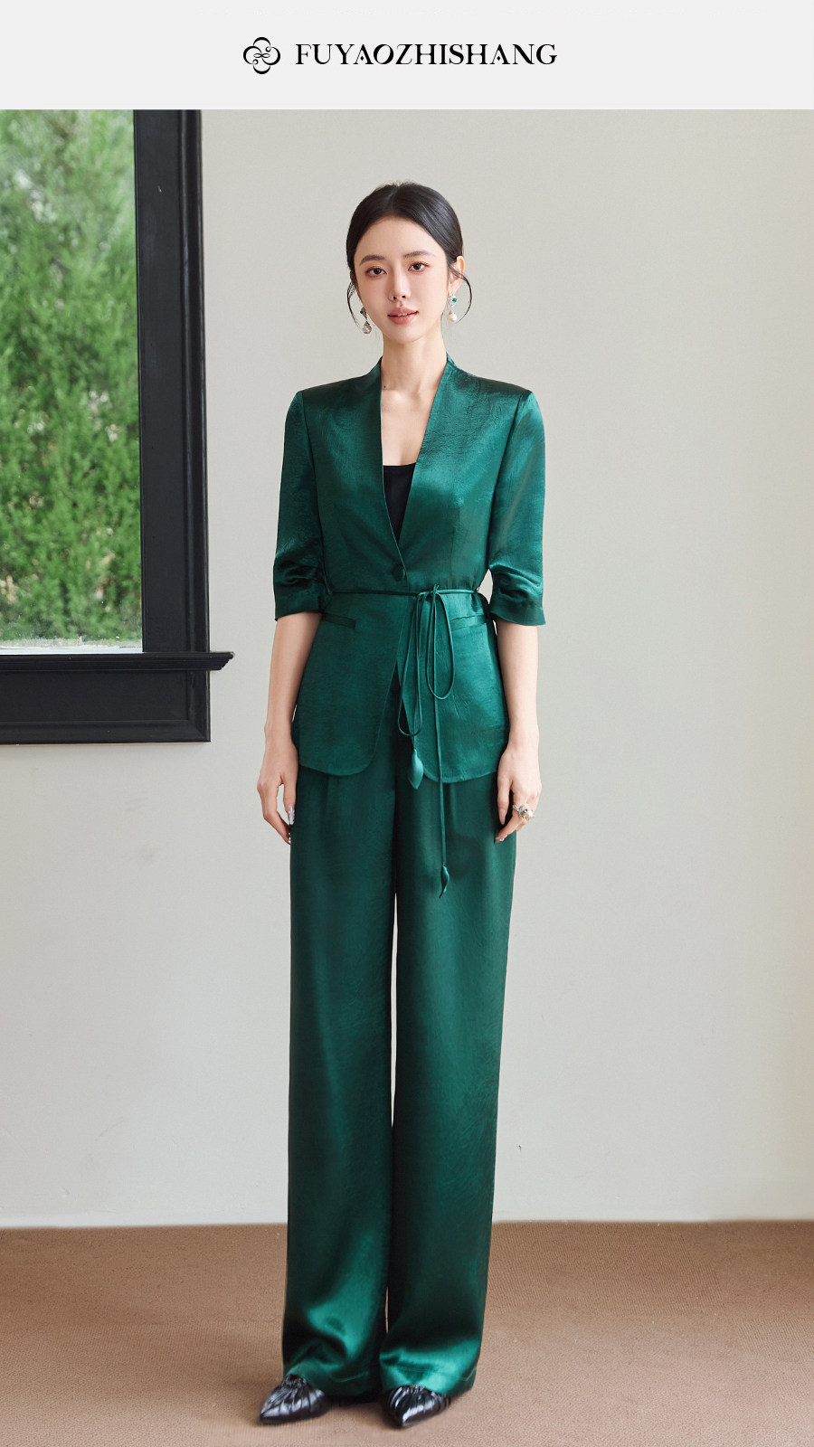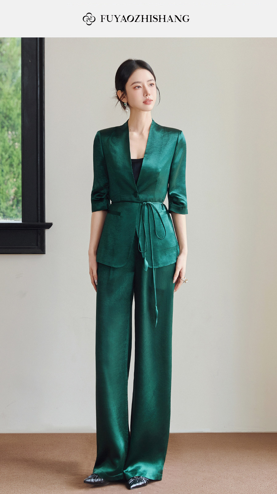 FUYAO扶摇直上 极简浪漫墨绿色西装套装女夏季七分袖轻奢醋酸西服