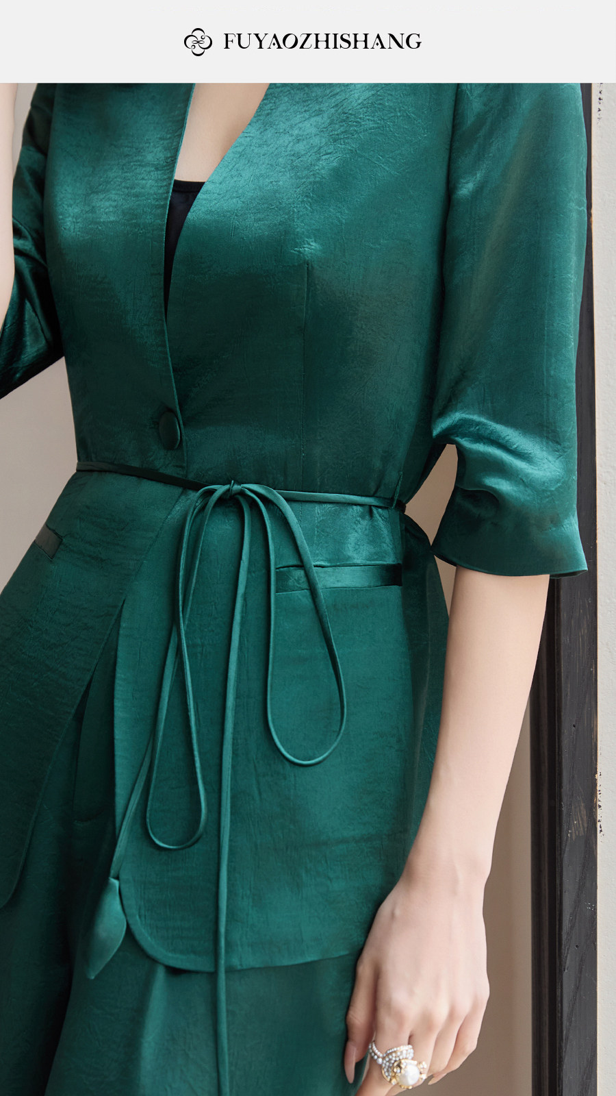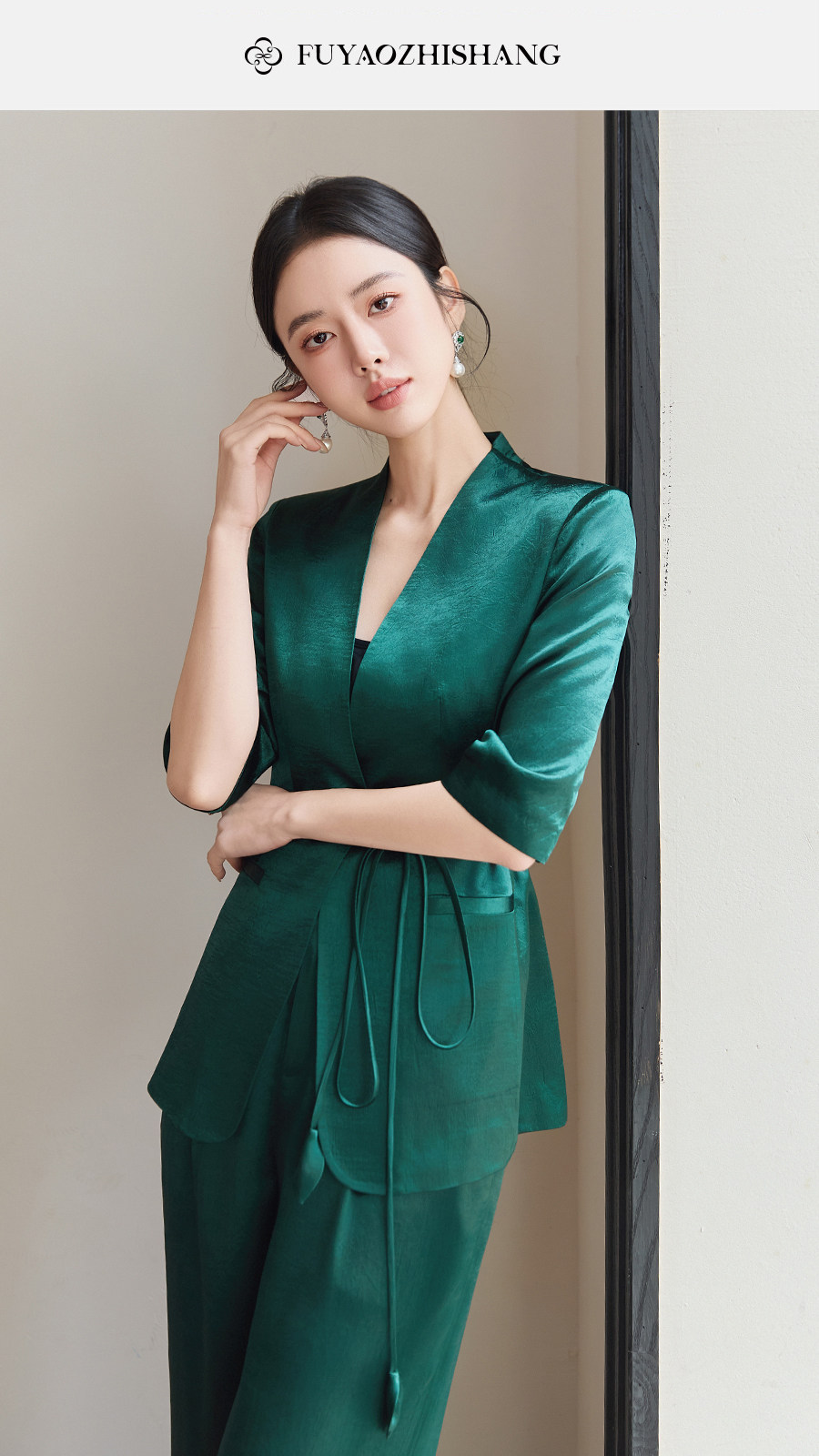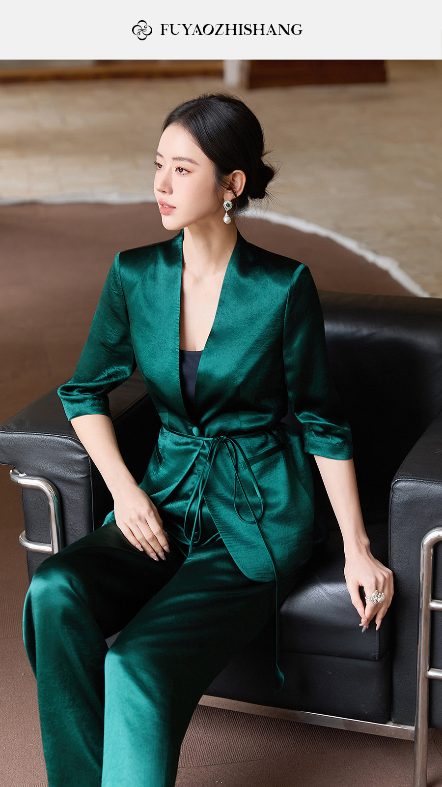 FUYAO扶摇直上 极简浪漫墨绿色西装套装女夏季七分袖轻奢醋酸西服
