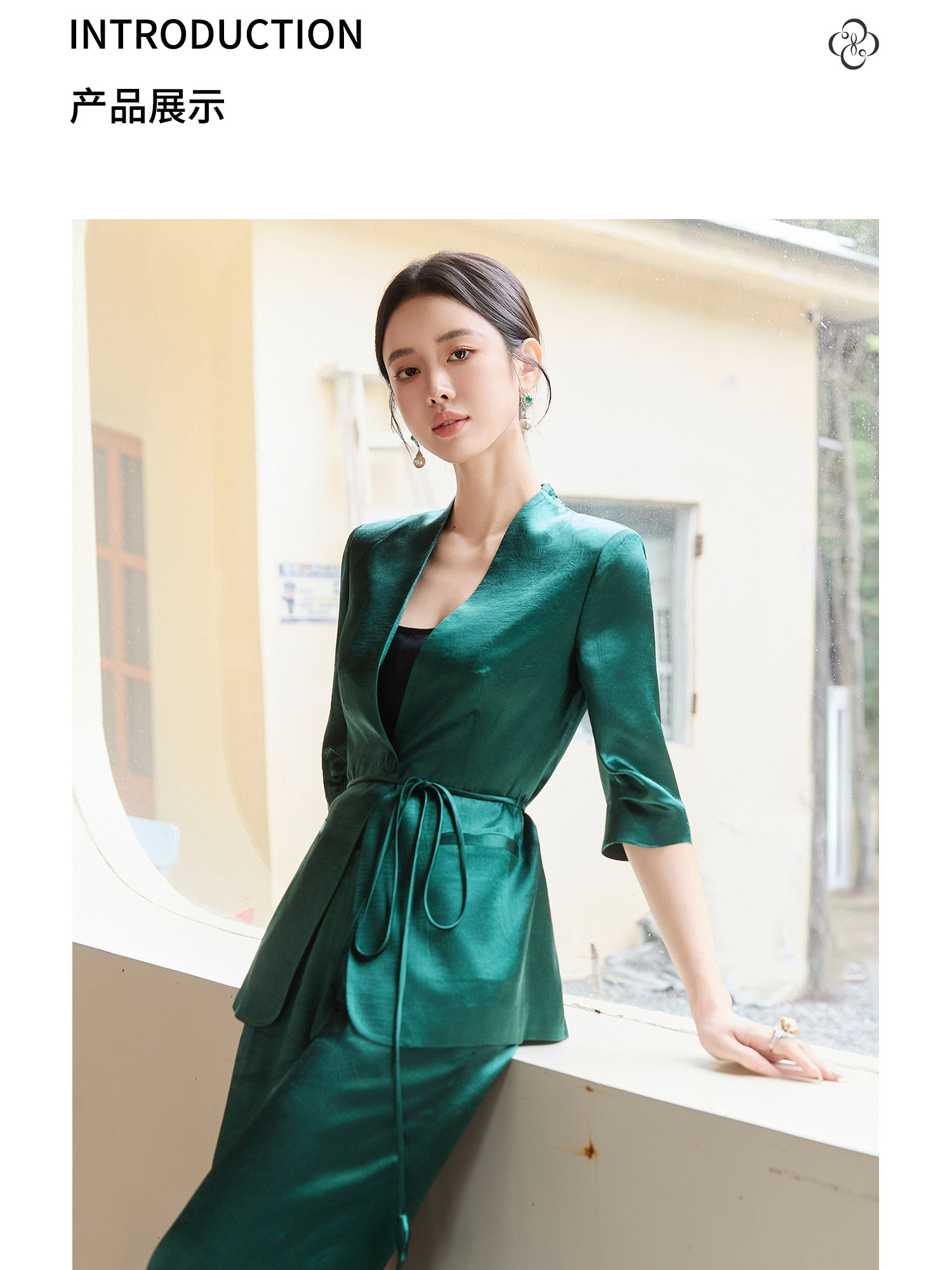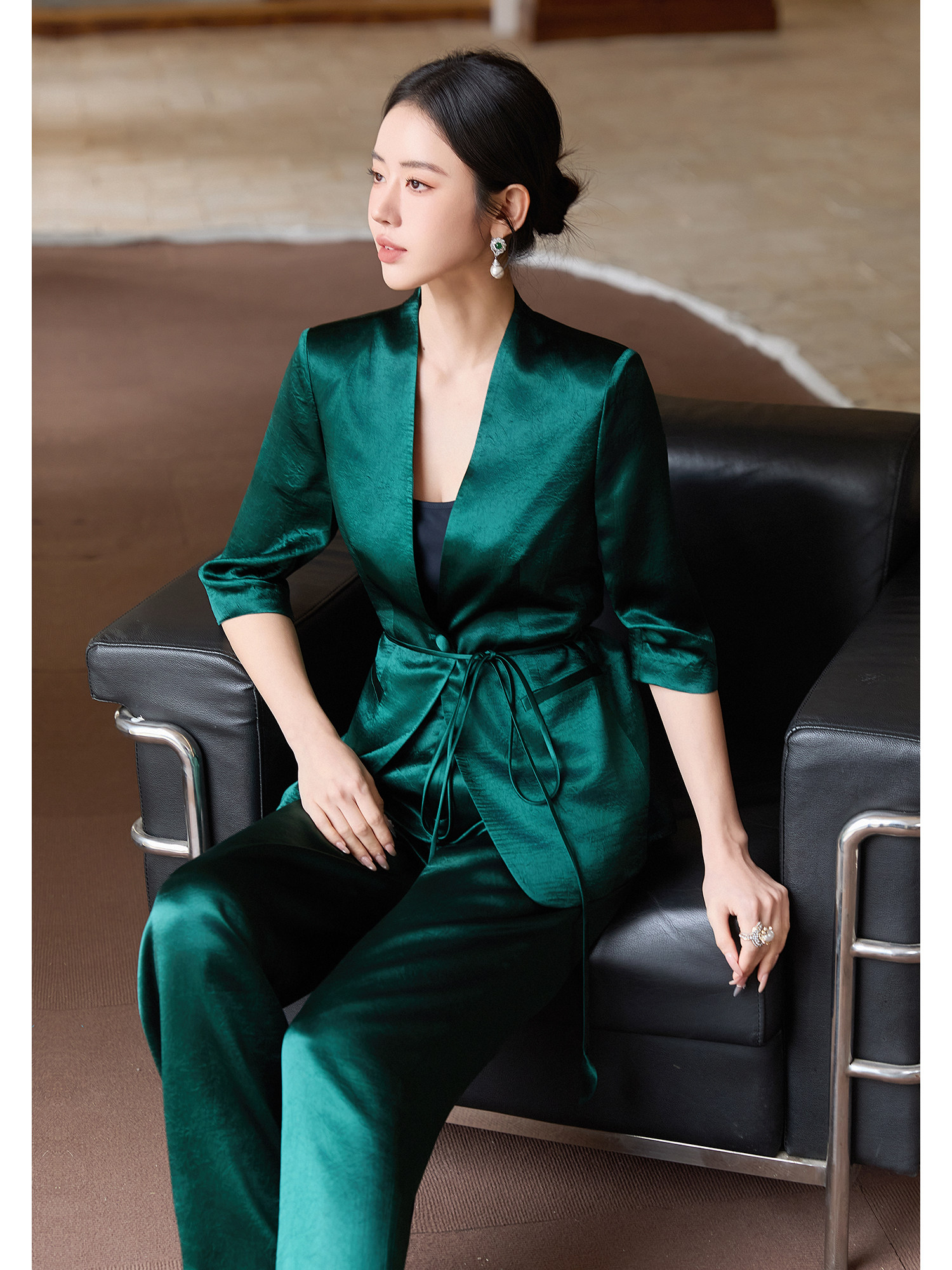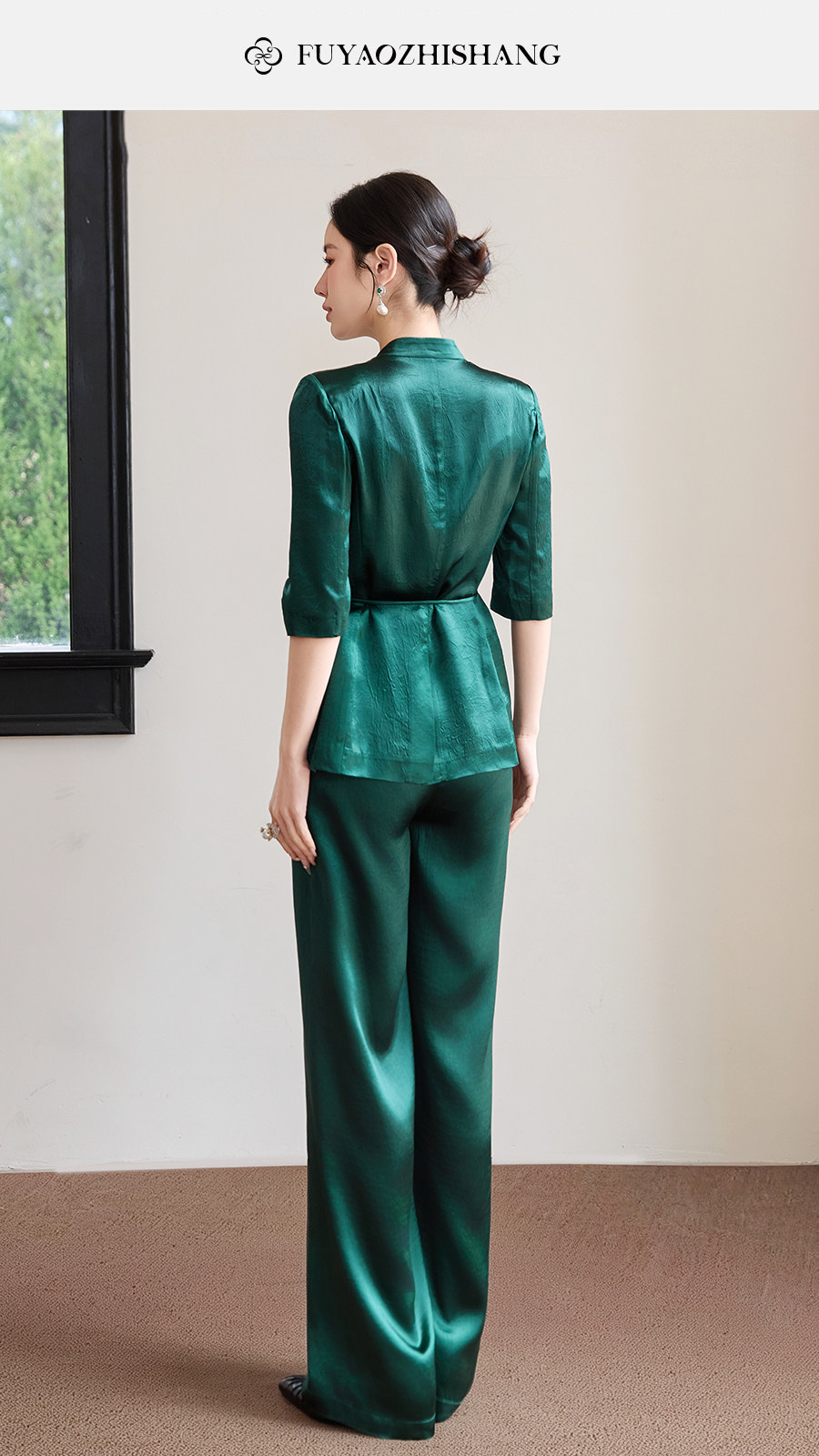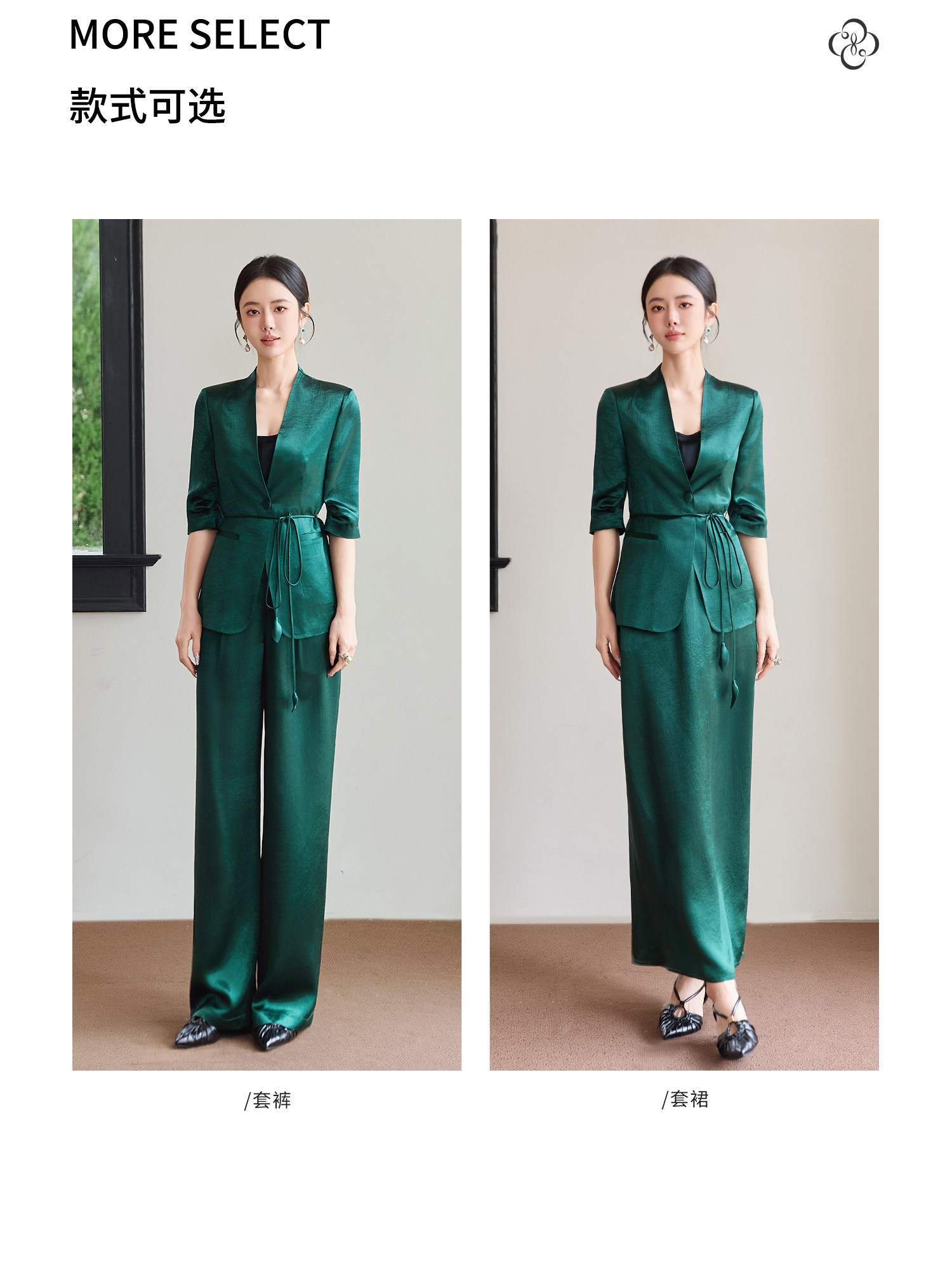 FUYAO扶摇直上 极简浪漫墨绿色西装套装女夏季七分袖轻奢醋酸西服