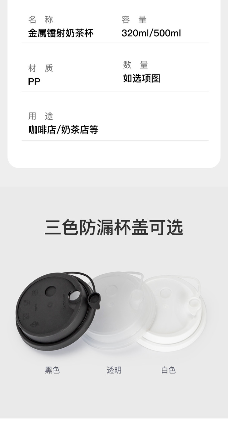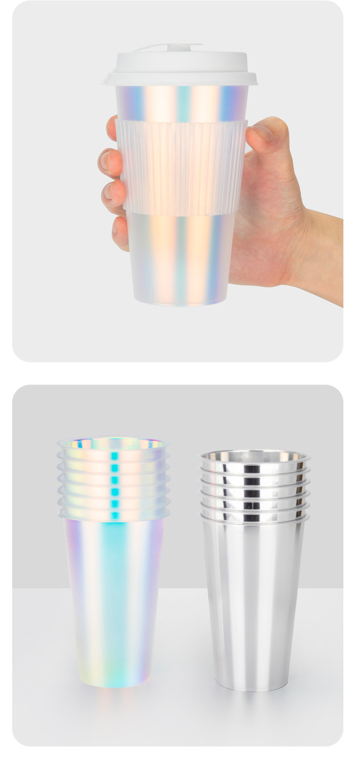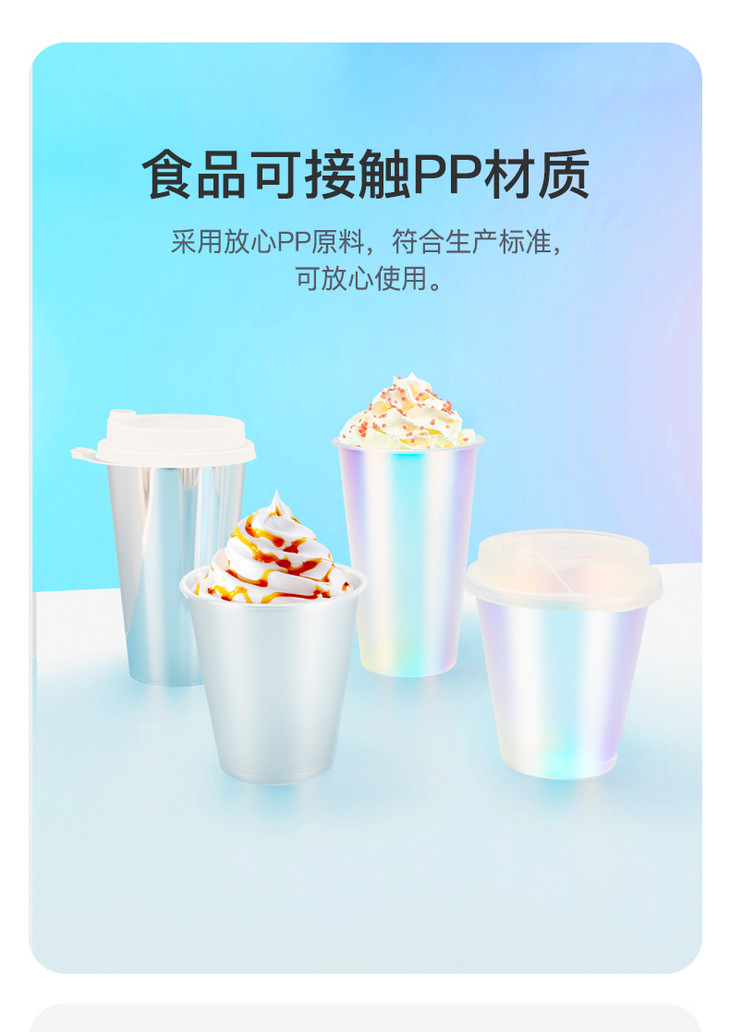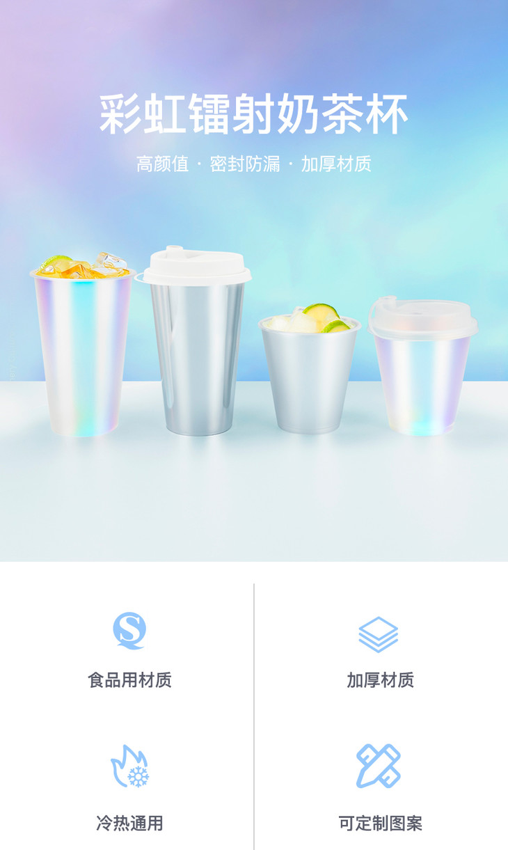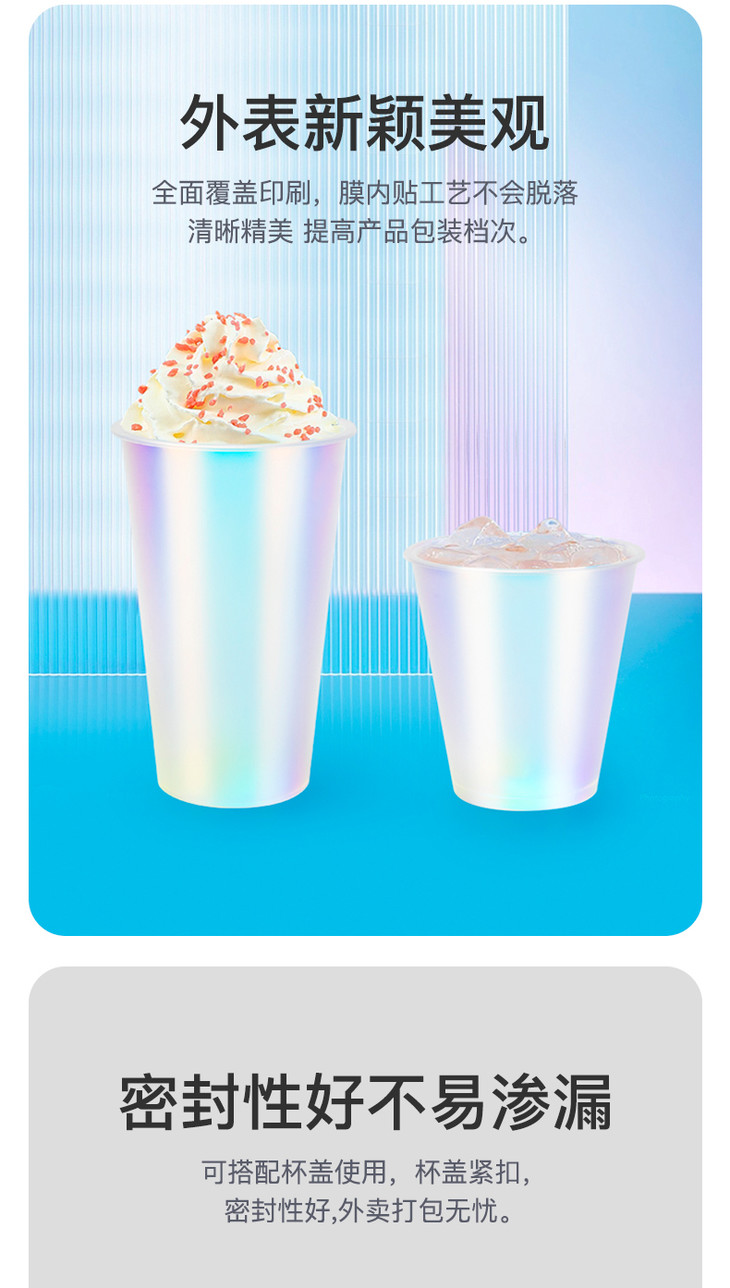 喇叭花金属镭射银色奶茶杯膜内贴注塑杯冷热饮一次性杯子彩虹杯定制