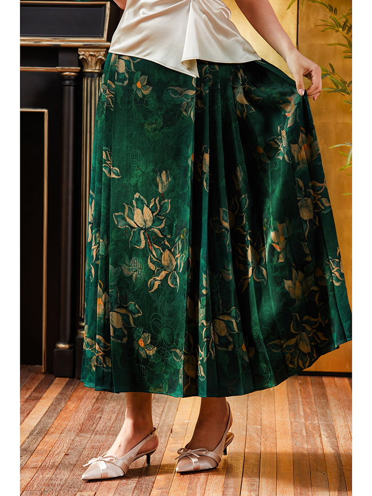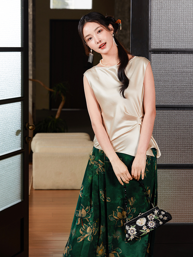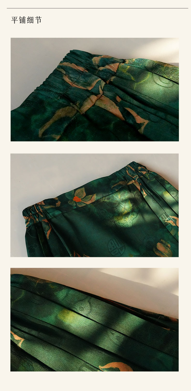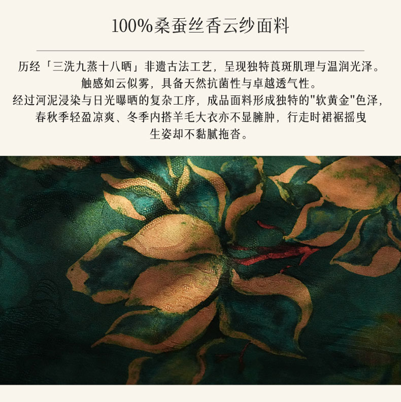 经过河泥浸染与日光曝晒的复杂工序,成品面料形成独特的"软黄金"色泽,春秋季轻盈凉爽、冬季内搭羊毛大衣亦不显臃肿,行走时裙裾摇曳生姿却不黏腻拖沓。