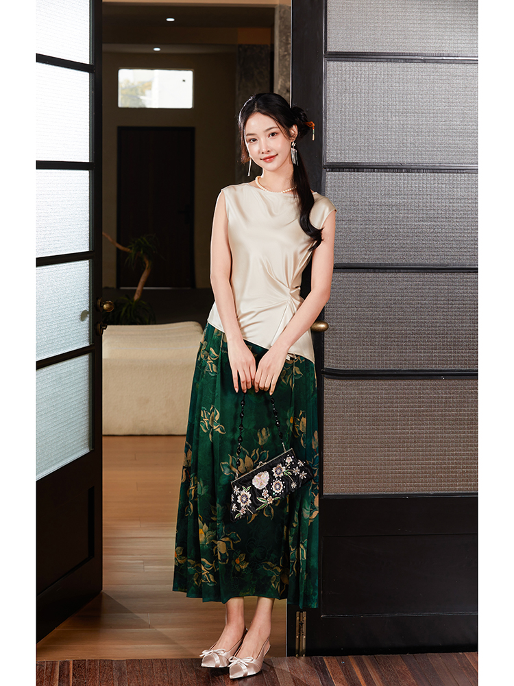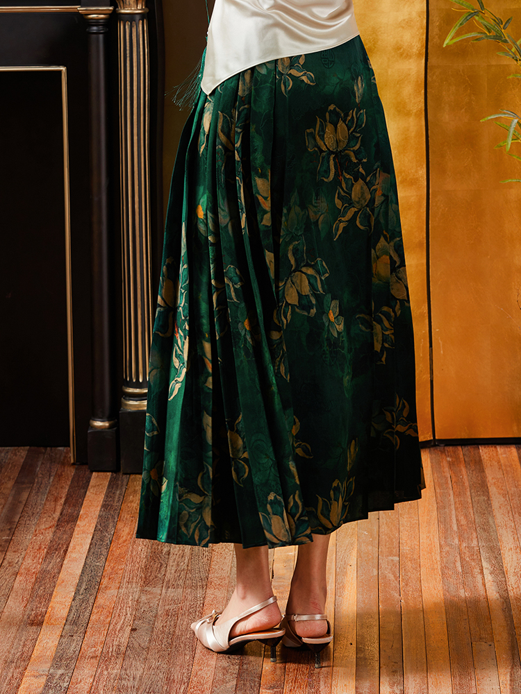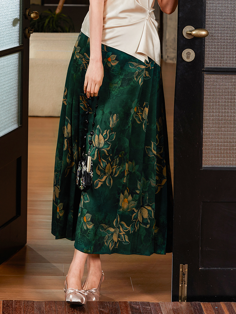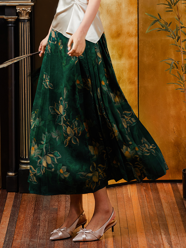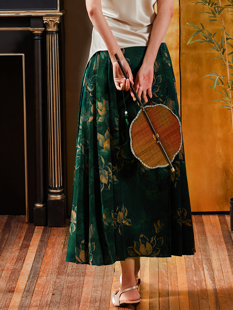经过河泥浸染与日光曝晒的复杂工序,成品面料形成独特的"软黄金"色泽,春秋季轻盈凉爽、冬季内搭羊毛大衣亦不显臃肿,行走时裙裾摇曳生姿却不黏腻拖沓。