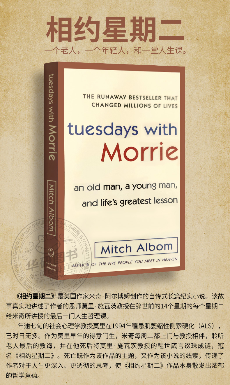 Tuesdays with Morrie《相约星期二》是美国作家米奇·阿尔博姆创作的自传式长篇纪实小说。该故事真实地讲述了作者的恩师莫里·施瓦茨教授在辞世前的14个星期的每个星期二给米奇所讲授的一门人生哲理课。年逾七旬的社会心理学教授莫里在1994年罹患肌萎缩性侧索硬化(ALS),已时日无多。作为莫里早年的得意门生,米奇每周二都上门与教授相伴,聆听老人临终的教诲,并在他死后将莫里·施瓦茨教授的醒世箴言缀珠成链,冠名《相约星期二》。
