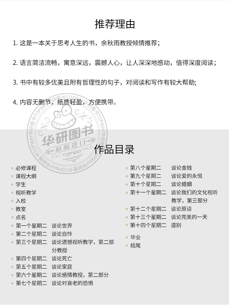 Tuesdays with Morrie《相约星期二》是美国专栏作家,北美疗伤系文学大师米奇•阿尔博姆于1997年发表的纪实文学作品,该书主要记录了他与身患ALS的恩师——社会心理学教授莫里临终前相约每周二探讨人生的谈话内容。这段“相约星期二”的经历对他来说是一个重新审视自己、重读人生必修课的机会。这门人生课不仅震撼着作者,也感动整个世界。本书适合有一定英文水平的读者阅读。