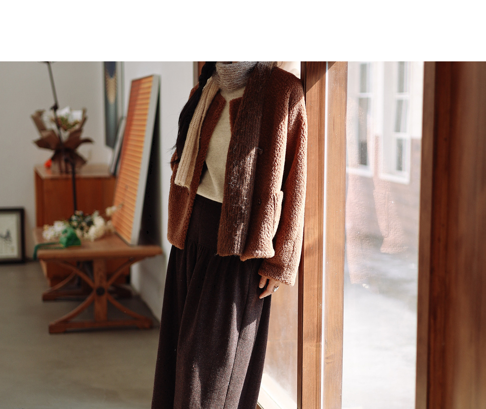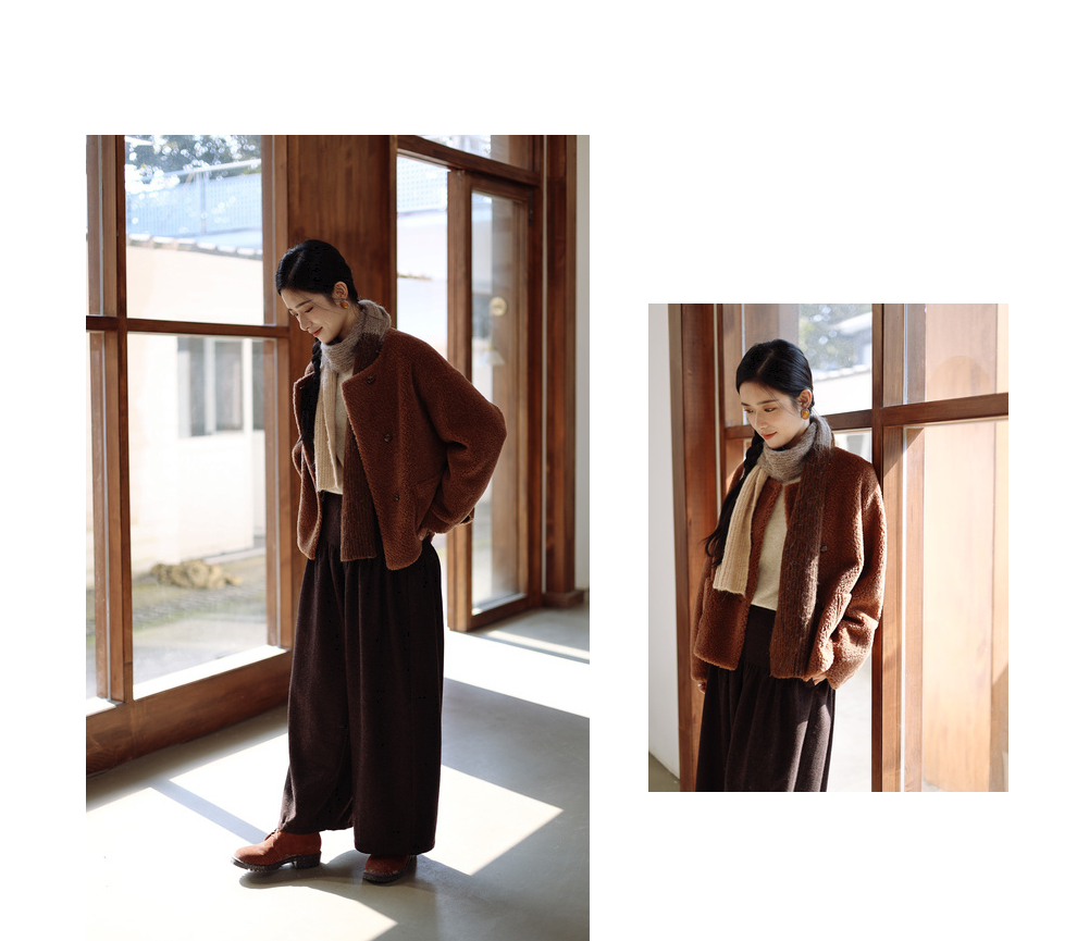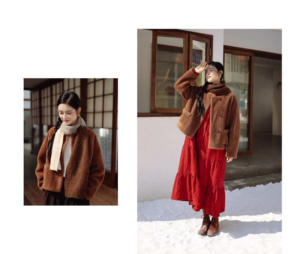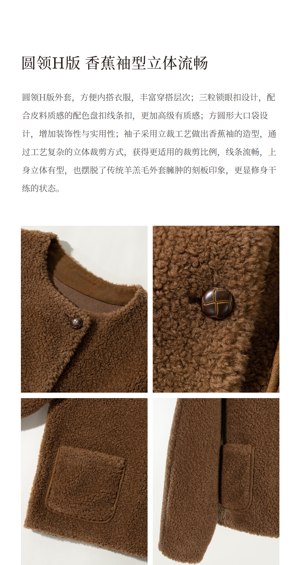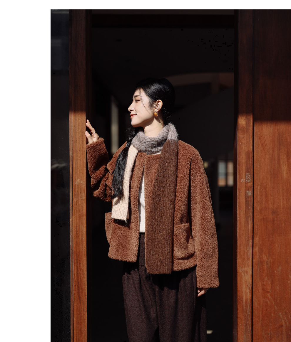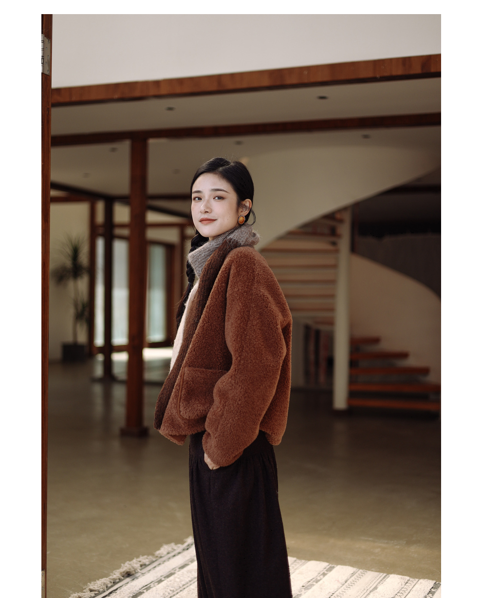 绽放932朵/2023冬季新款焦糖色全澳毛香蕉袖型设计感羊羔毛外套