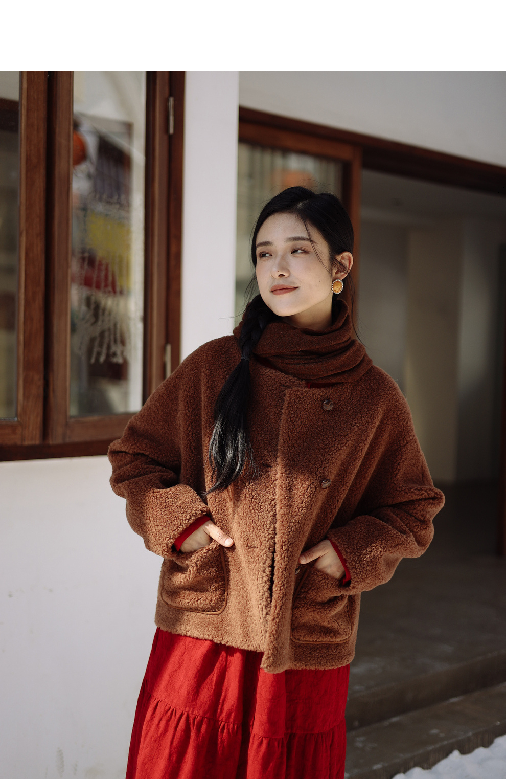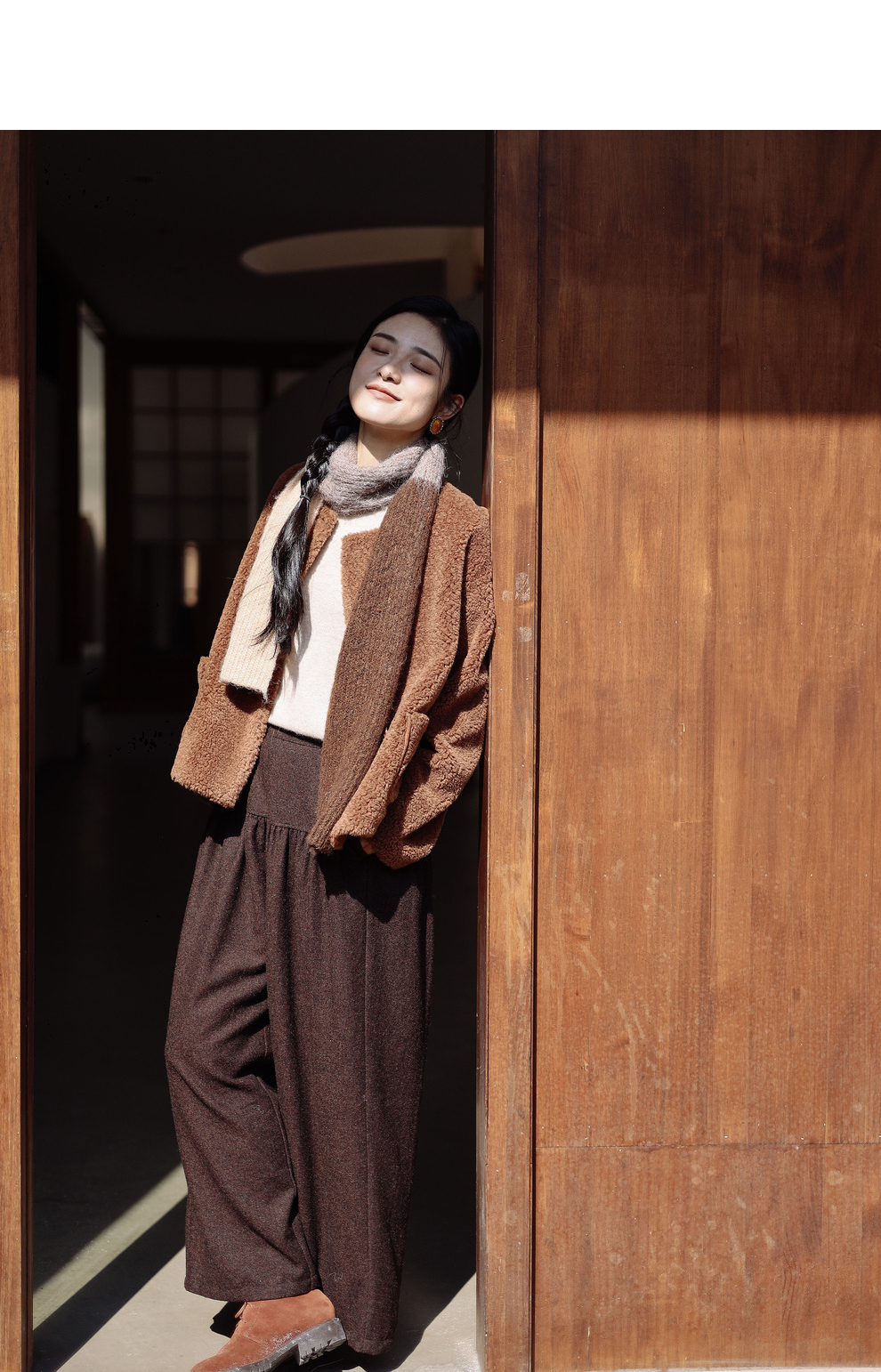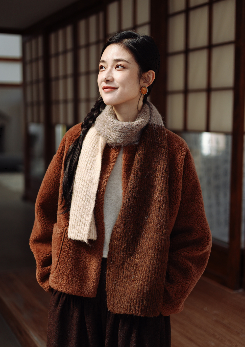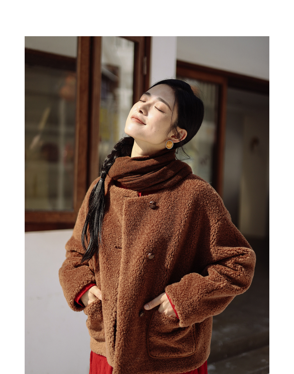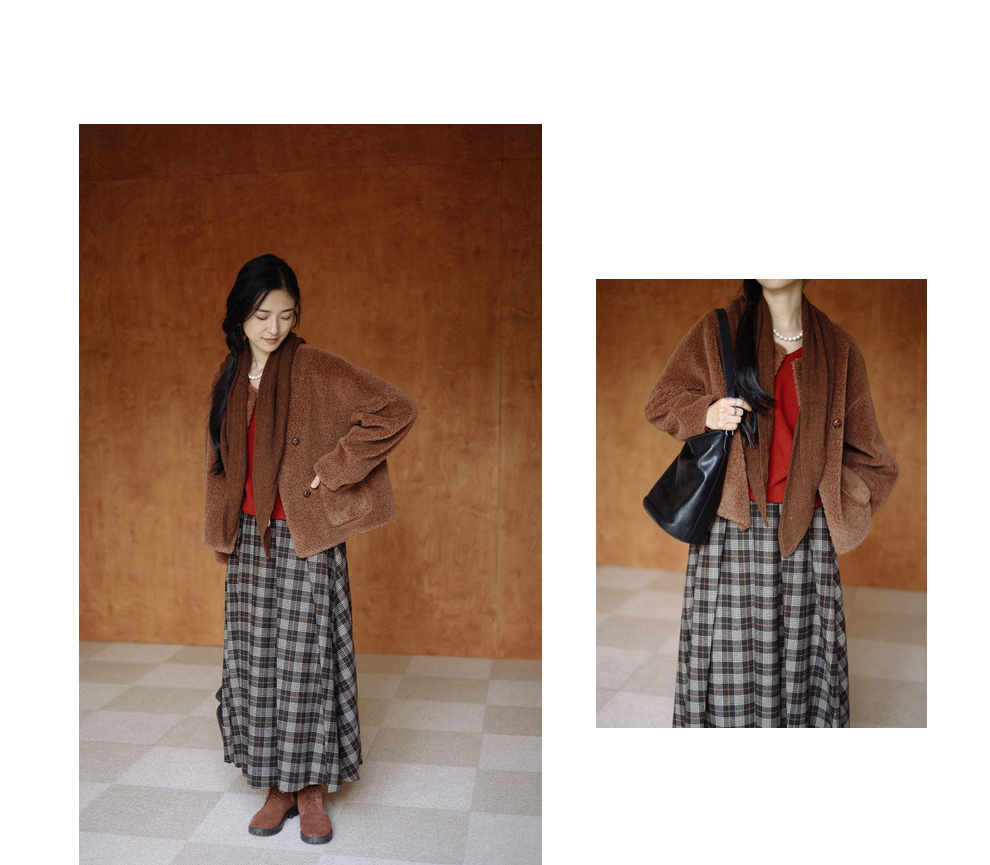 绽放932朵/2023冬季新款焦糖色全澳毛香蕉袖型设计感羊羔毛外套