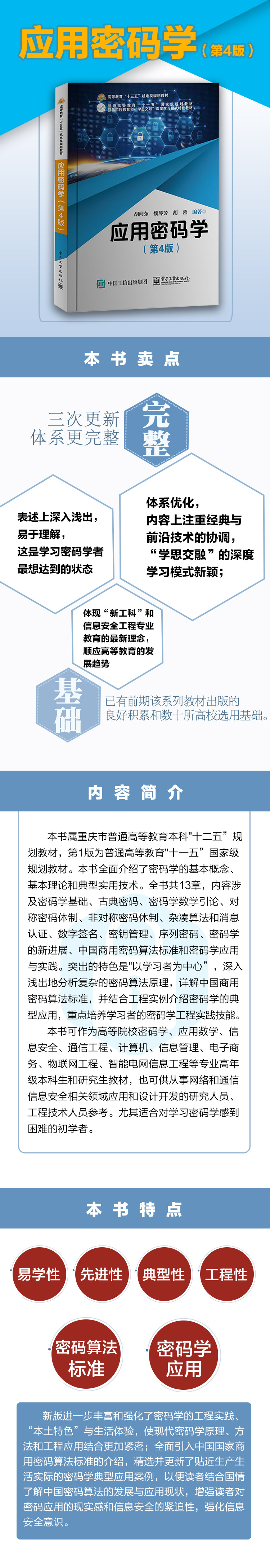 本书属重庆市普通高等教育本科"十二五”规划教材,第1版为普通高等教育"十一五”国家规划教材。本书全面介绍了密码学的基本概念、基本理论和典型实用技术。全书共13章,内容涉及密码学基础、古典密码、密码学数学引论、对称密码体制、非对称密码体制、杂凑算法和消息认证、数字签名、密钥管理、序列密码、密码学的新进展、中国商用密码算法标准和密码学应用与实践。突出的特色是"以学习者为中心”,深入浅出地分析复杂的密码算法原理,详解中国商用密码算法标准,并结合工程实例介绍密码学的典型应用,重点培养学习者的密码学工程实践技能。本书可作为高等院校密码学、应用数学、信息安全、通信工程、计算机、信息管理、电子商务、物联网工程、智能电网信息工程等专业高年级本科生和研究生教材,也可供从事网络和通信信息安全相关领域应用和设计开发的研究人员、工程技术人员参考。尤其适合对学习密码学感到困难的初学者。