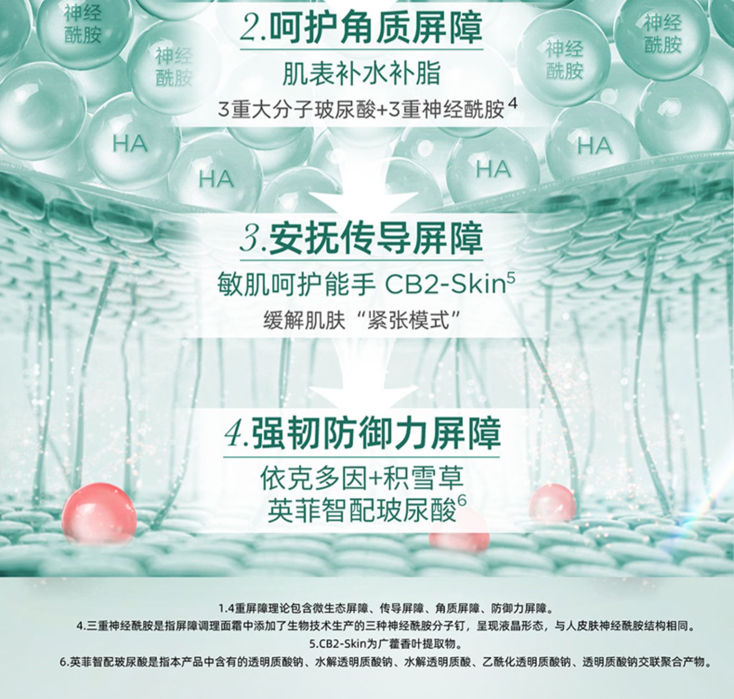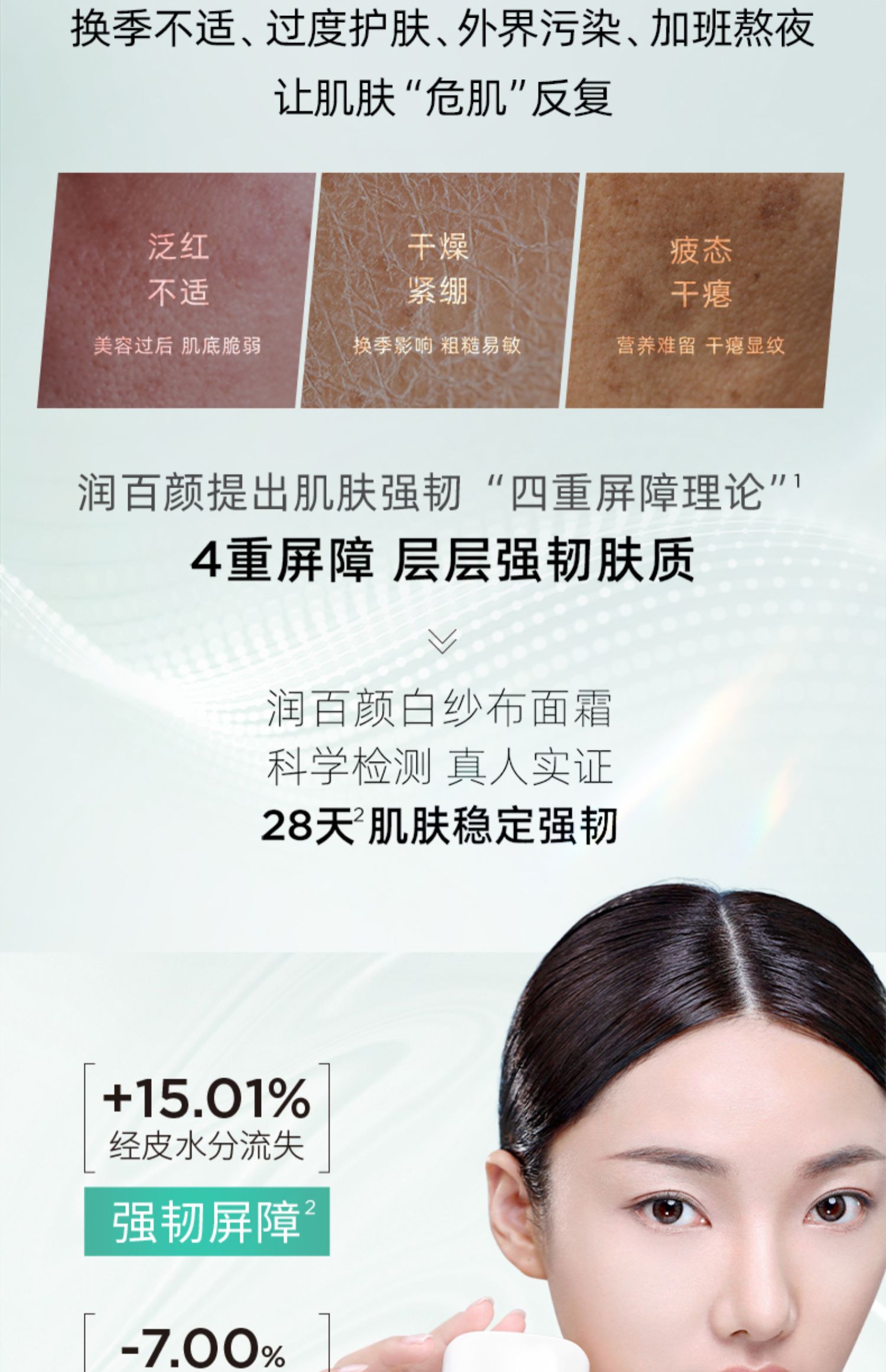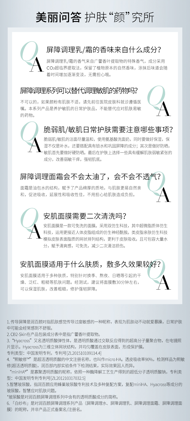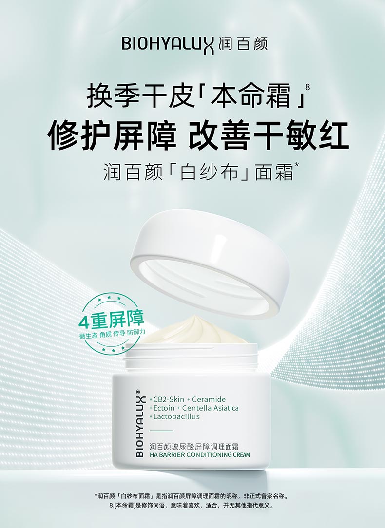 白纱布屏障系列的核心技术来自于润百颜独家黑科技——INFIHA 英菲智配玻尿酸,将不同分子量的玻尿酸进行了科学复配,让活性成分与玻尿酸协同增效,依托这样的技术,达到对肌肤的四重屏障修护。第一重通过「乳酸菌发酵提取物」平衡微生态屏障,第二重以「英菲智配玻尿酸+3重神经酰胺」守护角质屏障,第三重通过广藿香提取物「CB2-skin」修护传导屏障,第四重用「依克多因+miniHA」强韧防御力屏障。通过四重修复,来改善脆弱肌肤生成的全链路问题,守护“韧性”肌肤。这次的玻尿酸屏障系列,就包括了调理水、调理乳及调理霜。