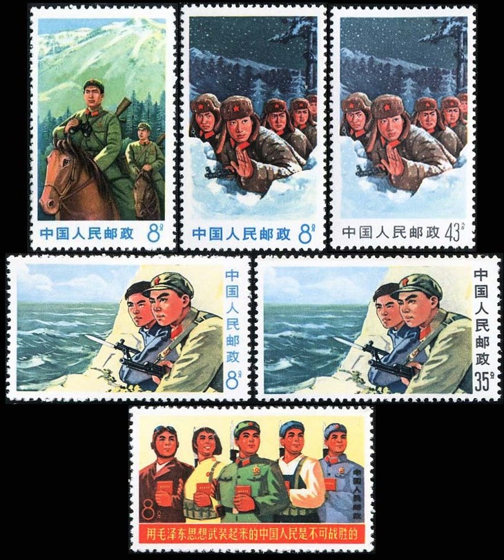 1969年,中国和原苏联在乌苏里江的珍宝岛发生严重军事冲突,原苏联方面出动了坦克、装甲车、飞机,但最终被我国击退。文18就是在这种背景下发行的,用以弘扬战士们英勇抗敌、不畏牺牲的精神!尤其是这套邮票的第一枚,上面有一句铿锵有力的口号,“……中国人民是不可战胜的!”48年前的我们,太霸气了!
