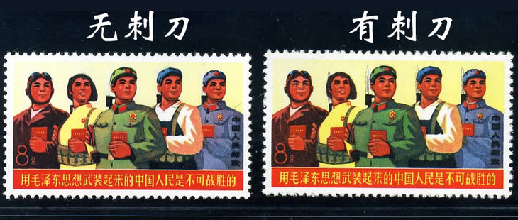 文18的第一枚邮票“军民团结”,后来人们发现有少量“无刺刀”的变体流出。这种变体的特征是:邮票图案中军人和民兵所背负步枪的刺刀由于邮票印刷质量问题(漏色),看起来好像没有刺刀。变体票如下图: