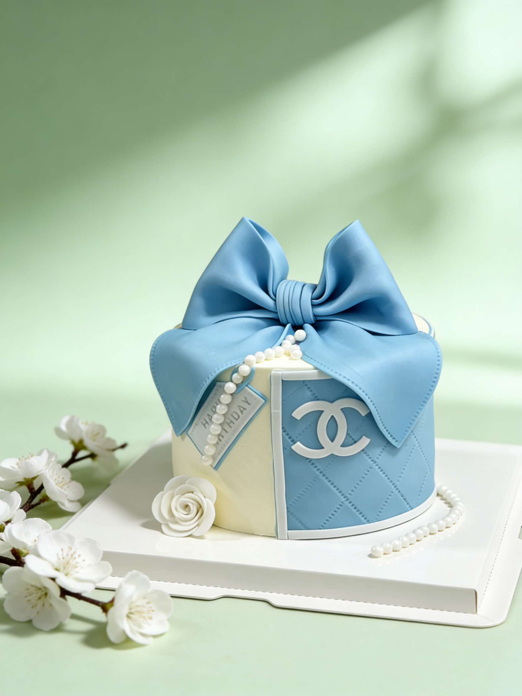 女神香奈儿翻糖蓝色蝴蝶结蛋糕