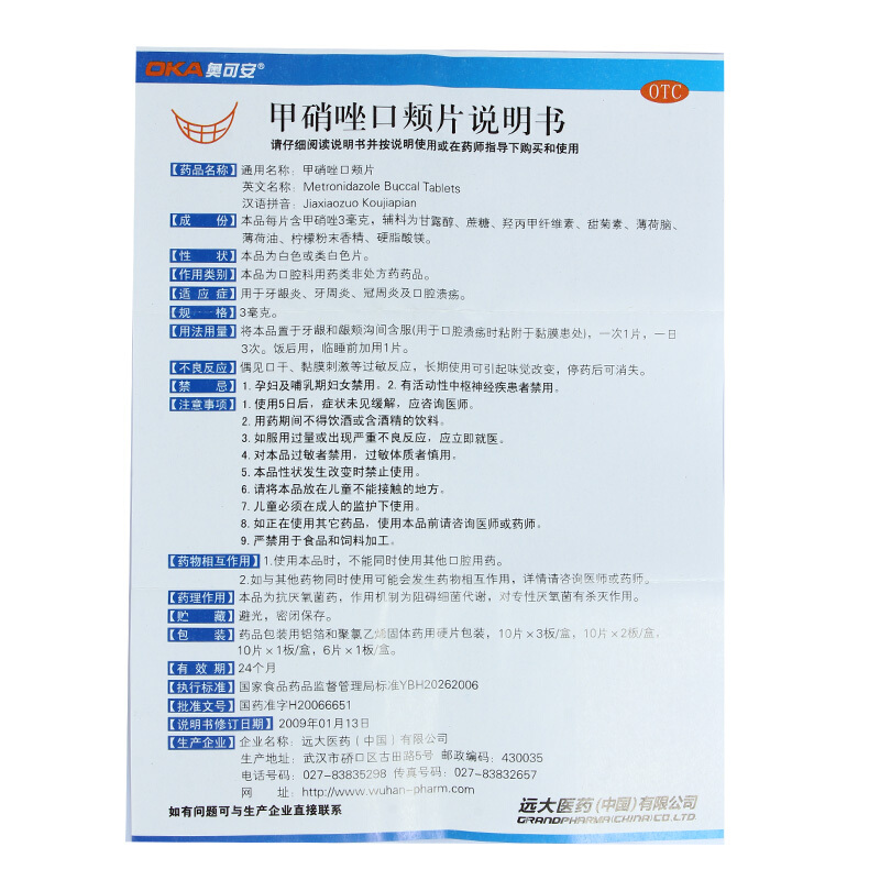 奥可安 甲硝唑口颊片20片 牙周炎 冠周炎 口腔溃疡正品