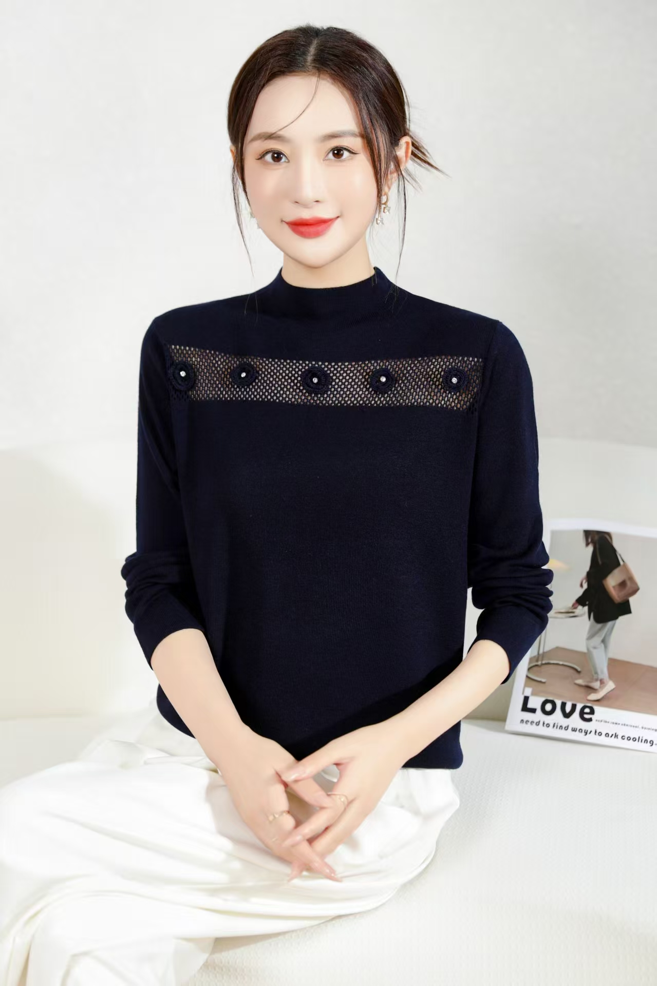 伯妮斯茵 | 复古精致 半高领钉珠针织衫 细腻针织面料 百搭遮肉 约会出游款 SZ6E03 绀蝶