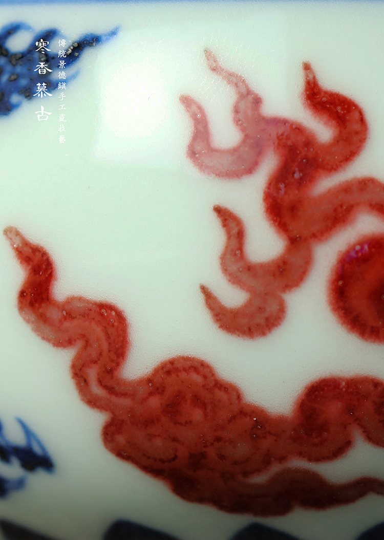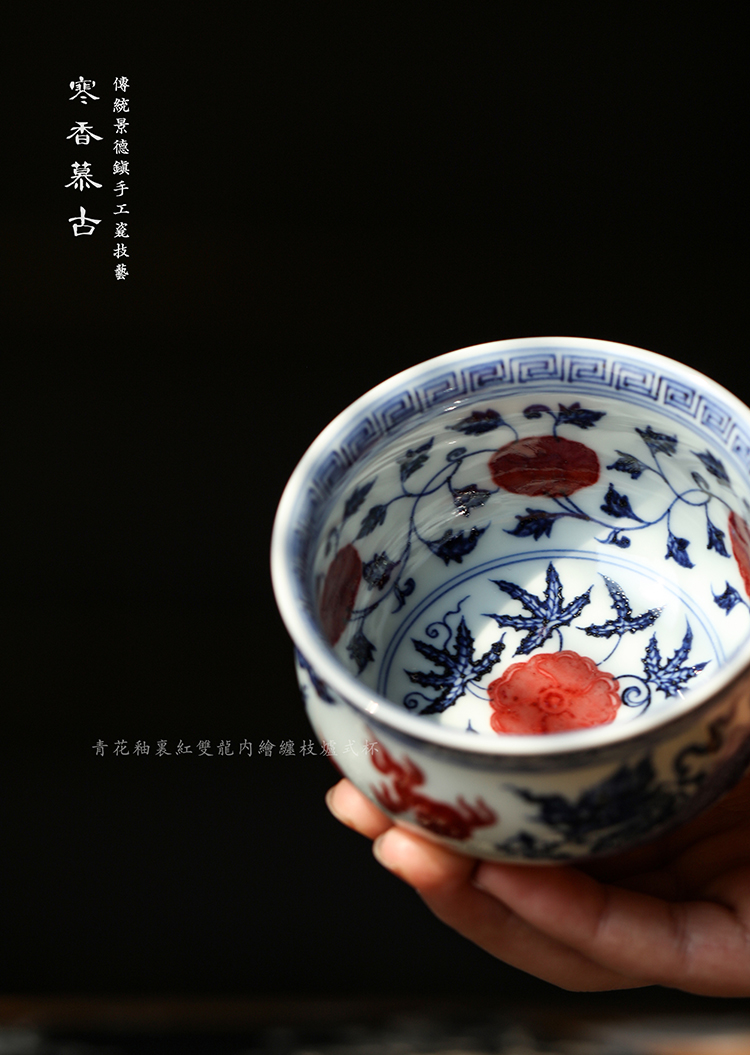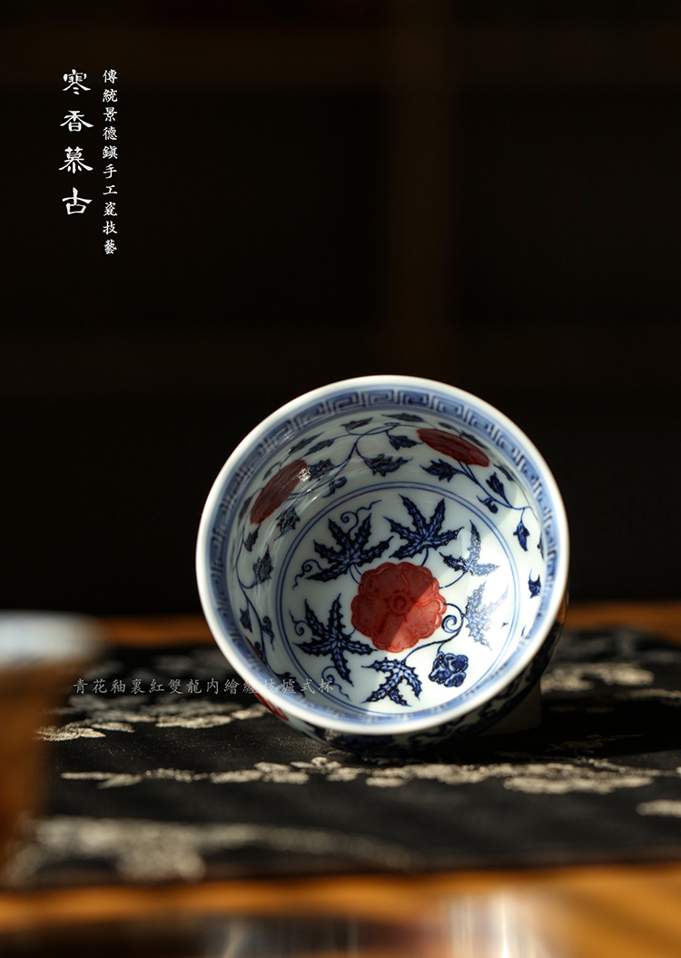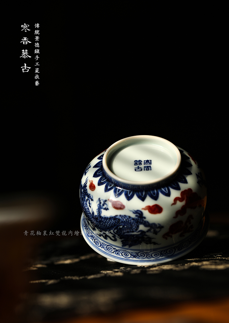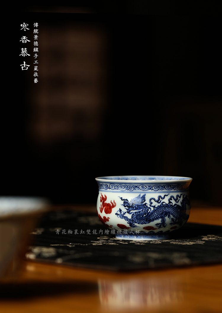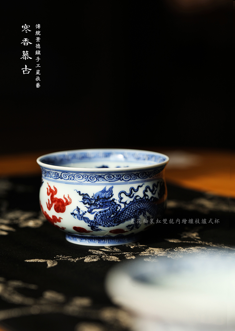 寒香慕古青花釉里红双龙内绘缠枝炉式杯