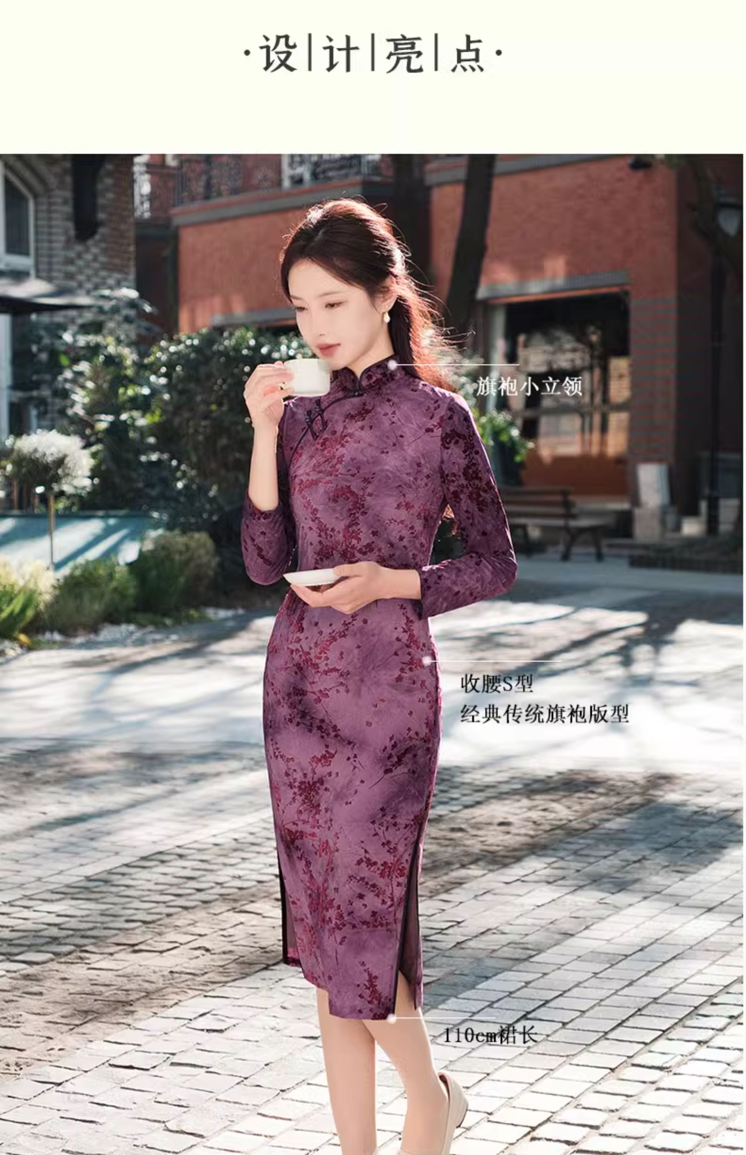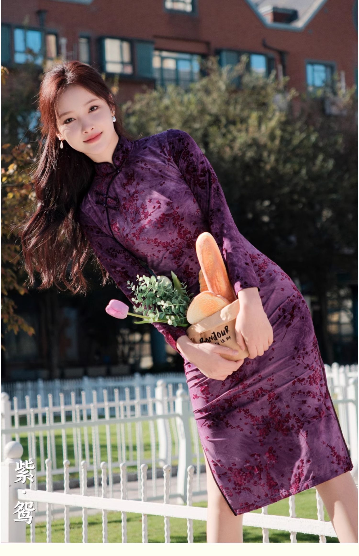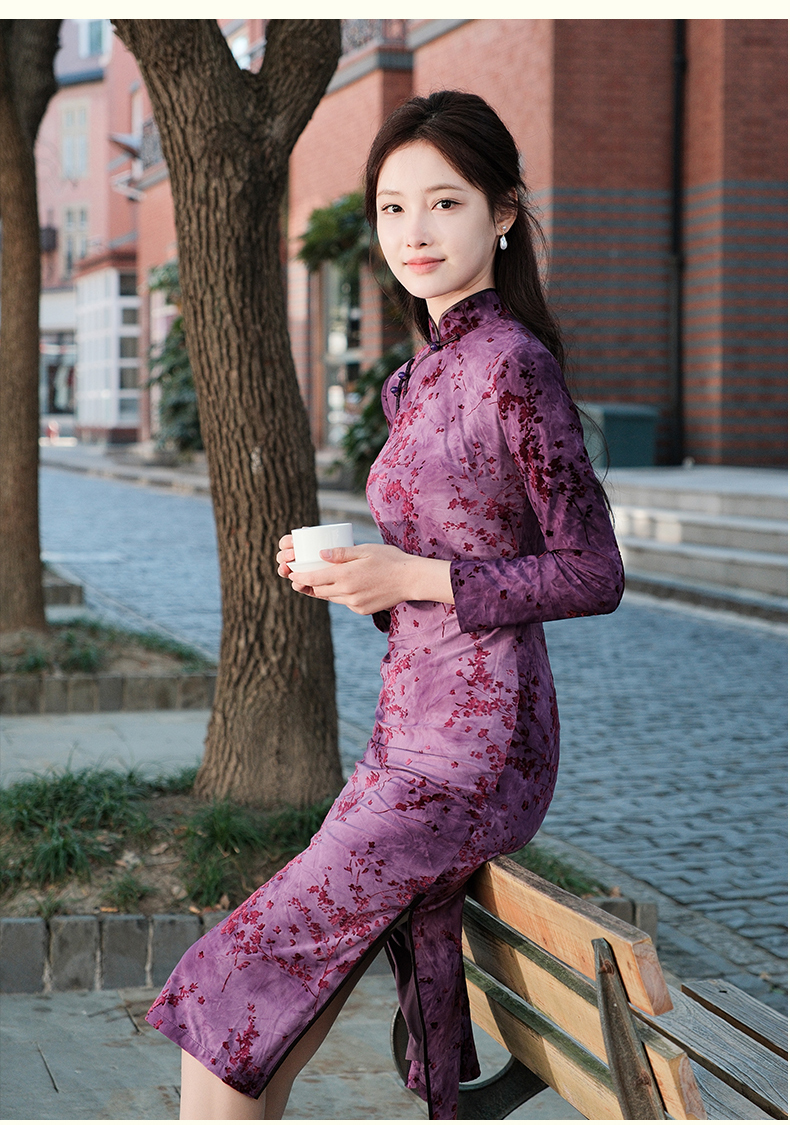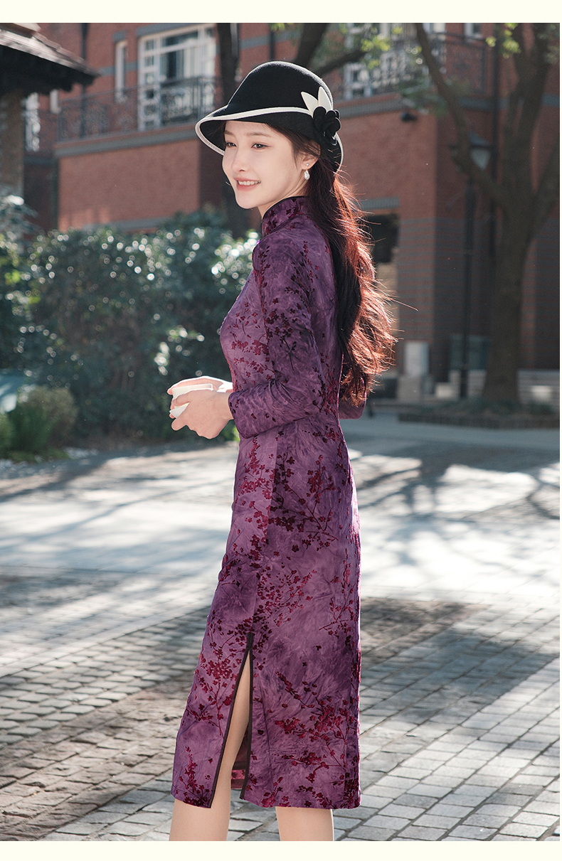 上海逸红颜紫鸳2025冬季新款扎染针织植绒新中式改良长袖文艺旗袍