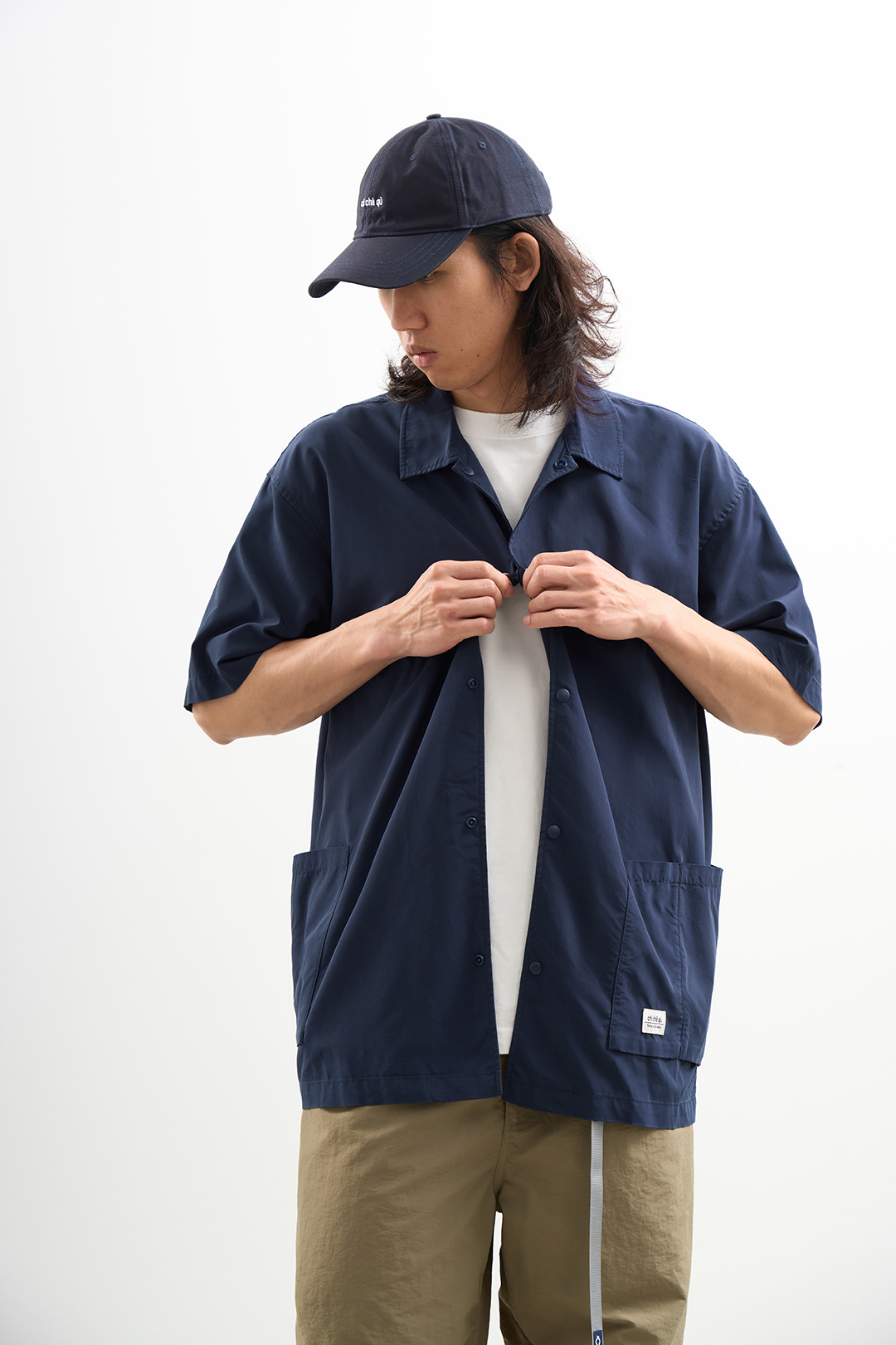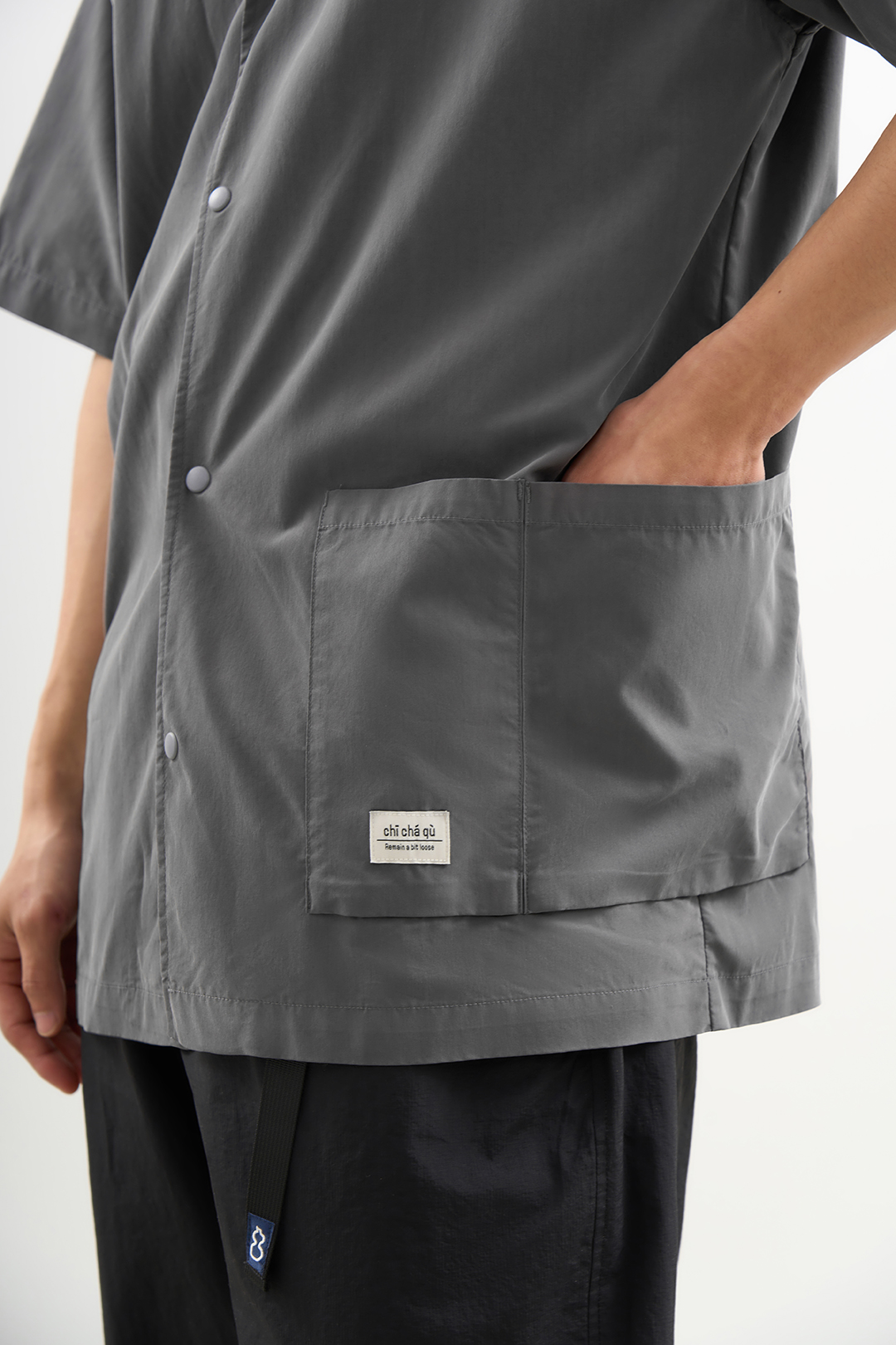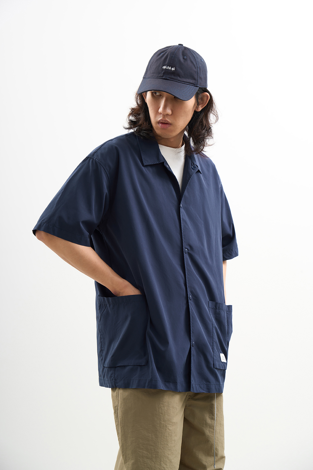 吃茶去chichaqu2024混纺天丝不对称口袋短袖衬衫宽松复古经典休闲