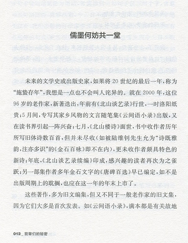 刘绪源编著的《前辈们的秘密》写了二十几位大文化人,他们以自己独特的个性、深度和文采,为中国思想界、学术界、读书界增添了奇异的色彩。其中有张中行、施蛰存、王元化、李泽厚、黄裳、舒芜、曾卓、辛丰年、吴小如、唐振常、金性尧、谷林、范用、梅朵……作者与他们有深入的交往,但也有客观冷静的评述和研究,力图将他们迷人的风致与他们在当代精神生活史上的地位真实地呈现于笔端。同时,作者还想通过这些前辈的身世经历和学术思考,发掘中国文化的深层奥秘。作者借助李泽厚的研究提出:中国文化在认识论层面,更强调“常识”;在存在论层面,更强调“日常”;此外还有第三个特点,即更倚重“专家之上的文人”。本书所写人物多为中国文化最好的传承者,书中大量第一手材料和作者的解渎心得,对于中国知识分子研究、当代文化史研究和中国文化特征研究,都有一定参考价值。