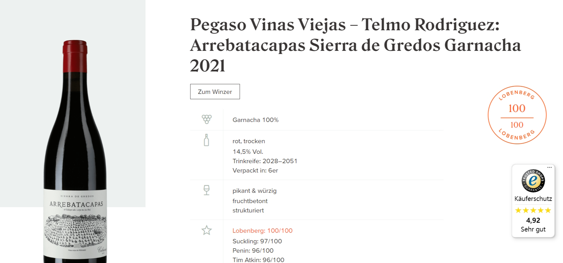 《德国葡萄酒指南》(Lobenberg)给予了此酒 100 分好评,并这样评价道“由于板岩土壤的缘故,闻香更像是皮扎拉(Pizarra,酒庄另一款 RP 96 分酒),同时它也更精细。海拔 1,000 多米的高度带来的凉爽气候,使酒款非常细腻精致,诱人。它闻起来有大量的红色水果香气和明快的甘草气息,以及杏仁和坚果气息,非常迷人,口感令人尤为惊叹,太精致了!轻盈的香料味袭来,给葡萄酒带来了额外的新鲜感。口感浓郁又清新,酸度高而不尖锐...浓郁度高的同时又做到了轻盈活泼的质感,举重若轻...馥郁的野生覆盆子、草莓、甜红樱桃的味道,再加上一些干蓝莓皮、巧克力、榛子坚果、花香、甘草、杏仁糖、碎樱桃核...该酒是浓郁的,单宁成熟、柔滑,后劲令人久久回味,但丝毫不显丰富肥腻或者强劲,反而很精细精致,令人愉悦,保留了它独特的一面。它非常漂亮,是一款非常好的佳酿!”