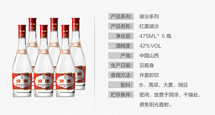 山西杏花村汾酒 红盖玻汾 汾酒 42度 475ml 清香型白酒 自饮 友聚小酌 家庭聚餐 送礼