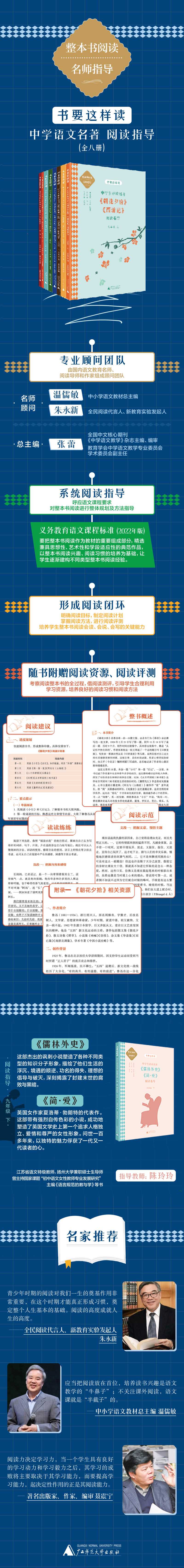 ;书要这样读之《中学生名著阅读指导》本书编写谨遵原创精神。以一流名师整本书阅读真实的教学体验作为示范样本,以精选段落(篇章)配合紧扣课程标准和核心素养的原创题目,作为强化和巩固训练的载体,力求引导学生学会举一反三、迁移运用,协助师生较为顺畅地达成整本书阅读教学的理想目标。