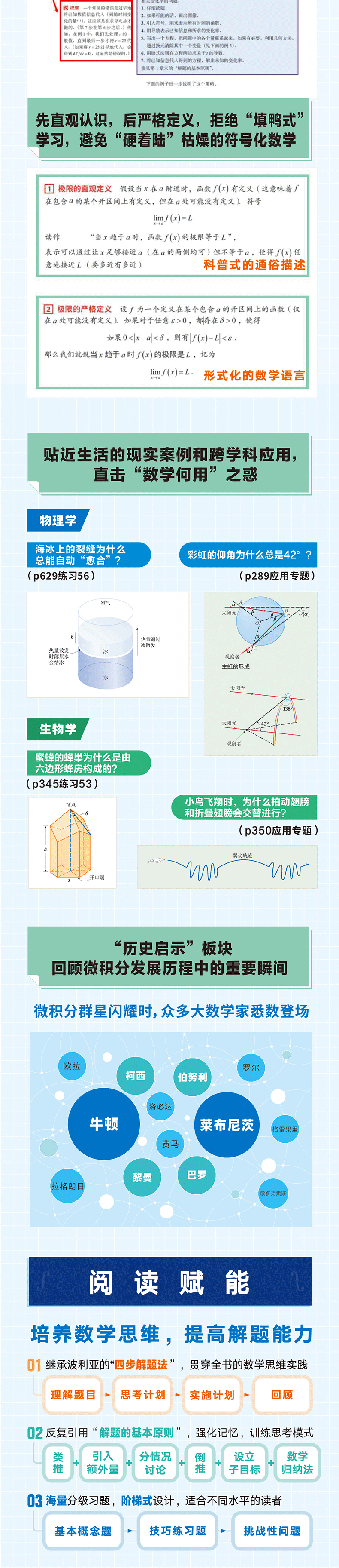 本书讲解了(一元)微积分的主要概念和核心思想,从基本函数出发,*覆盖了极限、导数、积分、微分方程、参数方程等重要主题,运用图像、数值、代数方程和语言描述等多种方法来呈现,不仅详细介绍了微积分的理论知识,而且特别重视实际应用,同时配有大量练习,帮助读者提高计算能力和掌握解题方法。语言简洁流畅,内容通俗易懂,示例贴近生活。