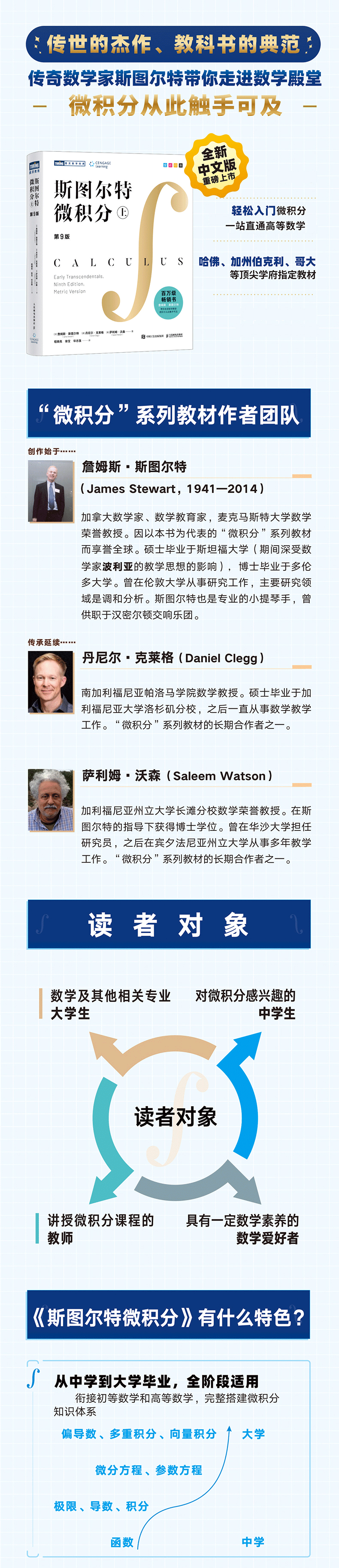 加拿大数学家、数学教育家,麦克马斯特大学数学荣誉教授。因以本书为代表的“微积分”系列教材而享誉全球。硕士毕业于斯坦福大学(期间深受数学家波利亚的教学思想的影响),博士毕业于多伦多大学。曾在伦敦大学从事研究工作,主要研究领域是调和分析。斯图尔特也是专业的小提琴手,曾供职于汉密尔顿交响乐团。