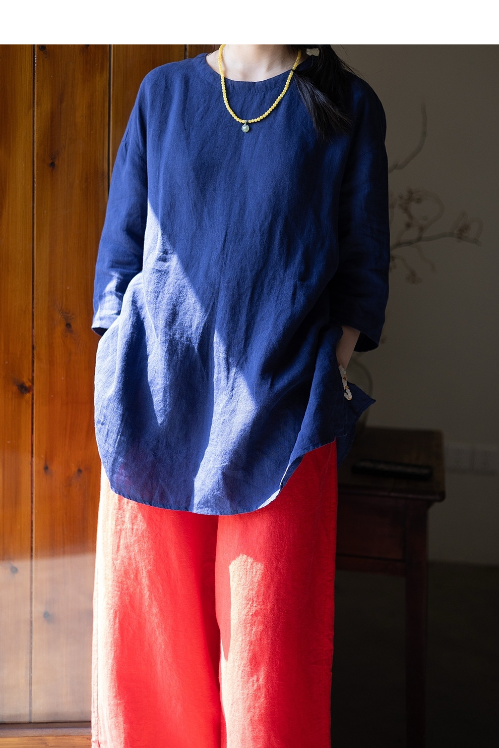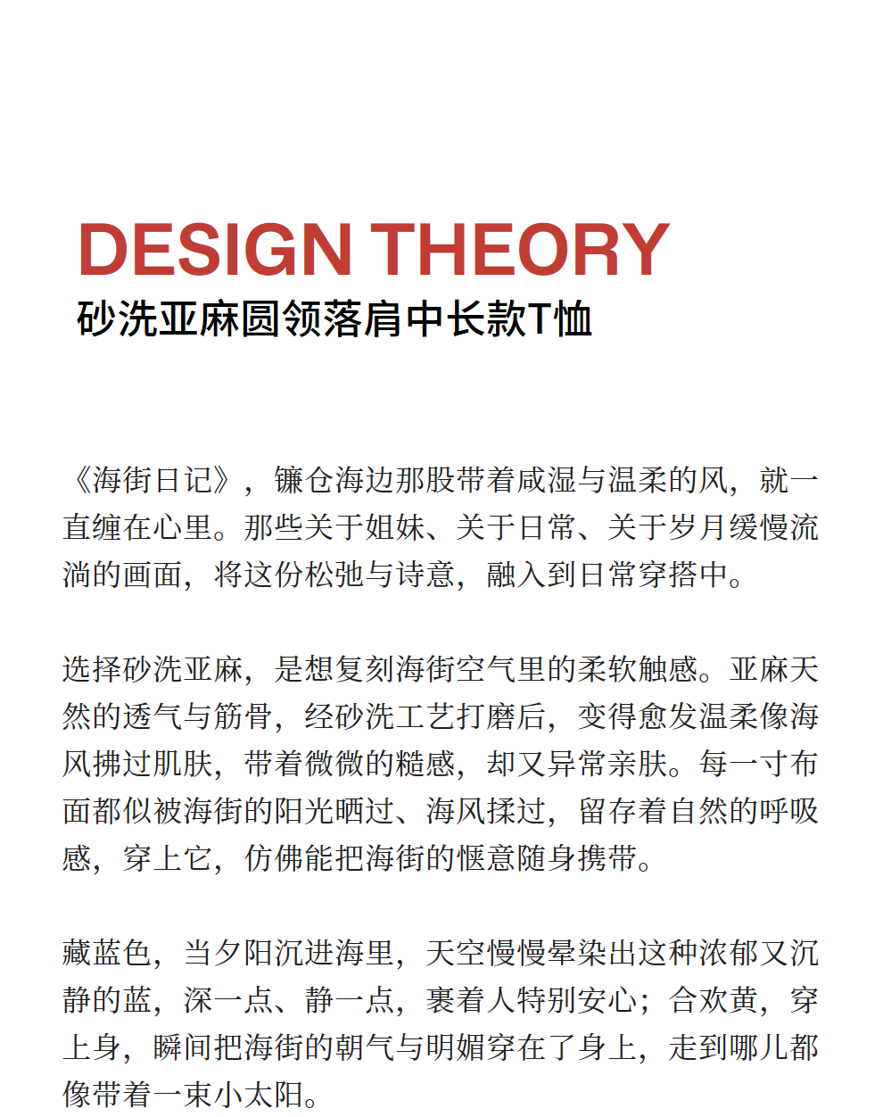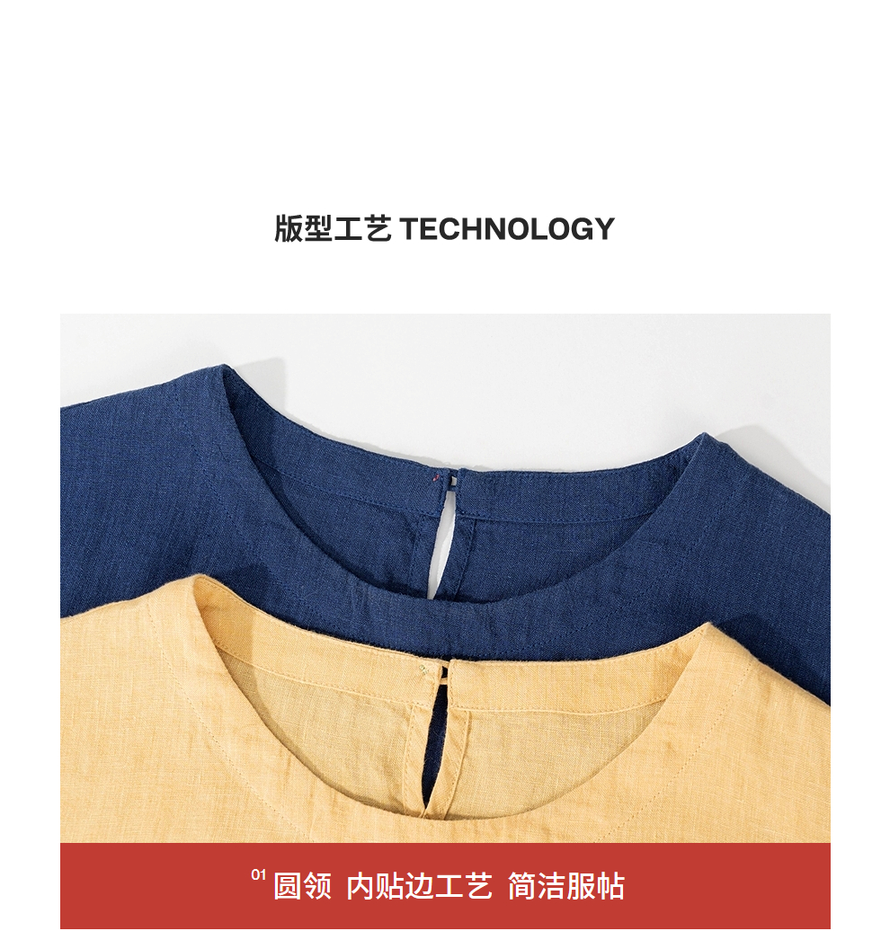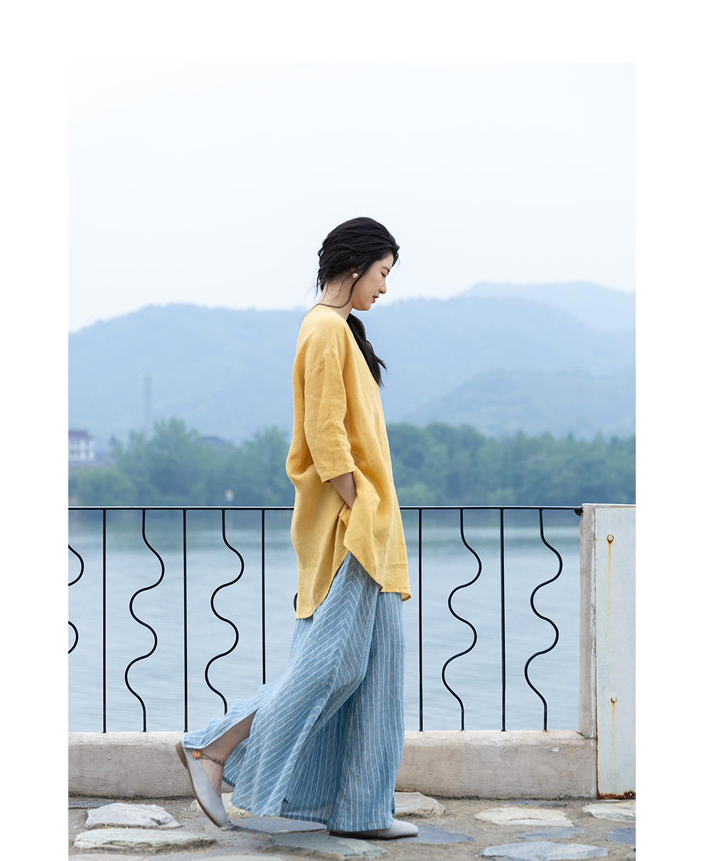 绽放女装339朵/【海街日记】砂洗亚麻圆领落肩七分袖中长款T恤夏