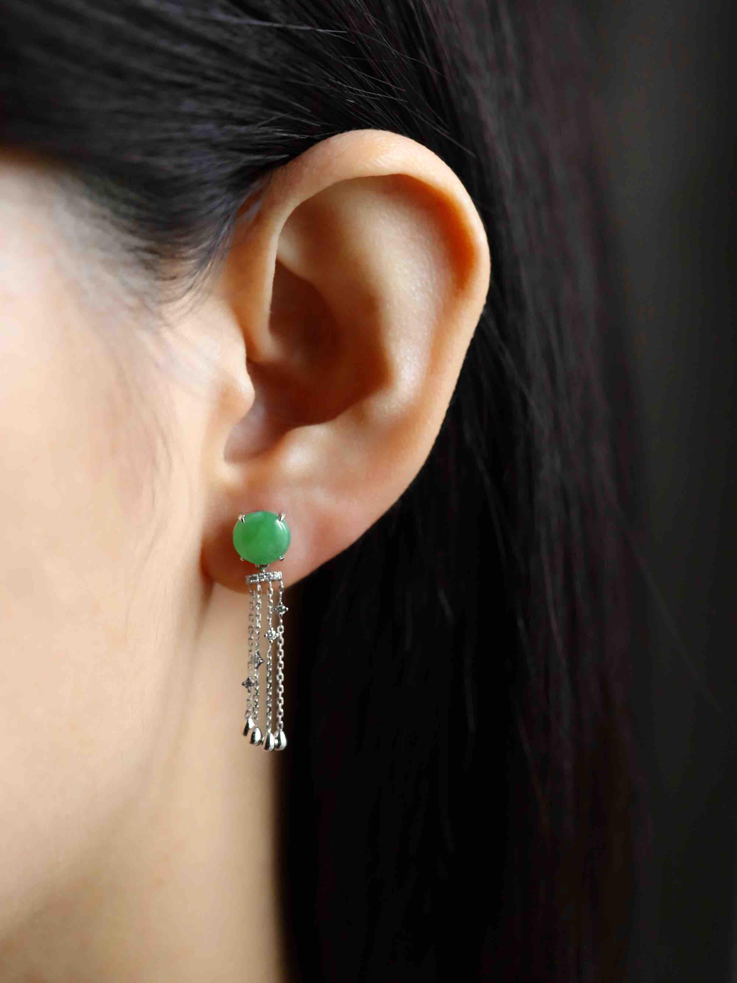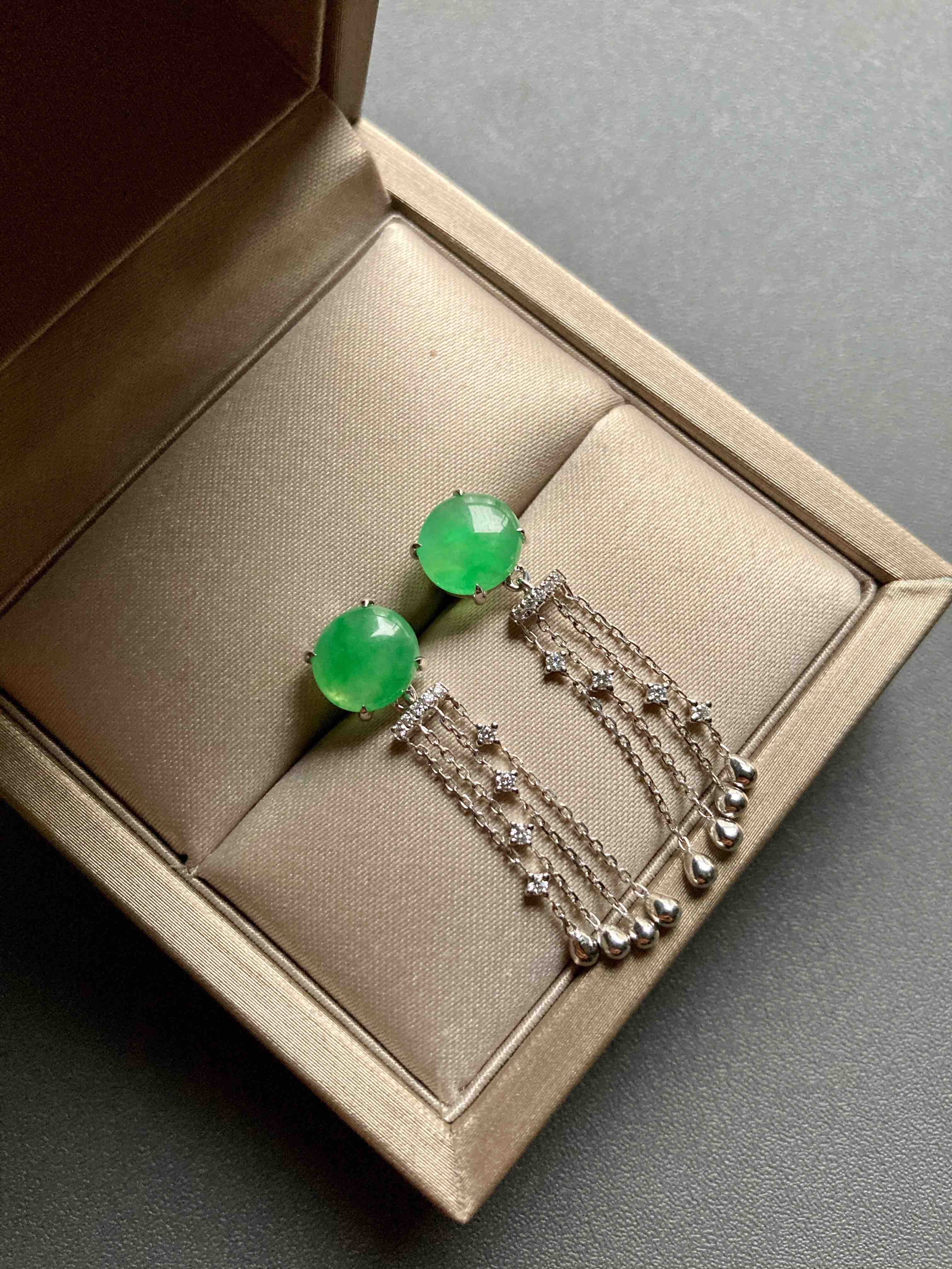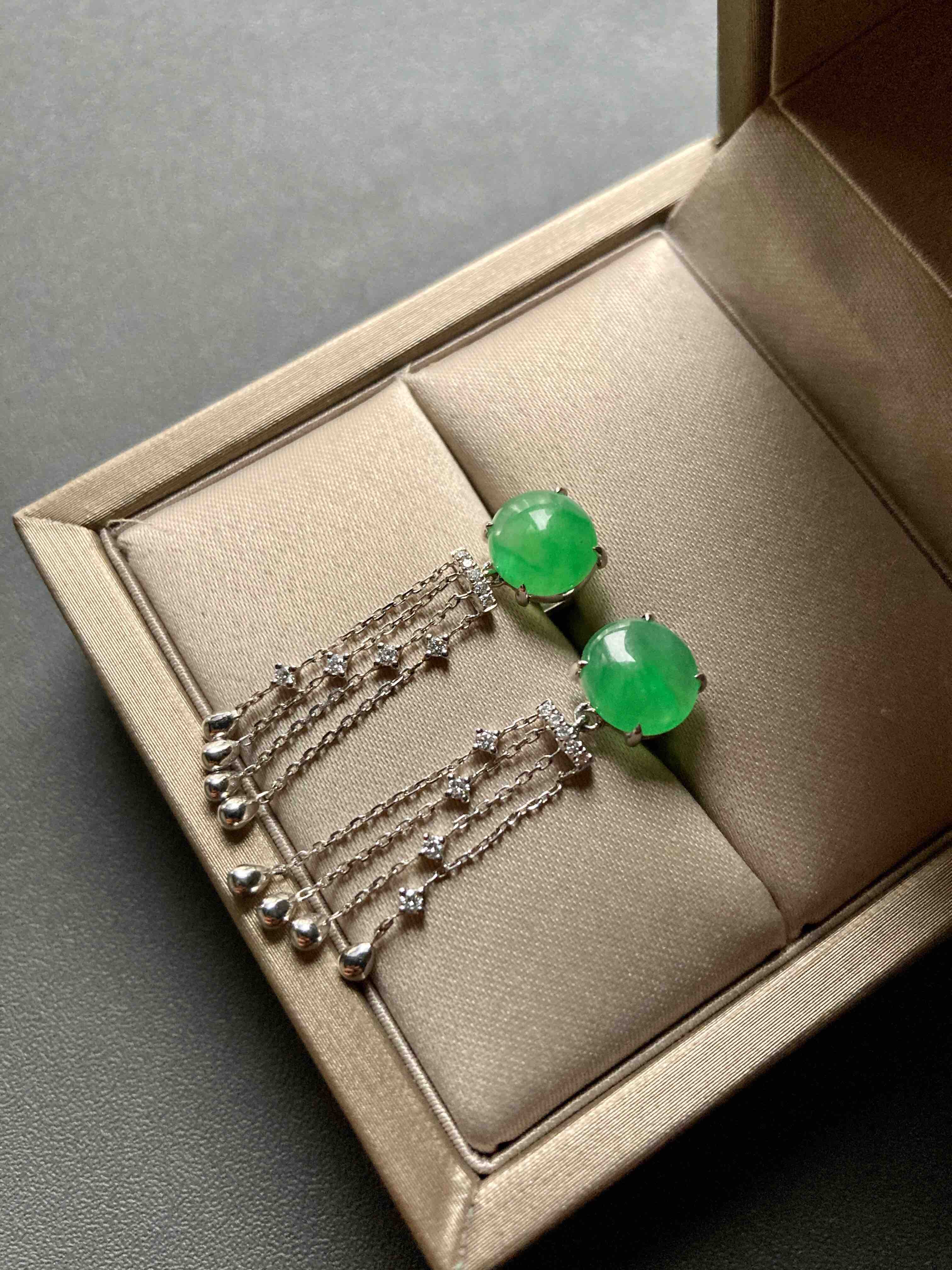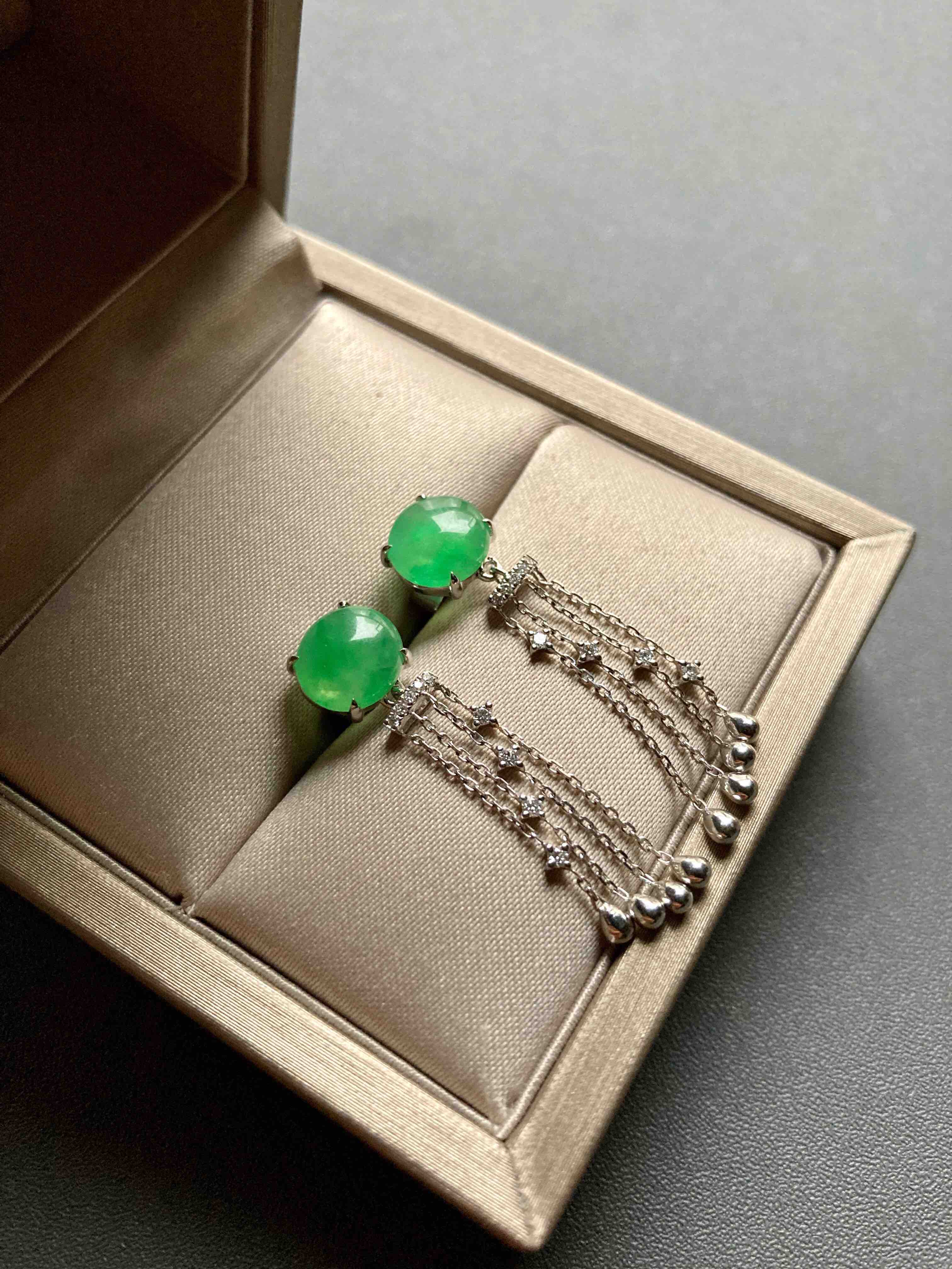 冰种阳绿翡翠蛋面流苏耳坠18k白金钻石镶嵌