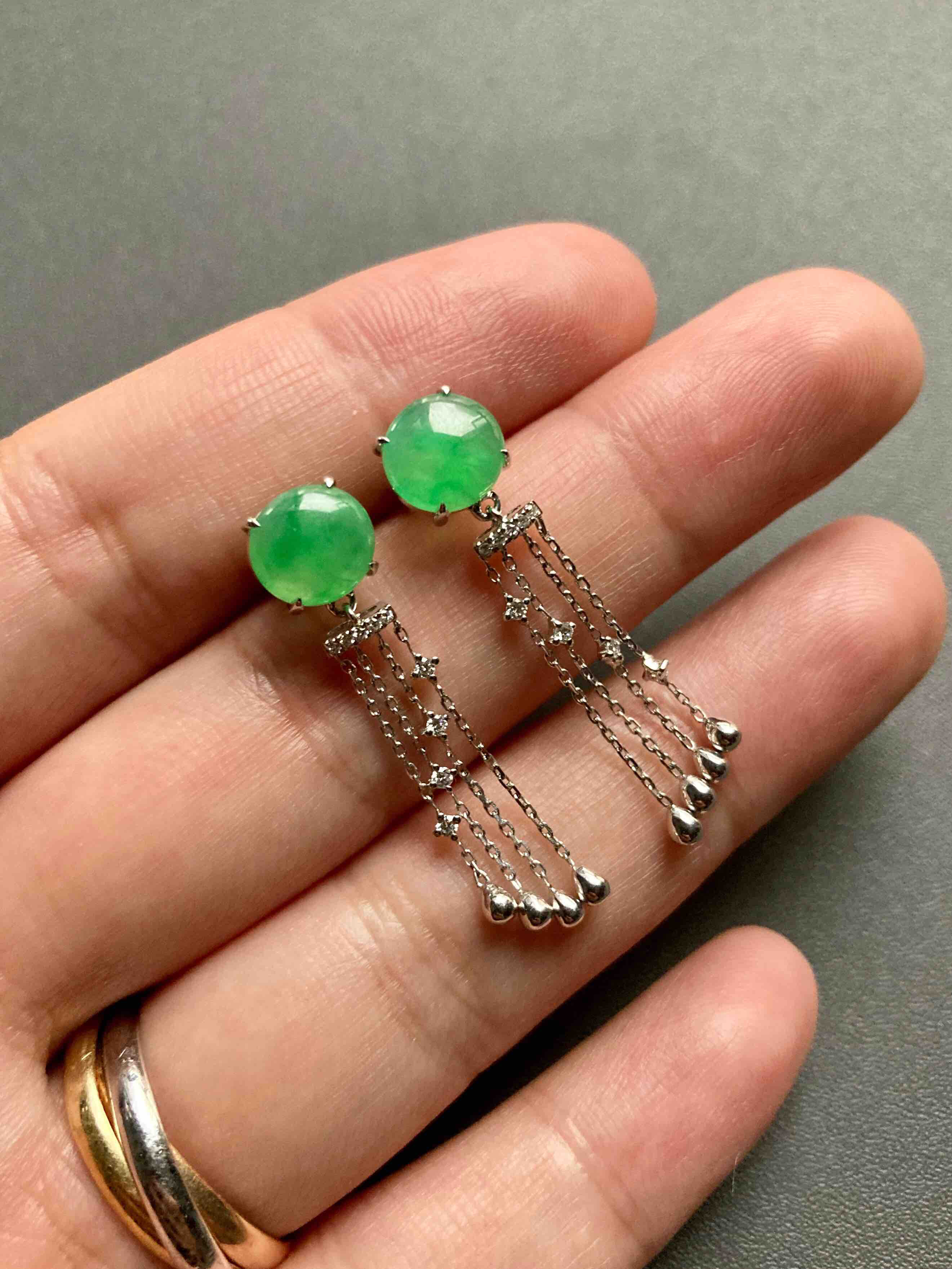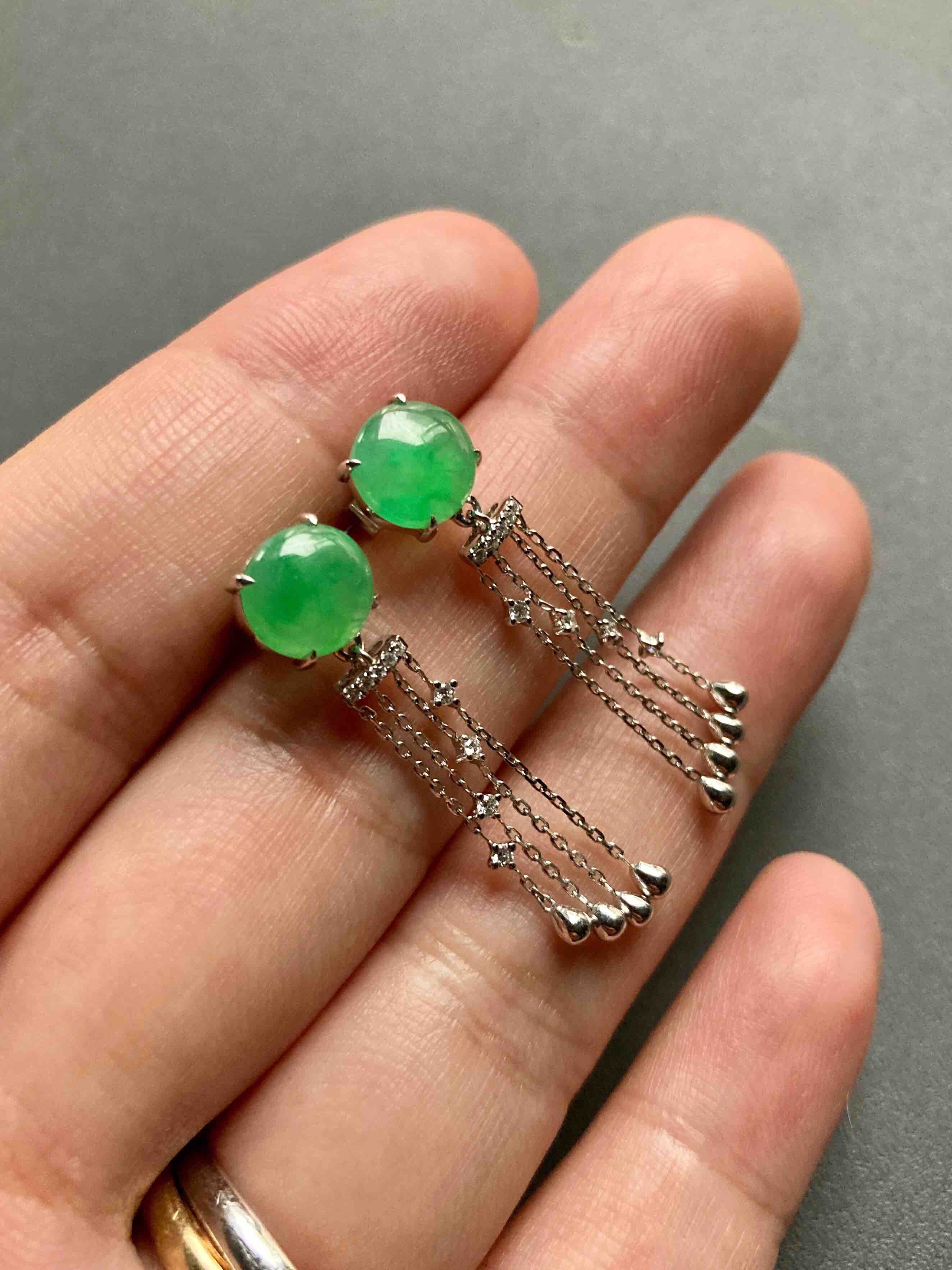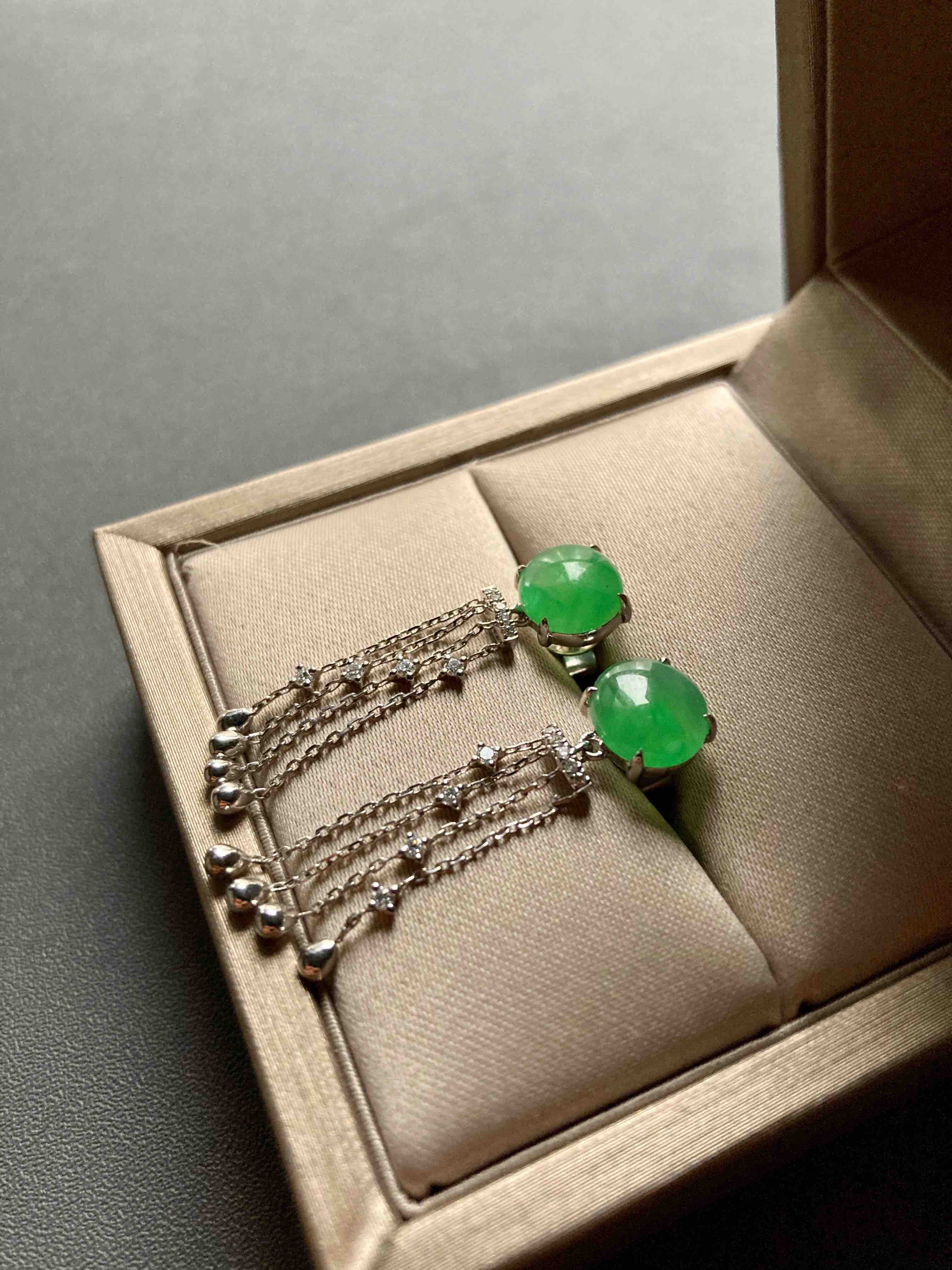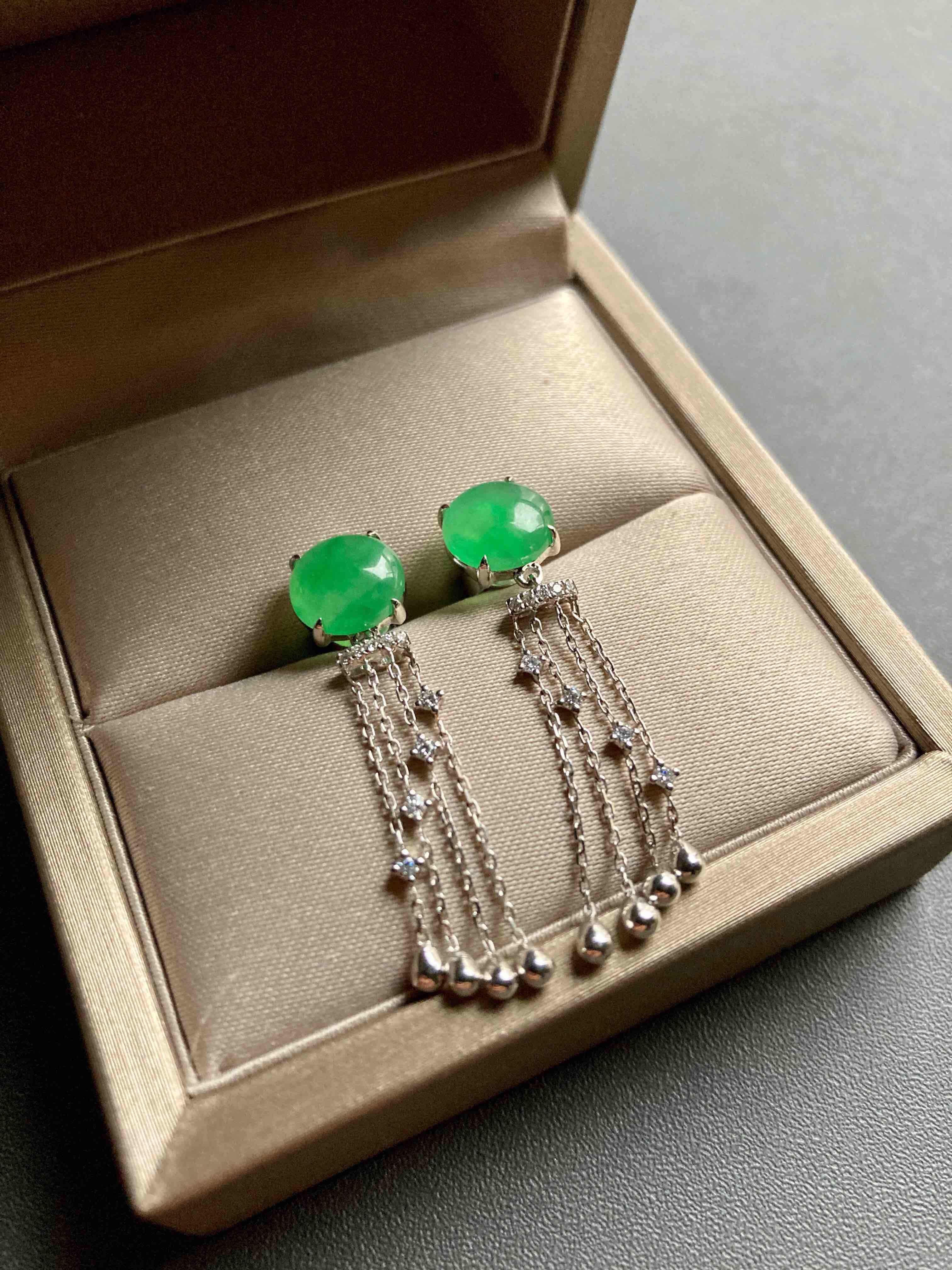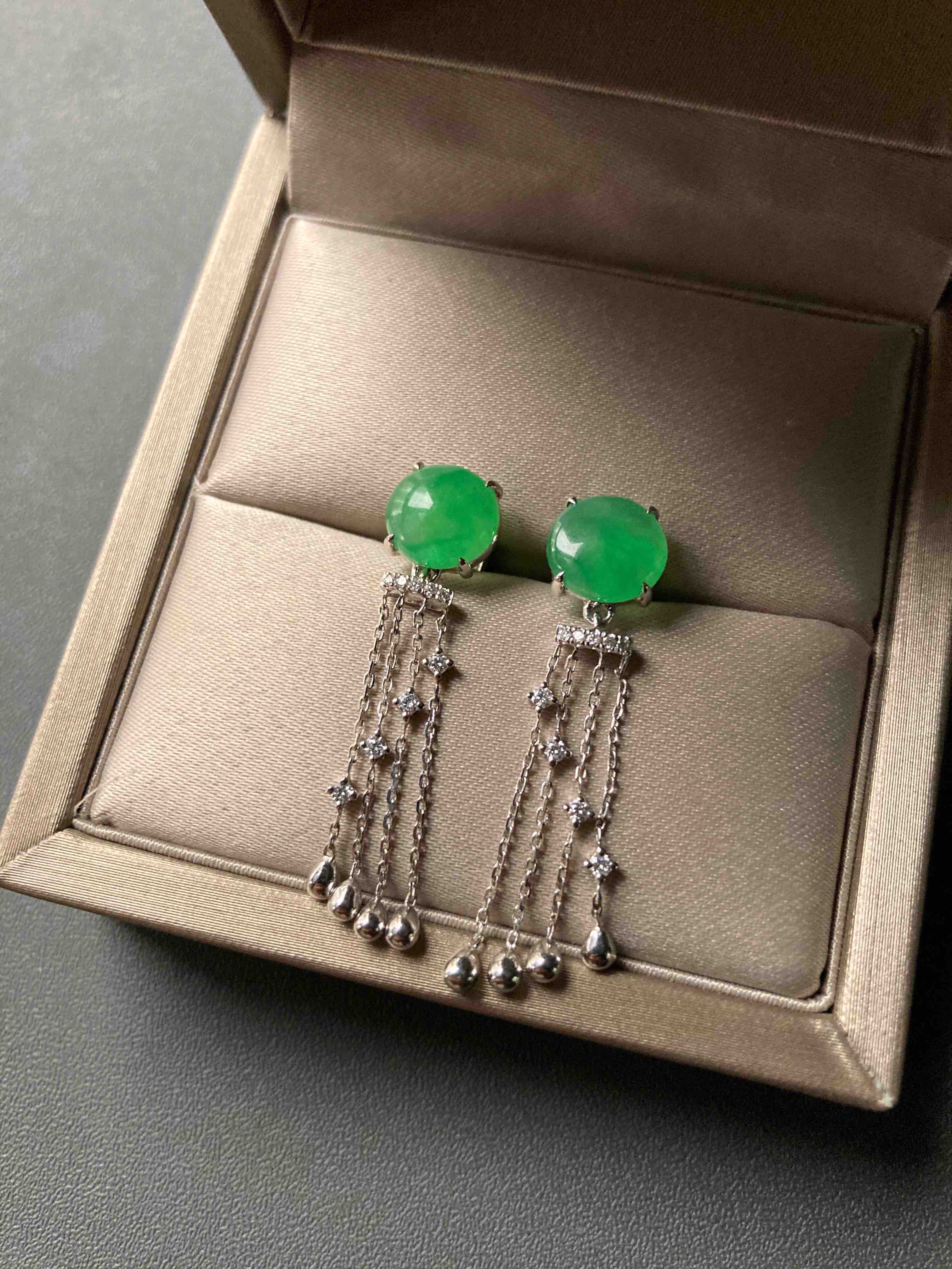 冰种阳绿翡翠蛋面流苏耳坠18k白金钻石镶嵌,翡翠禄来原创设计系列,冰种阳绿翡翠蛋面耳坠,蛋面8×7.9×3mm,18k白金钻石镶嵌,柔美的流苏款式充满了女性的魅力,留意细节,不同长度的流苏组合在一起就像流淌的音符🎶,精品推荐