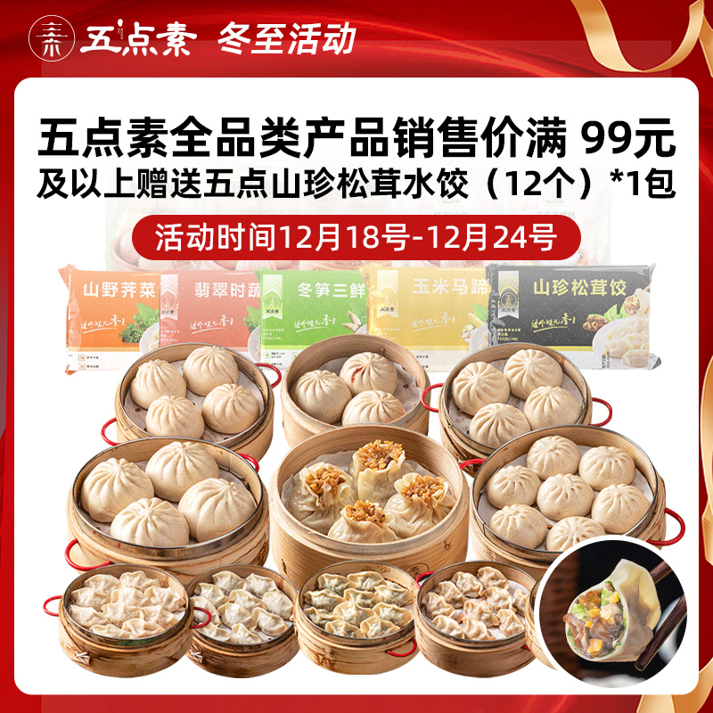 | 五点素[爱心] 冬至活动[福] 岁寒隆冬至,万物始收藏 活动时间⏰:12月18号-12月23号,6天 活动要求:五点素全品类产品销售价满 99元及以上 赠品🎁:五点素山珍松茸水饺🥟(12个)*1包 多买多送[烟花] |