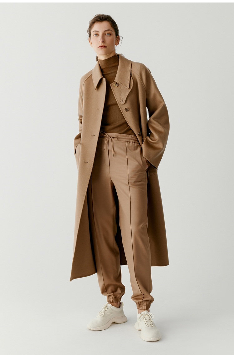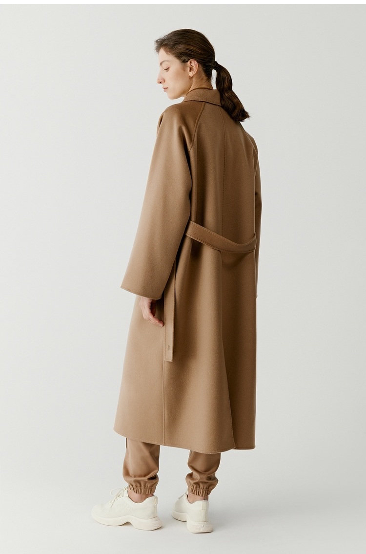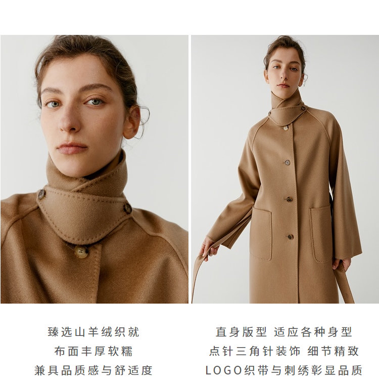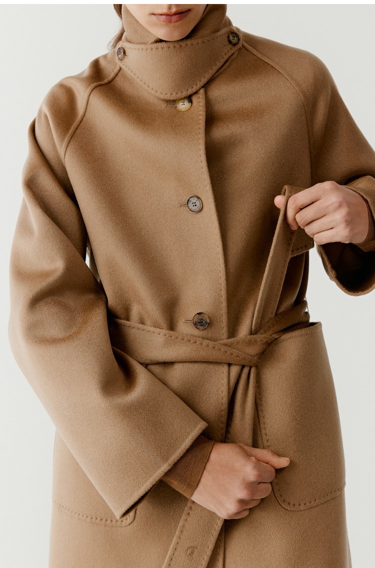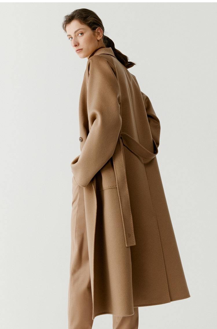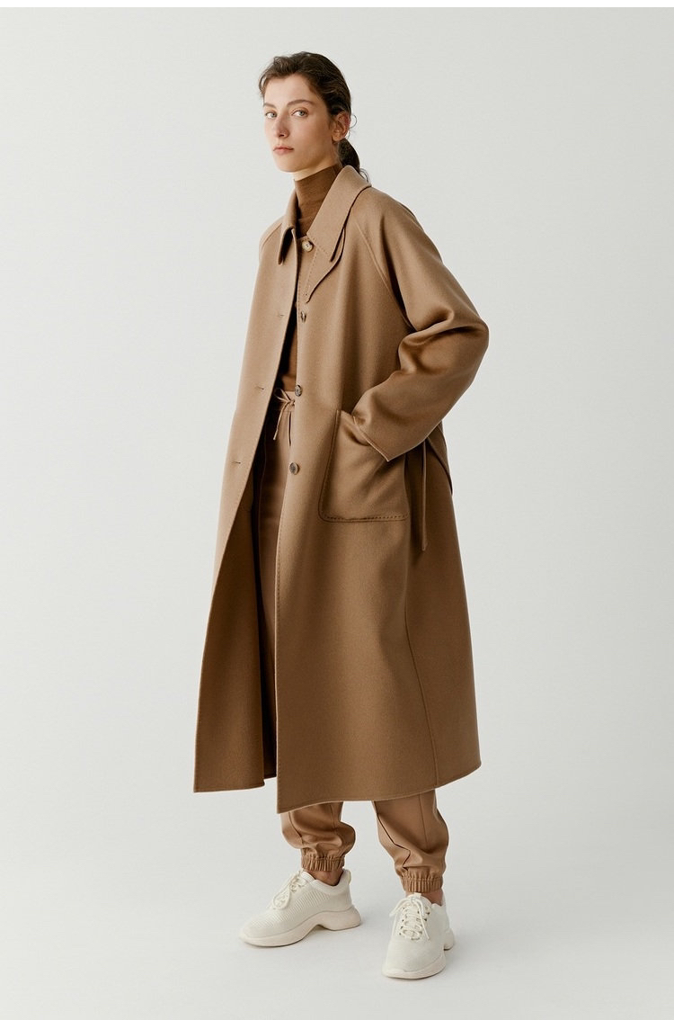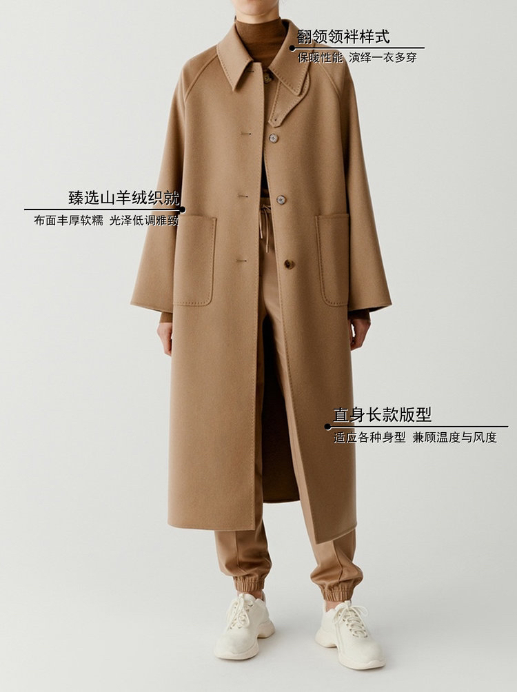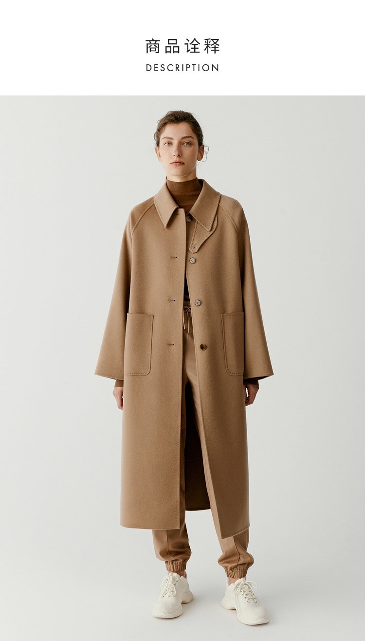 全羊绒轻暖双面呢插肩袖大衣 舒适廓形 简约大气 直身版型 适应各种身型 经典衬衫领 搭配扣袢 多种穿法 光泽低调雅致