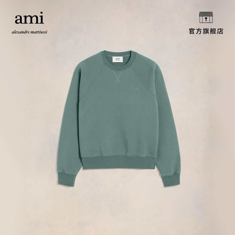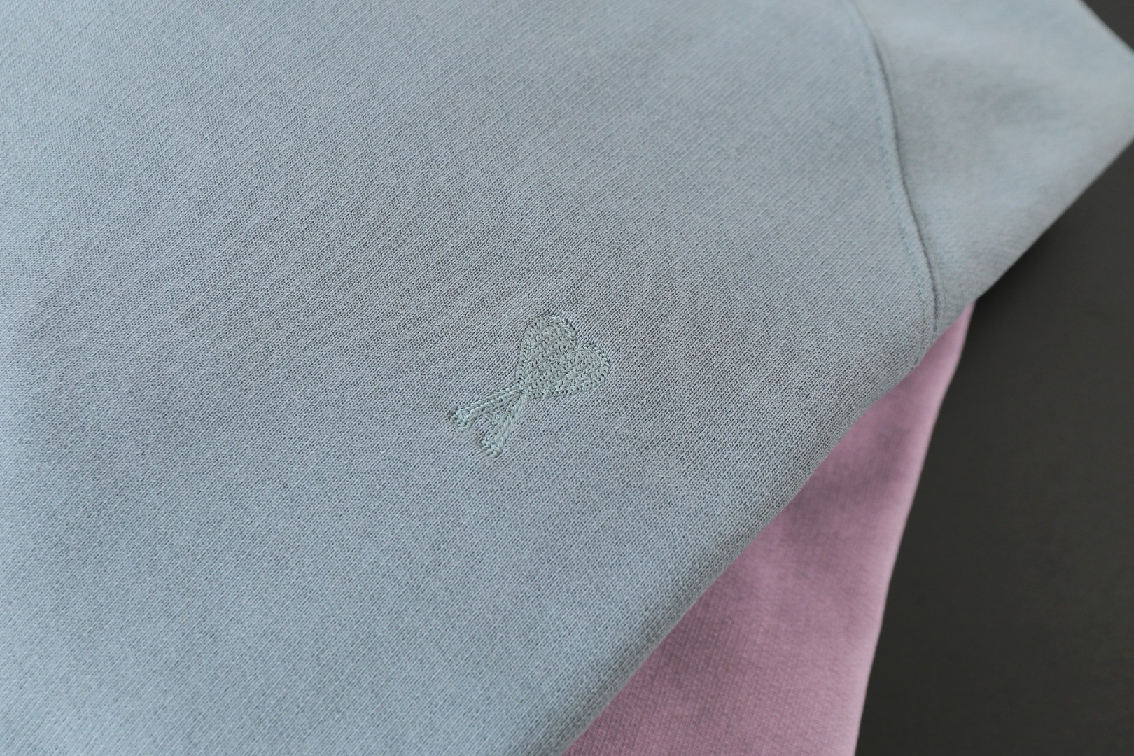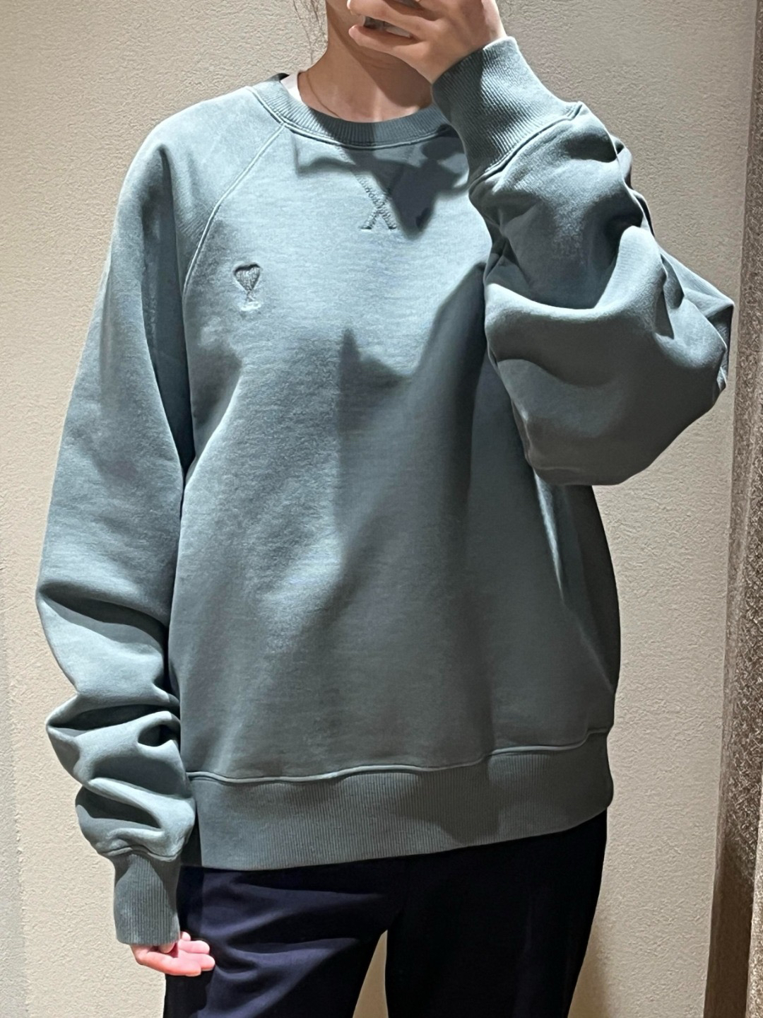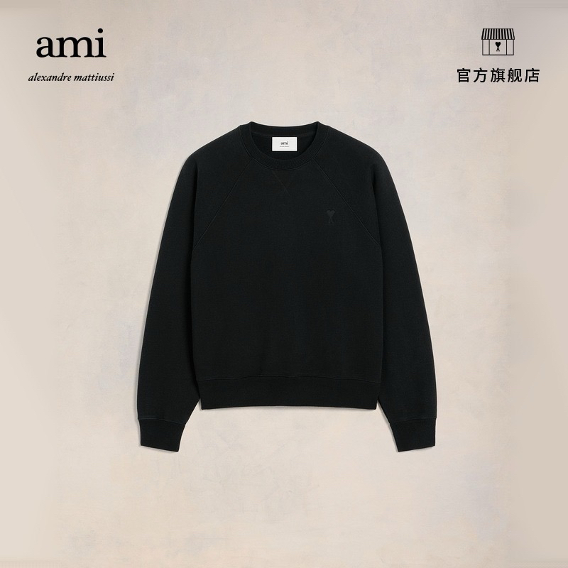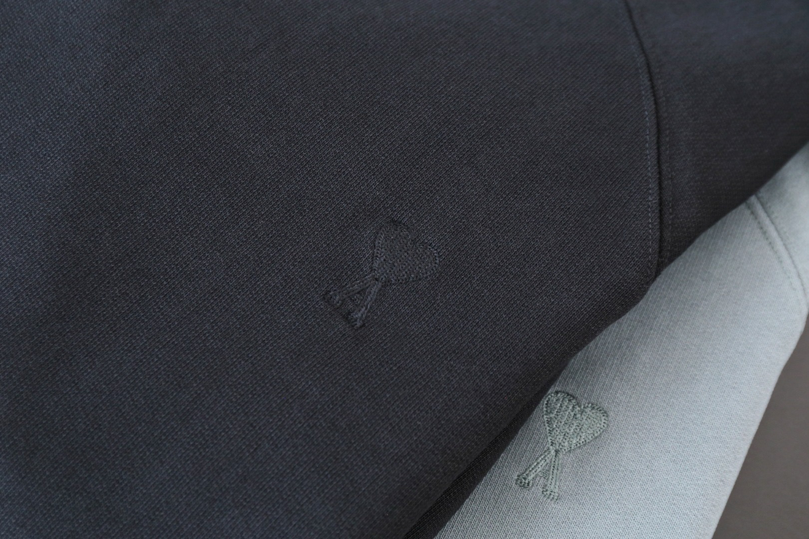 领后绣有AMI标识 极具辨识度,线迹紧密有微凸感,基础万能插肩袖,修饰肩部线条一绝,打造薄肩瘦感