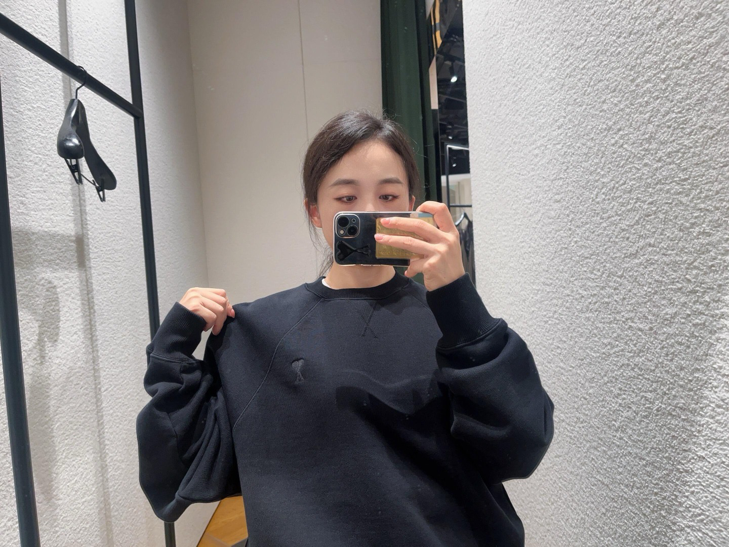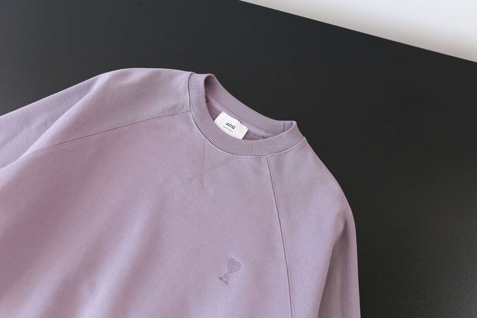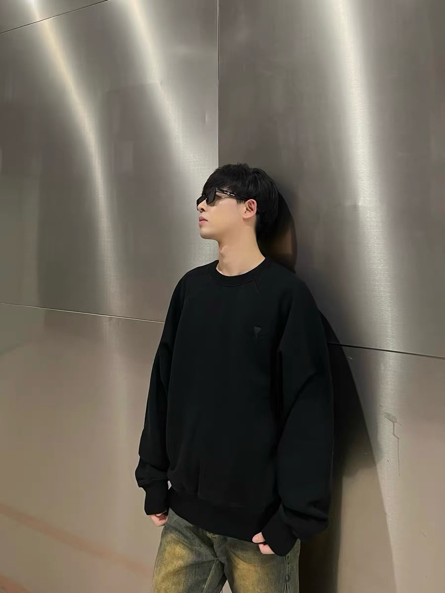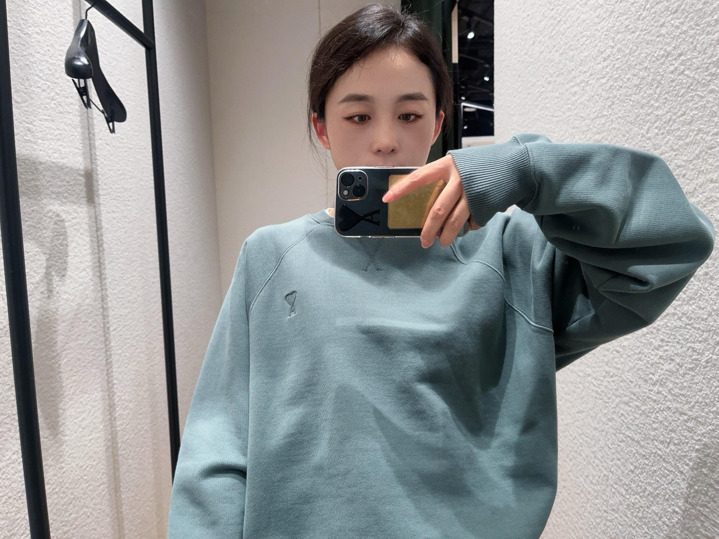 领后绣有AMI标识 极具辨识度,线迹紧密有微凸感,基础万能插肩袖,修饰肩部线条一绝,打造薄肩瘦感