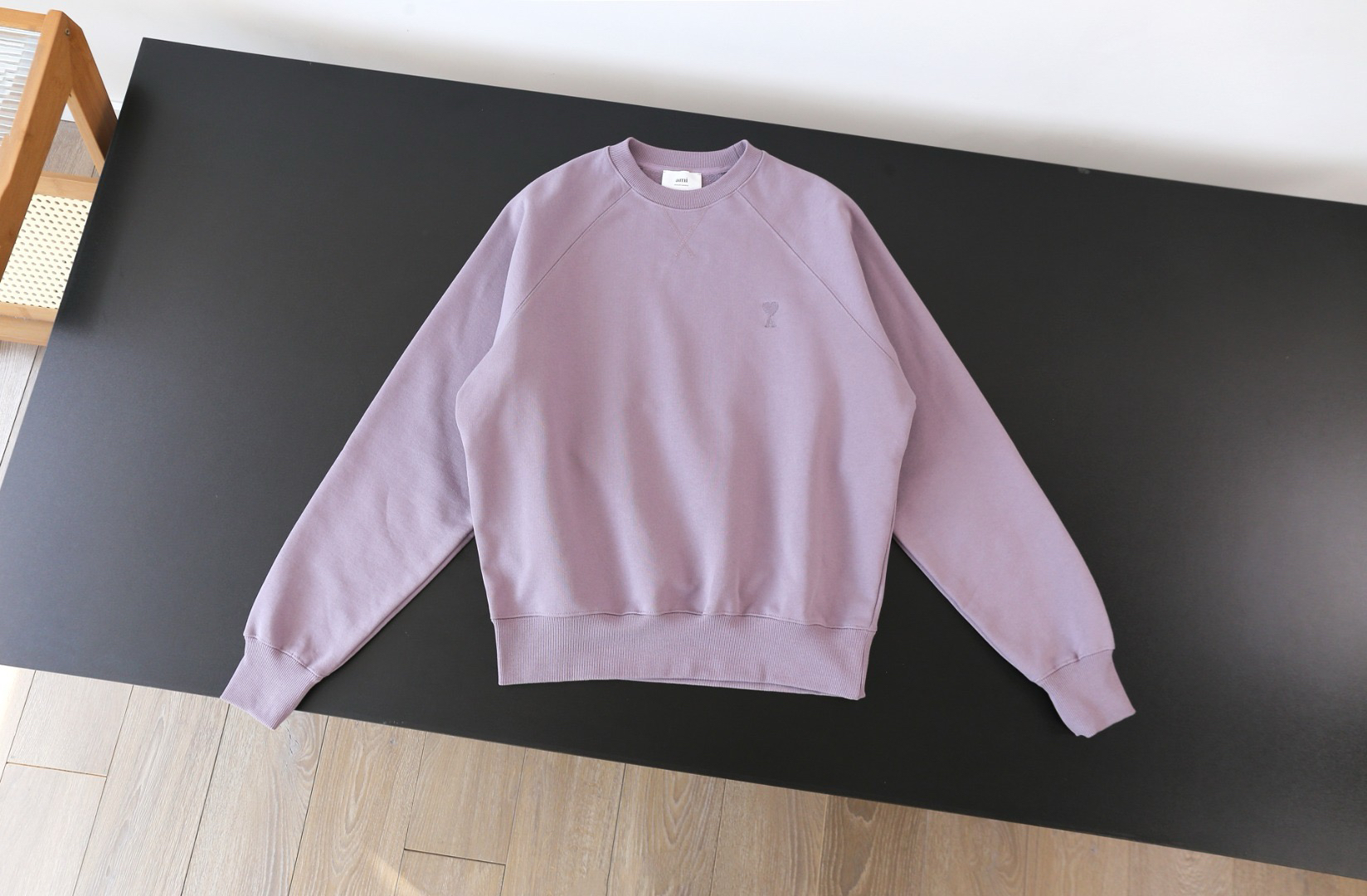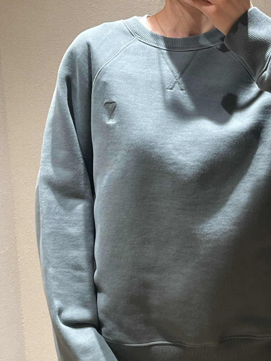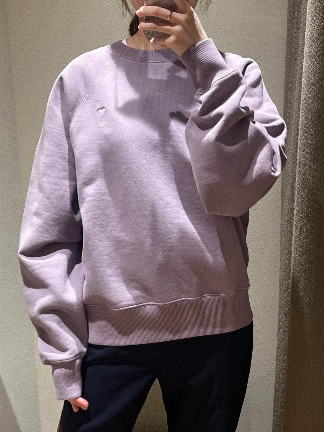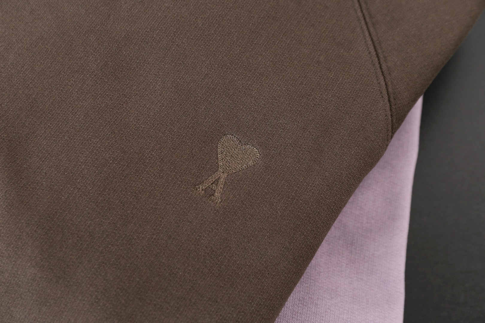 领后绣有AMI标识 极具辨识度,线迹紧密有微凸感,基础万能插肩袖,修饰肩部线条一绝,打造薄肩瘦感