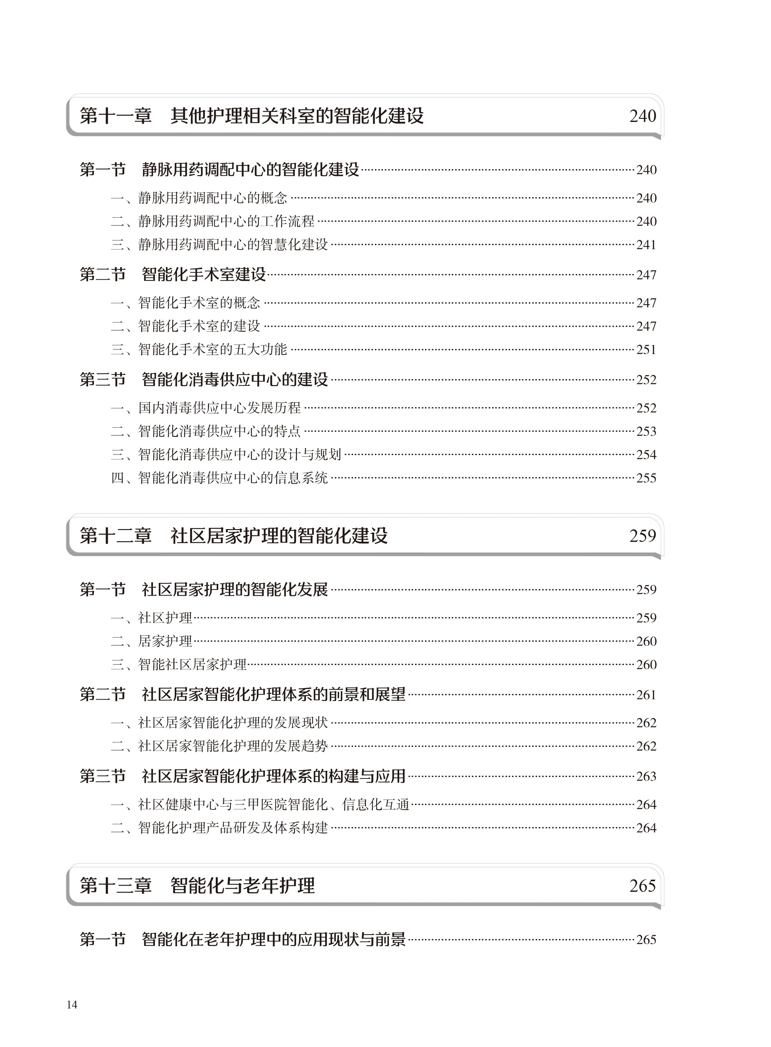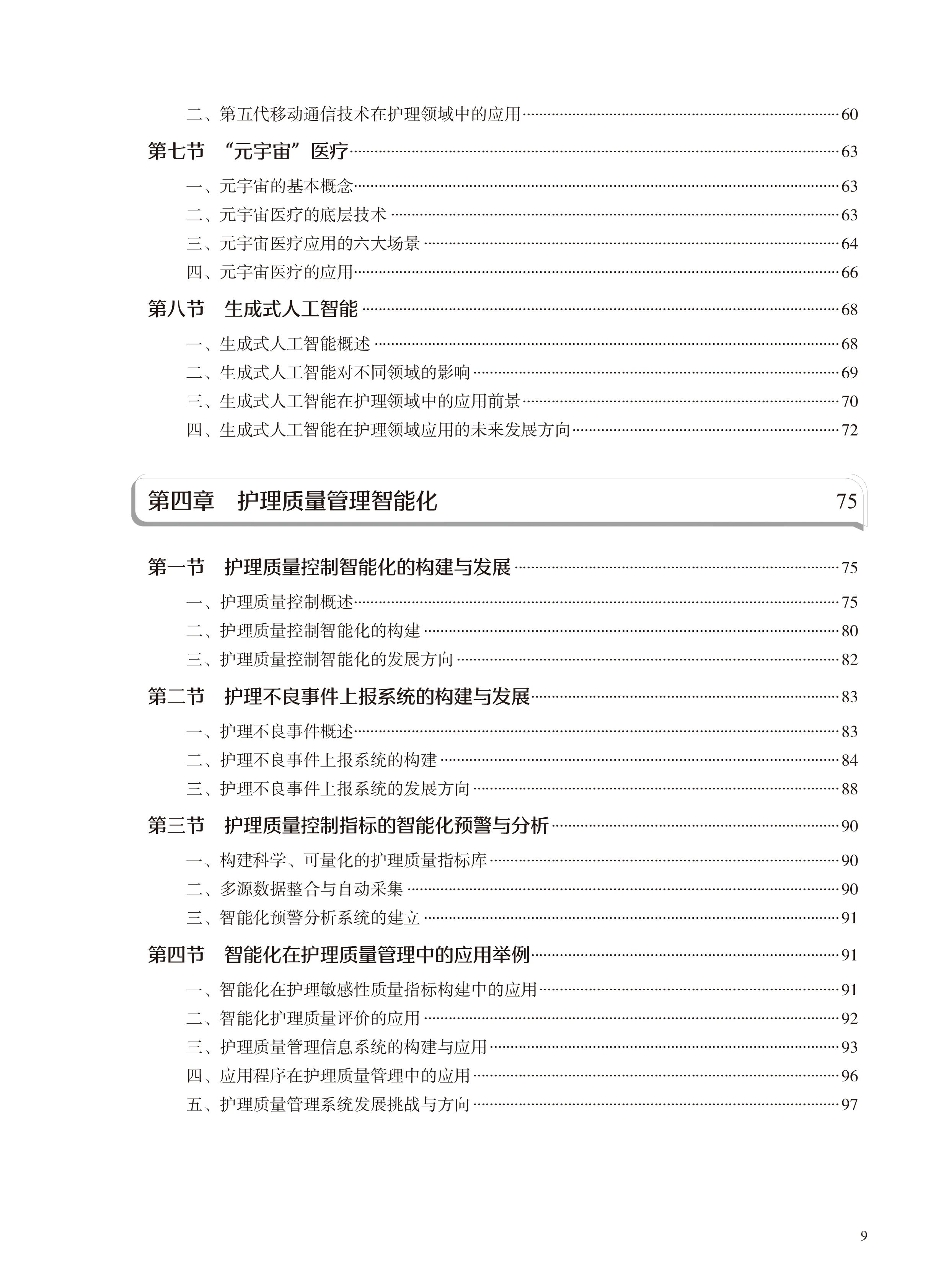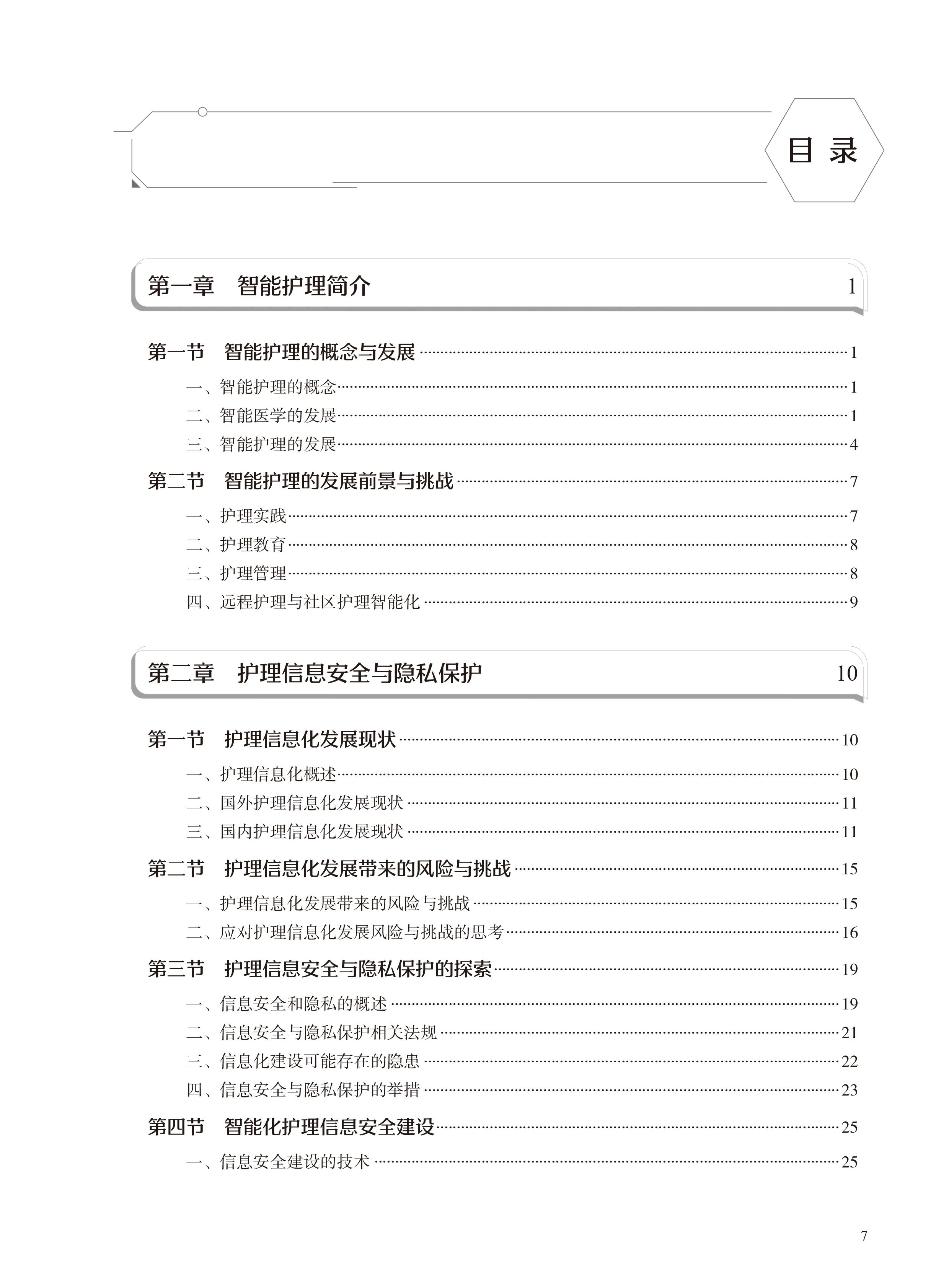 本书首先从智能护理的概念、发展现状开篇,概述智能护理在国内外的起源及现状、展望;同时通过介绍智能护理中常见的信息化技术,让读者对目前临床常见的信息化技术有充分的了解;然后重点叙述智能护理在临床护理、远程护理、社区护理及老年护理方面的应用现状及举例,让读者了解智能护理在护理领域的重要作用;再次,通过介绍智能化门急诊及手术室等相关部门的发展现状、建设过程及应用举例,让读者了解智能化护理的构建过程;最后结合护理相关信息系统举例以及智能化的设备介绍,分析目前智能化护理系统与设备的优势与劣势,以促进智能化建设的进一步提升。