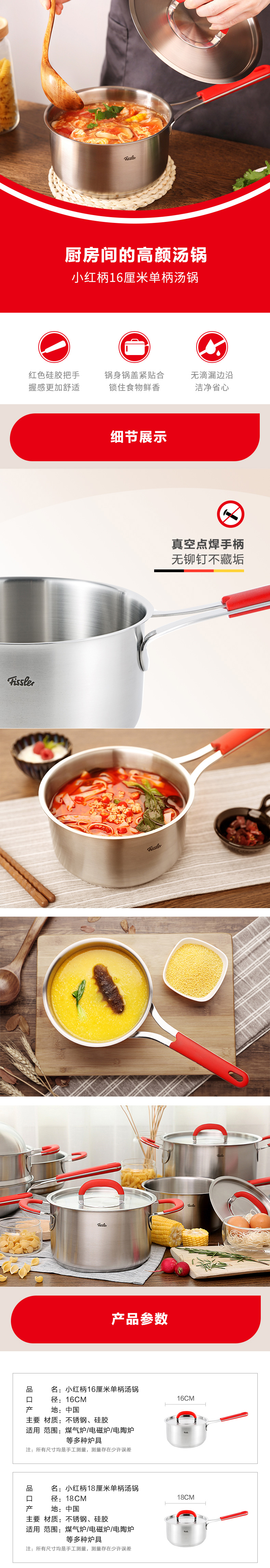 菲仕乐 小红柄16/18厘米单柄汤锅泡面锅