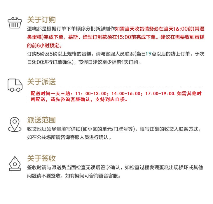 • 保鲜条件: 0-4℃冷藏,收到蛋糕后2小时内食用最佳.